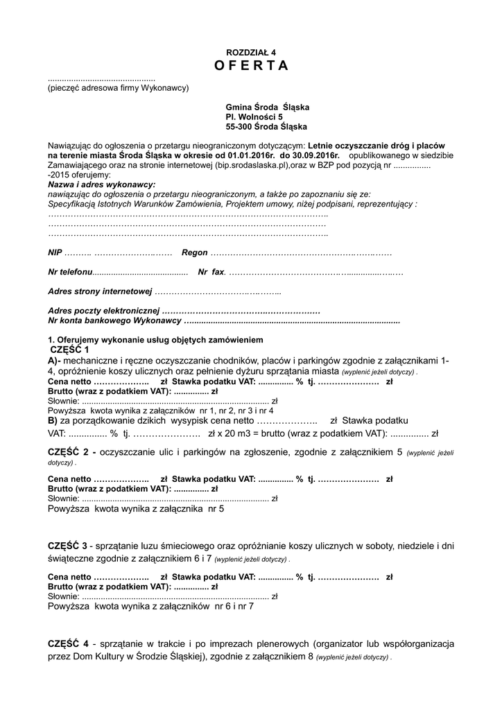 ROZDZIAŁ 4 OFERTA .............................................. (pieczęć adresowa firmy Wykonawcy) Gmina Środa Śląska Pl. Wolności 5 55-300 Środa Śląska Nawiązując do ogłoszenia o przetargu nieograniczonym dotyczącym: Letnie oczyszczanie dróg i placów na terenie miasta Środa Śląska w okresie od 01.01.2016r. do 30.09.2016r. opublikowanego w siedzibie Zamawiającego oraz na stronie internetowej (bip.srodaslaska.pl),oraz w BZP pod pozycją nr ................ -2015 oferujemy: Nazwa i adres wykonawcy: nawiązując do ogłoszenia o przetargu nieograniczonym, a także po zapoznaniu się ze: Specyfikacją Istotnych Warunków Zamówienia, Projektem umowy, niżej podpisani, reprezentujący : ………………………………………………………………………………………. ……………………………………………………………………………………… ………………………………………………………………………………………. NIP ………. ………………….…… Regon …………………………………………….…….…… Nr telefonu......................................... Nr fax. ………………………………….…..............…..… Adres strony internetowej …………………………….….…….. Adres poczty elektronicznej ………………………………..…………….… Nr konta bankowego Wykonawcy …......................................................................................... 1. Oferujemy wykonanie usług objętych zamówieniem CZĘŚĆ 1 A)- mechaniczne i ręczne oczyszczanie chodników, placów i parkingów zgodnie z załącznikami 14, opróżnienie koszy ulicznych oraz pełnienie dyżuru sprzątania miasta (wyplenić jeżeli dotyczy) . Cena netto ……………….. zł Stawka podatku VAT: ............... % tj. …………………. zł Brutto (wraz z podatkiem VAT): ............... zł Słownie: ................................................................................ zł Powyższa kwota wynika z załączników nr 1, nr 2, nr 3 i nr 4 B) za porządkowanie dzikich wysypisk cena netto ……………….. zł Stawka podatku VAT: ............... % tj. …………………. zł x 20 m3 = brutto (wraz z podatkiem VAT): ............... zł CZĘŚĆ 2 - oczyszczanie ulic i parkingów na zgłoszenie, zgodnie z załącznikiem 5 (wyplenić jeżeli dotyczy) . Cena netto ……………….. zł Stawka podatku VAT: ............... % tj. …………………. zł Brutto (wraz z podatkiem VAT): ............... zł Słownie: ................................................................................ zł Powyższa kwota wynika z załącznika nr 5 CZĘŚĆ 3 - sprzątanie luzu śmieciowego oraz opróżnianie koszy ulicznych w soboty, niedziele i dni świąteczne zgodnie z załącznikiem 6 i 7 (wyplenić jeżeli dotyczy) . Cena netto ……………….. zł Stawka podatku VAT: ............... % tj. …………………. zł Brutto (wraz z podatkiem VAT): ............... zł Słownie: ................................................................................ zł Powyższa kwota wynika z załączników nr 6 i nr 7 CZĘŚĆ 4 - sprzątanie w trakcie i po imprezach plenerowych (organizator lub współorganizacja przez Dom Kultury w Środzie Śląskiej), zgodnie z załącznikiem 8 (wyplenić jeżeli dotyczy) . Cena netto ……………….. zł Stawka podatku VAT: ............... % tj. …………………. zł Brutto (wraz z podatkiem VAT): ............... zł Słownie: ................................................................................ zł Powyższa kwota wynika z załącznika nr 8 Całkowita wartość zamówienia brutto …….................................... 2. Przedmiot zamówienia wykonamy w terminie:od dnia 01.01.2016r. do dnia 30.09.2016r. 3. Oświadczamy, że zapoznaliśmy się ze specyfikacją istotnych warunków zamówienia i nie wnosimy do niej zastrzeżeń oraz zdobyliśmy konieczne informacje do przygotowania oferty. 4. Oświadczamy, że uważamy się za związanych niniejszą ofertą na czas wskazany w Specyfikacji Istotnych Warunkach Zamówienia. 5. Oświadczamy, że wykonamy przedmiot zamówienia zgodnie z zasadami współczesnej wiedzy technicznej, normami i obowiązującymi przepisami. 6. Oświadczamy, że następujące usługi: – .............................................................................................................................. zostaną wykonane przez następujących podwykonawców: – .............................................................................................................................. 7. Oświadczamy, pouczony o odpowiedzialności karnej wynikającej z art. 297 § 1 Kk, że wszystkie złożone do oferty dokumenty i oświadczenia są prawdziwe. 8. Oświadczamy, że zawarty w Specyfikacji Istotnych Warunków Zamówienia projekty umów zostały przez nas zaakceptowany i zobowiązujemy się w przypadku wyboru naszej oferty do zawarcia umowy na wyżej wymienionych warunkach w miejscu i terminie wyznaczonym przez Zamawiającego. 9. Załącznikami do niniejszej oferty są: ...................................................... ...................................................… 10. Osobą upoważnioną do reprezentacji oraz dokonywania wszelkich czynności związanych z realizacją niniejszego zamówienia jest imię i nazwisko ………………………………………….. tel. ……………………………………………………. e-mail ………………………………………………... Podpisano: Miejsce i data: ........................................ 2015 r. ....................................................... (czytelny podpis i pieczęć Wykonawcy)