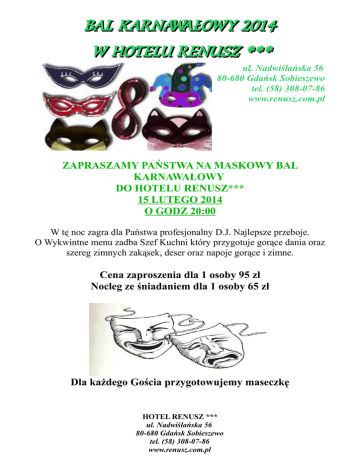 BAL KARNAWAŁOWY 2014 W HOTELU RENUSZ *** ul. Nadwiślańska 56 80-680 Gdańsk Sobieszewo tel. (58) 308-07-86 www.renusz.com.pl ZAPRASZAMY PAŃSTWA NA MASKOWY BAL KARNAWAŁOWY DO HOTELU RENUSZ*** 15 LUTEGO 2014 O GODZ 20:00 W tę noc zagra dla Państwa profesjonalny D.J. Najlepsze przeboje. O Wykwintne menu zadba Szef Kuchni który przygotuje gorące dania oraz szereg zimnych zakąsek, deser oraz napoje gorące i zimne. Cena zaproszenia dla 1 osoby 95 zł Nocleg ze śniadaniem dla 1 osoby 65 zł Dla każdego Gościa przygotowujemy maseczkę HOTEL RENUSZ *** ul. Nadwiślańska 56 80-680 Gdańsk Sobieszewo tel. (58) 308-07-86 www.renusz.com.pl Menu balu karnawałowego Poczęstunek 20:00 Aperitif Kolacja 20:30 Filet z kurczaka faszerowany suszonymi pomidorami ze szpinakiem i serem mozzarellą Ziemniaczki opiekane Surówka z kapusty pekińskiej z sosem ogrodowym Zakąski zimne: Schab po warszawsku z puszystym chrzanem Befsztyk tatarski z żółtkiem cebulką i grzybkami marynowanymi Indyk w maladze Pasztet z żurawiną Tymbaliki drobiowe Śledź tradycyjny Sałatka z tuńczykiem Sałatka tradycyjna Pieczywo, masło Danie gorące 01:00 Boeuf strogonow Na słodko bufet Ciasto Kawa z mleczkiem Herbata z cytryną 1l napoju na osobę Woda z cytryną i soki
