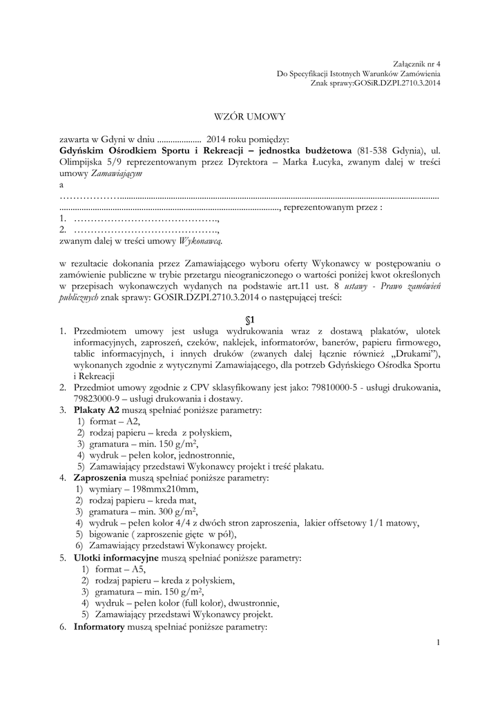 Załącznik nr 4 Do Specyfikacji Istotnych Warunków Zamówienia Znak sprawy:GOSiR.DZPI.2710.3.2014 WZÓR UMOWY zawarta w Gdyni w dniu .................... 2014 roku pomiędzy: Gdyńskim Ośrodkiem Sportu i Rekreacji – jednostka budżetowa (81-538 Gdynia), ul. Olimpijska 5/9 reprezentowanym przez Dyrektora – Marka Łucyka, zwanym dalej w treści umowy Zamawiającym a ………………................................................................................................................................................ ..................................................................................................., reprezentowanym przez : 1. ……………………………………., 2. ……………………………………., zwanym dalej w treści umowy Wykonawcą. w rezultacie dokonania przez Zamawiającego wyboru oferty Wykonawcy w postępowaniu o zamówienie publiczne w trybie przetargu nieograniczonego o wartości poniżej kwot określonych w przepisach wykonawczych wydanych na podstawie art.11 ust. 8 ustawy - Prawo zamówień publicznych znak sprawy: GOSIR.DZPI.2710.3.2014 o następującej treści: §1 1. Przedmiotem umowy jest usługa wydrukowania wraz z dostawą plakatów, ulotek informacyjnych, zaproszeń, czeków, naklejek, informatorów, banerów, papieru firmowego, tablic informacyjnych, i innych druków (zwanych dalej łącznie również „Drukami”), wykonanych zgodnie z wytycznymi Zamawiającego, dla potrzeb Gdyńskiego Ośrodka Sportu i Rekreacji 2. Przedmiot umowy zgodnie z CPV sklasyfikowany jest jako: 79810000-5 - usługi drukowania, 79823000-9 – usługi drukowania i dostawy. 3. Plakaty A2 muszą spełniać poniższe parametry: 1) format – A2, 2) rodzaj papieru – kreda z połyskiem, 3) gramatura – min. 150 g/m2, 4) wydruk – pełen kolor, jednostronnie, 5) Zamawiający przedstawi Wykonawcy projekt i treść plakatu. 4. Zaproszenia muszą spełniać poniższe parametry: 1) wymiary – 198mmx210mm, 2) rodzaj papieru – kreda mat, 3) gramatura – min. 300 g/m2, 4) wydruk – pełen kolor 4/4 z dwóch stron zaproszenia, lakier offsetowy 1/1 matowy, 5) bigowanie ( zaproszenie gięte w pół), 6) Zamawiający przedstawi Wykonawcy projekt. 5. Ulotki informacyjne muszą spełniać poniższe parametry: 1) format – A5, 2) rodzaj papieru – kreda z połyskiem, 3) gramatura – min. 150 g/m2, 4) wydruk – pełen kolor (full kolor), dwustronnie, 5) Zamawiający przedstawi Wykonawcy projekt. 6. Informatory muszą spełniać poniższe parametry: 1 Załącznik nr 4 Do Specyfikacji Istotnych Warunków Zamówienia Znak sprawy:GOSiR.DZPI.2710.3.2014 1) format – 3x DL – składany w U, 2) rodzaj papieru – papier kreda dwustronny z połyskiem, 3) gramatura – min. 300 g/m2, 4) wydruk – offsetowy CTP, 5/5 (CMYK + Pantone), 5) uszlachetnienie – lakier, 6) prace introligatorskie – cięcie do formatu i składanie, 7) Zamawiający przedstawi Wykonawcy projekt. 7. Zdjęcia wielkoformatowe muszą spełniać poniższe parametry: 1) format – różne formaty: Zamawiający przewiduje zamówienie: a) o wymiarach 120cmx50cm, b) o wymiarach 100cmx50cm, c) o wymiarach 110cmx60cm, d) o wymiarach 90cmx90cm, e) o wymiarach 90cmx60cm, f) o wymiarach 70cmx70, g) o wymiarach 50cmx50cm, h) Zamawiający zgodnie z jego potrzebami przewiduje możliwość zmiany ilości zamawianych wymiarów zdjęć, o których mowa powyżej, w ramach ogólnej ilości zdjęć tj. 50 sztuk, 2) rodzaj papieru – papier fotograficzny, 3) gramatura – min. 300 g/m2, 4) wydruk – druk do wyboru mat lub/i błysk. 8. Dyplomy okolicznościowe muszą spełniać poniższe parametry: 1) format – A4 2) rodzaj papieru – kreda mat, 3) gramatura – min. 170 g/m2, 4) wydruk – pełen kolor, 5) Zamawiający przedstawi Wykonawcy projekt. 9. Teczki tekturowe muszą spełniać poniższe parametry: 1) format – A4, 2) rodzaj papieru – kreda mat, 3) gramatura – min. 300 g/m2, 4) wydruk – pełen kolor, 5) prace introligatorskie – bigowanie, 6) Zamawiający przedstawi Wykonawcy projekt. 10. Papier firmowy musi spełniać poniższe parametry: 1) format – A4, 2) rodzaj papieru – papier do drukarek, 3) gramatura – min. 80 g/m2, 4) wydruk – mat, 5) Zamawiający przedstawi Wykonawcy projekt papieru firmowego. 11. Papier firmowy okolicznościowy musi spełniać poniższe parametry: 1) format – A4, 2) rodzaj papieru – papier do drukarek, 3) gramatura – min. 150 g/m2, 4) wydruk – mat, 5) Zamawiający przedstawi Wykonawcy projekt. Koperty firmowe muszą spełniać poniższe parametry: 12. 2 Załącznik nr 4 Do Specyfikacji Istotnych Warunków Zamówienia Znak sprawy:GOSiR.DZPI.2710.3.2014 1) format: a) 110mm x 220mm, b) 162mm x 229mm, c) 229mm x 324mm, 2) rodzaj papieru – Zamawiający dostarczy Wykonawcy koperty, 3) wydruk – mat 4) Zamawiający przedstawi Wykonawcy projekt. 13. Oferta sponsorska – składany w format książki, muszą spełniać poniższe parametry: 1) format A4 – poziom 2) gramatura 200 g/m 3) ilość stron do 20 4) rodzaj papieru – kreda z połyskiem 5)wybrane fragmenty projektu (wybrane przez Zamawiającego zdjęcia) – uwypuklone, dodatkowo nabłyszczone, 6) wydruk – pełen kolor (full kolor), dwustronnie, 7)Zamawiający przedstawi Wykonawcy projekt. 14. Kartonik na flagę - opakowanie składane, muszą spełniać poniższe parametry: 1) tektura – druk dwustronny full kolor, 2) wymiar wewnętrzny: 175x175x100h mm 3) gramatura 410g/m 4)Zamawiający przedstawi Wykonawcy projekt. 15. Zdjęcia wykonane na piance PCV muszą spełniać poniższe parametry: 1)format – różne formaty: Zamawiający przewiduje zamówienie: a) 10 szt. – A4 b) 10 szt. – A3 c) 50 szt. – A2 2)grubość – 5 mm, 3)Zamawiający przedstawi Wykonawcy projekt. 16. Kalendarze trójdzielne z płaską główką, muszą spełniać poniższe parametry: 1) format - 400 x 810 mm, 2) wydruk - jednostronny 4/0, 3) kalendarium – 380mmx150 mm, 4) rodzaj papieru - kalendaria offs