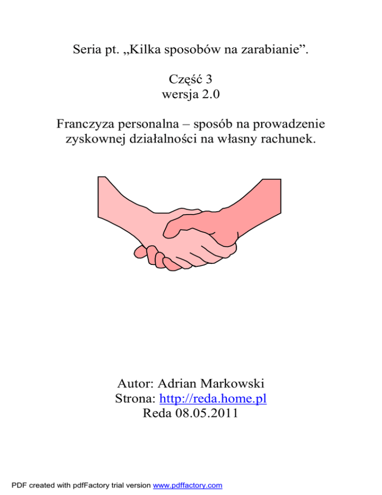 Seria pt. „Kilka sposobów na zarabianie”. Część 3 wersja 2.0 Franczyza personalna – sposób na prowadzenie zyskownej działalności na własny rachunek. Autor: Adrian Markowski Strona: http://reda.home.pl Reda 08.05.2011 PDF created with pdfFactory trial version www.pdffactory.com Wstęp Na początek zastanówmy się czy w Polsce możemy zarobić realne pieniądze, nie mówię tu o klikaniu w reklamy, umieszczaniu reklam, programie adwords. Mowa będzie tu o kilku przykładowych programach partnerskich i afiliacyjnym na których można zarobić. Franczyza jest znanym sposobem zarabiania w Polsce, działają tak np. eurobank, firmy szkoleniowe np. szybie czytanie, macdonalds, i inne wielkie firmy. Jest to sprawdzony biznes i polega na powieleniu sprawdzonej metody na sukces. Franczyzodawca przekazuje cały system: wystrój wnętrza, markę, sposób zarządzania, czasem sposób prowadzenia rozliczeń księgowych. Z kolei franczyzobiorca prowadzi działalność na swoją odpowiedzialność, ale co miesiąc płaci pewną kwotę, za którą otrzymał „gotowca”, ma też w tej kwocie szkolenia, z zakresu prowadzonej działalności, oraz konsultacje. Niestety sposób ten ma też poważną wadę, jest on dla osób z poważną kwotą pieniędzy na początku, rzędu kilkadziesiąt tysięcy zł, co często stanowi barierę zaporową. Drugą wadą jest to, ze jeśli np. prowadzę taka działalność niech to będzie np. zakład gastronomiczny, to w ramach tej opłaty nie mogę otworzyć swojej następnego zakładu gastronomicznego, czyli nie mogę powielić sukcesu, franczyza tak skonstruowana często blokuje możliwość dalszego rozwoju. Temat franczyzy jest przedstawiony w książce „FRANCHISING - Czy to dobry biznes dla Ciebie” więcej znajdziesz pod adresem: http://skocz.pl/dcjyt Powstaje pytanie czy jest sposób na założenie sobie działalności w której będę mógł powielić sukces (też. Zarobki), czy można otworzyć firmę mając tylko 1000zł ? Odpowiedzi postaram się udzielić w tym poradniku. Jest na to sposób mlm 4 generacji, czyli franczyza personalna, z pełnym prawem do prowadzenia szkolenia, oraz budowaniem swojej sieci partnerów, którzy mają prawo do dalszego powielania sukcesu. Powstaje też pytanie co jest szlachetne i najwięcej kosztuje? Dlatego taniej zapobiegać niż leczyć, mając na uwadze, że wielu osób nie stać na mało skuteczne i przy tym drogie leczenie jest to branża – która bardzo szybko rozwija się, dzięki świadomości społecznej wspartej technologią internetową. PDF created with pdfFactory trial version www.pdffactory.com Spis treści WSTĘP................................................................................................................................................................... 2 SPIS TREŚCI ........................................................................................................................................................ 3 PROBLEM ZE SPOŻYWANĄ ŻYWNOŚCIĄ.................................................................................................. 4 4 MINUTY O TRUCIZNACH KTÓRE WSZYSCY ZAŻYWAMY...................................................................................... 4 SPOŻYWCZE TRUCIZNY CZ 1/3 - POCZĄTEK KOŃCA NATURALNEGO JEDZENIA ..................................................... 4 SPOŻYWCZE TRUCIZNY CZ 2/3 - POCZĄTEK KOŃCA NATURALNEGO JEDZENIA ..................................................... 4 SPOŻYWCZE TRUCIZNY CZ 3/3 - POCZĄTEK KOŃCA NATURALNEGO JEDZENIA ..................................................... 4 ROZWIĄZANIE PROBLEMU – NATURALNY SUPLEMENT DIETY....................................................... 4 PRZECIWUTLENIACZE........................................................................................................................................... 4 FLAVON: OPINIE I DOŚWIADCZENIA 1/4 ............................................................................................................... 4 FLAVON: OPINIE I DOŚWIADCZENIA 2/4 ............................................................................................................... 4 FLAVON: OPINIE I DOŚWIADCZENIA 3/4 ............................................................................................................... 4 FLAVON: OPINIE I DOŚWIADCZENIA 4/4 ............................................................................................................... 4 ZMARNOWANE DWA LATA MOJEJ CÓRKI ............................................................................................... 4 PRZEDSTAWIENIE PRODUKTÓW ................................................................................................................ 5 FLAVON MAX ....................................................................................................................................................... 5 FLAVON KIDS ....................................................................................................................................................... 7 FLAVON GREEN ................................................................................................................................................... 9 FLAVON MAX PLUS+.......................................................................................................................................... 11 FLAVON AKTIVE ................................................................................................................................................. 13 FLAVON MAX CLUB ....................................................................................................................................... 15 KLUB FLAVON - SPERSONALIZOWANA FRANCZYZA ........................................................................................... 15 DO KOGO KIERUJEMY OFERTĘ ......................................................................................................