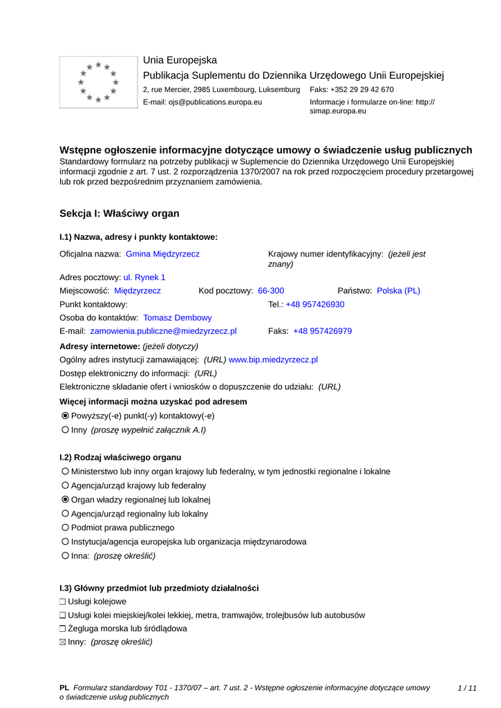 Unia Europejska Publikacja Suplementu do Dziennika Urzędowego Unii Europejskiej 2, rue Mercier, 2985 Luxembourg, Luksemburg Faks: +352 29 29 42 670 E-mail: [email protected] Informacje i formularze on-line: http:// simap.europa.eu Wstępne ogłoszenie informacyjne dotyczące umowy o świadczenie usług publicznych Standardowy formularz na potrzeby publikacji w Suplemencie do Dziennika Urzędowego Unii Europejskiej informacji zgodnie z art. 7 ust. 2 rozporządzenia 1370/2007 na rok przed rozpoczęciem procedury przetargowej lub rok przed bezpośrednim przyznaniem zamówienia. Sekcja I: Właściwy organ I.1) Nazwa, adresy i punkty kontaktowe: Oficjalna nazwa: Gmina Międzyrzecz Krajowy numer identyfikacyjny: (jeżeli jest znany) _____ Adres pocztowy: ul. Rynek 1 Miejscowość: Międzyrzecz Kod pocztowy: 66-300 Punkt kontaktowy: _____ Państwo: Polska (PL) Tel.: +48 957426930 Osoba do kontaktów: Tomasz Dembowy E-mail: [email protected] Faks: +48 957426979 Adresy internetowe: (jeżeli dotyczy) Ogólny adres instytucji zamawiającej: (URL) www.bip.miedzyrzecz.pl Dostęp elektroniczny do informacji: (URL) _____ Elektroniczne składanie ofert i wniosków o dopuszczenie do udziału: (URL) _____ Więcej informacji można uzyskać pod adresem Powyższy(-e) punkt(-y) kontaktowy(-e) Inny (proszę wypełnić załącznik A.I) I.2) Rodzaj właściwego organu Ministerstwo lub inny organ krajowy lub federalny, w tym jednostki regionalne i lokalne Agencja/urząd krajowy lub federalny Organ władzy regionalnej lub lokalnej Agencja/urząd regionalny lub lokalny Podmiot prawa publicznego Instytucja/agencja europejska lub organizacja międzynarodowa Inna: (proszę określić) I.3) Główny przedmiot lub przedmioty działalności Usługi kolejowe Usługi kolei miejskiej/kolei lekkiej, metra, tramwajów, trolejbusów lub autobusów Żegluga morska lub śródlądowa Inny: (proszę określić) PL Formularz standardowy T01 - 1370/07 – art. 7 ust. 2 - Wstępne ogłoszenie informacyjne dotyczące umowy o świadczenie usług publicznych 1 / 11 ogólne usługi publiczne I.4) Udzielenie zamówienia w imieniu innych właściwych organów Właściwy organ dokonuje zakupu w imieniu innych właściwych organów: tak nie (jeżeli tak, więcej informacji o tych właściwych organach można podać w załączniku A.II) PL Formularz standardowy T01 - 1370/07 – art. 7 ust. 2 - Wstępne ogłoszenie informacyjne dotyczące umowy o świadczenie usług publicznych 2 / 11 Sekcja II: Przedmiot zamówienia II.1) Opis: II.1.1) Nazwa nadana zamówieniu: Organizowanie publicznego transportu zbiorowego na podstawie art. 15 ust.1 pkt12 ustawy z dnia 16 grudnia2010 nr 5, poz.13), w związku z art. 7 ust. 2rozporzadzenie ( WE ) nr 1370/2007 Parlamentu Europejskiego i Rady z dnia 23 października roku 2007 r. dotyczące usług publicznych w zakresie drogowego transportu pasażerskiego oraz uchylające rozporządzenie Rady (EWG) nr 1191/69 i (EWG) nr 1107/70 II.1.2) Rodzaj zamówienia, dziedzina(-y), której(-ych) dotyczą usługi transportu publicznego: Kategoria usług: nr: T-05 (Zob. kategorie usług w załączniku B) Dziedziny, których dotyczą usługi transportu publicznego: usługi transportu autobusowego (miejskie/regionalne) Kod NUTS: PL431 II.1.3) Krótki opis zamówienia: Dokonanie wyboru operatora w trybie art. 22 ust.1 pkt 1-3 ustawy o publicznym transporcie zbiorowym, tj. ustawy z dnia 9 stycznia 2009r. o koncesji na roboty budowlane lub usługi (Dz. U. z 2015r. poz. 113 ) na sieć komunikacyjną w transporcie drogowym Gminy Międzyrzecz II.1.4) Wspólny Słownik Zamówień (CPV) Główny przedmiot Słownik główny 60112000 Słownik uzupełniający (jeżeli dotyczy) II.1.5) Informacje na temat podwykonawstwa Przewidywane jest zlecenie podwykonawstwa: tak nie (jeżeli tak) Wartość lub część zamówienia, które prawdopodobnie będzie zlecone stronom trzecim: minimalny procent: _____ (%), maksymalny procent: _____ (%) wartości zamówienia albo Nieznana Krótki opis wartości/części zamówienia, które będzie zlecone podwykonawcom: usługi transportu autobusowego (miejskie/regionalne) II.2) Ilość i/lub wartość usług Opis: _____ km usług publicznych w zakresie transportu pasażerskiego: _____ Szacunkowy koszt bez VAT: (proszę podać wyłącznie dane liczbowe) _____ albo Zakres: między _____ i _____ Waluta: Waluta: II.3) Planowana data rozpoczęcia i czas trwania zamówienia lub termin realizacji Rozpoczęcie: 01/01/2017 (dd/mm/rrrr) Okres w miesiącach: 36 albo w dniach: _____ (od udzielenia zamówienia) PL Formularz standardowy T01 - 1370/07 – art. 7 ust. 2 - Wstępne ogłoszenie informacyjne dotyczące umowy o świadczenie usług publicznych 3 / 11 Sekcja III: Informacje o charakterze prawnym, ekonomicznym, finansowym i technicznym III.1) Warunki dotyczące zamówienia: III.1.1) Parametry kosztów w celu obliczenia rekompensaty: _____ III.1.2) Informacje o wyłącznych prawach: Przyznano wyłączne prawa tak nie (jeżeli tak) Wyszczególnienie przyznanych wyłącznych praw: _____ III.1.3) Podział przychodów ze sprzedaży biletów: Odsetek przydzielony podmiotowi świadczącemu usługi publiczne: _____ (%) (uznaje się, że pozostała część jest przyznawana właściwemu organowi) III.1.4) Standardy socjalne: (przejęcie personelu zgodnie z dyrektywą 2001/23/WE) Wykaz wymaganych standardów (w tym lista pracowników, których to dotyczy, szczegółowe informacje na temat umownych praw i zobowiązań pracowników oraz warunków, na jakich pracowników uznaje się za związanych ze świadczonymi usługami): _____ III.1.5) Zobowiązania do świadczenia usług publicznych: Wyszczególnienie: _____ III.1.6) Inne szczególne warunki: Wykonanie zamówienia podlega szczególnym warunkom (jeżeli tak) Opis szczególnych warunków: _____ tak nie III.2) Warunki udziału: III.2.1) Zdolność ekonomiczna i finansowa: Informacje i formalności konieczne do dokonania oceny Minimalny poziom ewentualnie wymaganych spełn