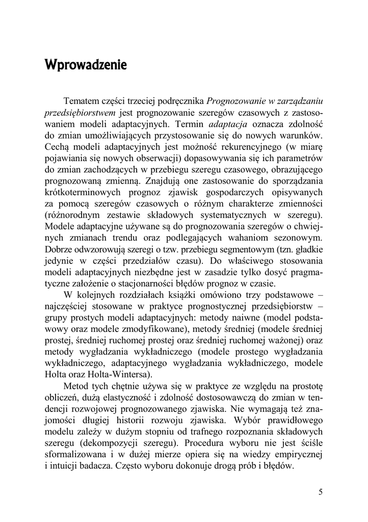 Wprowadzenie Tematem części trzeciej podręcznika Prognozowanie w zarządzaniu przedsiębiorstwem jest prognozowanie szeregów czasowych z zastosowaniem modeli adaptacyjnych. Termin adaptacja oznacza zdolność do zmian umożliwiających przystosowanie się do nowych warunków. Cechą modeli adaptacyjnych jest możność rekurencyjnego (w miarę pojawiania się nowych obserwacji) dopasowywania się ich parametrów do zmian zachodzących w przebiegu szeregu czasowego, obrazującego prognozowaną zmienną. Znajdują one zastosowanie do sporządzania krótkoterminowych prognoz zjawisk gospodarczych opisywanych za pomocą szeregów czasowych o różnym charakterze zmienności (różnorodnym zestawie składowych systematycznych w szeregu). Modele adaptacyjne używane są do prognozowania szeregów o chwiejnych zmianach trendu oraz podlegających wahaniom sezonowym. Dobrze odwzorowują szeregi o tzw. przebiegu segmentowym (tzn. gładkie jedynie w części przedziałów czasu). Do właściwego stosowania modeli adaptacyjnych niezbędne jest w zasadzie tylko dosyć pragmatyczne założenie o stacjonarności błędów prognoz w czasie. W kolejnych rozdziałach książki omówiono trzy podstawowe – najczęściej stosowane w praktyce prognostycznej przedsiębiorstw – grupy prostych modeli adaptacyjnych: metody naiwne (model podstawowy oraz modele zmodyfikowane), metody średniej (modele średniej prostej, średniej ruchomej prostej oraz średniej ruchomej ważonej) oraz metody wygładzania wykładniczego (modele prostego wygładzania wykładniczego, adaptacyjnego wygładzania wykładniczego, modele Holta oraz Holta-Wintersa). Metod tych chętnie używa się w praktyce ze względu na prostotę obliczeń, dużą elastyczność i zdolność dostosowawczą do zmian w tendencji rozwojowej prognozowanego zjawiska. Nie wymagają też znajomości długiej historii rozwoju zjawiska. Wybór prawidłowego modelu zależy w dużym stopniu od trafnego rozpoznania składowych szeregu (dekompozycji szeregu). Procedura wyboru nie jest ściśle sformalizowana i w dużej mierze opiera się na wiedzy empirycznej i intuicji badacza. Często wyboru dokonuje drogą prób i błędów. 5 Oprócz opisu modeli adaptacyjnych i ich zastosowania w prognozowaniu, przedstawiono także zagadnienia związane z oceną trafności prognoz. Jest to jeden z kluczowych etapów procesu prognozowania. Poświęcono mu osobny – trzeci – rozdział podręcznika. W rozdziale tym opisano podstawowe miary wykorzystywane do oceny trafności prognoz oraz reguły ich stosowania. Autorzy starali się, aby podręcznik był przystępny i zrozumiały zarówno dla studentów, jak i dla szerszego grona czytelników, dlatego też, zachowując niezbędną ścisłość wywodów unikali dyskusji niuansów teoretycznych. Akcentowali te zagadnienia, które mogą być przydatne w praktyce przedsiębiorstwa. Wiele uwagi poświęcili sposobowi prezentacji materiału. Intensywnie wykorzystali schematy graficzne, usiłując czynić to w sposób niekonwencjonalny, niespotykany w innych podręcznikach. Zamieścili wiele przykładów obliczeniowych oraz wskazujących na możliwe zastosowanie omawianych modeli. Każdy rozdział kończy wykaz literatury podstawowej i uzupełniającej, przydatny do samodzielnego studiowania i poszerzenia wiedzy z zakresu omawianych zagadnień. W rozdziale szóstym sformułowali problemy do samodzielnego rozwiązania, co ma pomóc czytelnikowi ugruntować zdobytą wiedzę. Autorzy podręcznika wyrażają nadzieję, że Czytelnicy znajdą w nim źródło wiedzy i inspiracji do własnych badań prognostycznych. Będą jednocześnie wdzięczni za wszelkie sugestie i opinie przydatne do ewentualnego udoskonalenia następnych wydań i kolejnych części podręcznika. 6