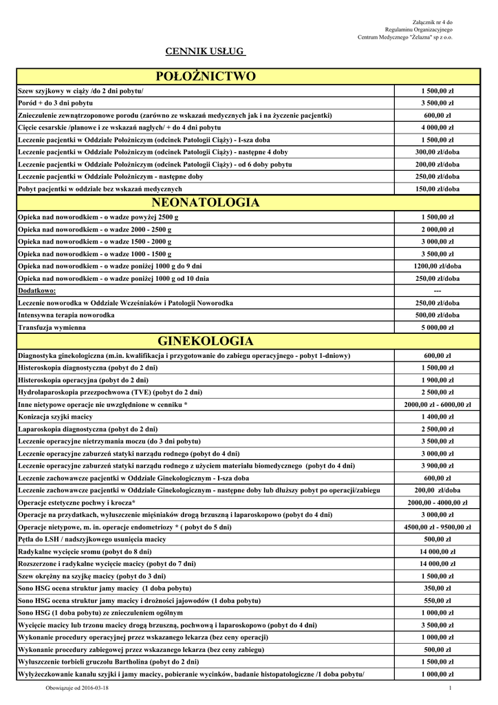 Załącznik nr 4 do Regulaminu Organizacyjnego Centrum Medycznego "Żelazna" sp z o.o. CENNIK USŁUG POŁOŻNICTWO Szew szyjkowy w ciąży /do 2 dni pobytu/ 1 500,00 zł Poród + do 3 dni pobytu 3 500,00 zł Znieczulenie zewnątrzoponowe porodu (zarówno ze wskazań medycznych jak i na życzenie pacjentki) 600,00 zł Cięcie cesarskie /planowe i ze wskazań nagłych/ + do 4 dni pobytu 4 000,00 zł Leczenie pacjentki w Oddziale Położniczym (odcinek Patologii Ciąży) - I-sza doba 1 500,00 zł Leczenie pacjentki w Oddziale Położniczym (odcinek Patologii Ciąży) - następne 4 doby 300,00 zł/doba Leczenie pacjentki w Oddziale Położniczym (odcinek Patologii Ciąży) - od 6 doby pobytu 200,00 zł/doba Leczenie pacjentki w Oddziale Położniczym - następne doby 250,00 zł/doba Pobyt pacjentki w oddziale bez wskazań medycznych 150,00 zł/doba NEONATOLOGIA Opieka nad noworodkiem - o wadze powyżej 2500 g 1 500,00 zł Opieka nad noworodkiem - o wadze 2000 - 2500 g 2 000,00 zł Opieka nad noworodkiem - o wadze 1500 - 2000 g 3 000,00 zł Opieka nad noworodkiem - o wadze 1000 - 1500 g 3 500,00 zł Opieka nad noworodkiem - o wadze poniżej 1000 g do 9 dni 1200,00 zł/doba Opieka nad noworodkiem - o wadze poniżej 1000 g od 10 dnia 250,00 zł/doba Dodatkowo: --- Leczenie noworodka w Oddziale Wcześniaków i Patologii Noworodka 250,00 zł/doba Intensywna terapia noworodka 500,00 zł/doba Transfuzja wymienna 5 000,00 zł GINEKOLOGIA Diagnostyka ginekologiczna (m.in. kwalifikacja i przygotowanie do zabiegu operacyjnego - pobyt 1-dniowy) 600,00 zł Histeroskopia diagnostyczna (pobyt do 2 dni) 1 500,00 zł Histeroskopia operacyjna (pobyt do 2 dni) 1 900,00 zł Hydrolaparoskopia przezpochwowa (TVE) (pobyt do 2 dni) 2 500,00 zł Inne nietypowe operacje nie uwzględnione w cenniku * 2000,00 zł - 6000,00 zł Konizacja szyjki macicy 1 400,00 zł Laparoskopia diagnostyczna (pobyt do 2 dni) 2 500,00 zł Leczenie operacyjne nietrzymania moczu (do 3 dni pobytu) 3 500,00 zł Leczenie operacyjne zaburzeń statyki narządu rodnego (pobyt do 4 dni) 3 000,00 zł Leczenie operacyjne zaburzeń statyki narządu rodnego z użyciem materiału biomedycznego (pobyt do 4 dni) 3 900,00 zł Leczenie zachowawcze pacjentki w Oddziale Ginekologicznym - I-sza doba Leczenie zachowawcze pacjentki w Oddziale Ginekologicznym - następne doby lub dłuższy pobyt po operacji/zabiegu Operacje estetyczne pochwy i krocza* Operacje na przydatkach, wyłuszczenie mięśniaków drogą brzuszną i laparoskopowo (pobyt do 4 dni) Operacje nietypowe, m. in. operacje endometriozy * ( pobyt do 5 dni) Pętla do LSH / nadszyjkowego usunięcia macicy 600,00 zł 200,00 zł/doba 2000,00 - 4000,00 zł 3 000,00 zł 4500,00 zł - 9500,00 zł 500,00 zł Radykalne wycięcie sromu (pobyt do 8 dni) 14 000,00 zł Rozszerzone i radykalne wycięcie macicy (pobyt do 7 dni) 14 000,00 zł Szew okrężny na szyjkę macicy (pobyt do 3 dni) 1 500,00 zł Sono HSG ocena struktur jamy macicy (1 doba pobytu) Sono HSG ocena struktur jamy macicy i drożności jajowodów (1 doba pobytu) 350,00 zł 550,00 zł Sono HSG (1 doba pobytu) ze znieczuleniem ogólnym 1 000,00 zł Wycięcie macicy lub trzonu macicy drogą brzuszną, pochwową i laparoskopowo (pobyt do 4 dni) 3 500,00 zł Wykonanie procedury operacyjnej przez wskazanego lekarza (bez ceny operacji) 1 000,00 zł Wykonanie procedury zabiegowej przez wskazanego lekarza (bez ceny zabiegu) 500,00 zł Wyłuszczenie torbieli gruczołu Bartholina (pobyt do 2 dni) 1 500,00 zł Wyłyżeczkowanie kanału szyjki i jamy macicy, pobieranie wycinków, badanie histopatologiczne /1 doba pobytu/ 1 000,00 zł Obowiązuje od 2016-03-18 1 Załącznik nr 4 do Regulaminu Organizacyjnego Centrum Medycznego "Żelazna" sp z o.o. Zakończenie ciąży obumarłej (pobyt do 2 dni) 1 500,00 zł Zastosowanie profilaktyki przeciwzrostowej 650,00 zł Znieczulenie do drobnych zabiegów * w zależności od planowanego rodzaju operacji / stopnia zaawansowania choroby , cena ustalana indywidualnie podczas konsultacji lekarskiej 600,00 zł GINEKOLOGIA ESTETYCZNA Zabieg laserowy zewnętrznych okolic intymnych 650,00 zł Zabieg laserowy zewnętrznych okolic intymnych (pakiet 3 zabiegów) 1 500,00 zł Zabieg rewitalizacji pochwy i warg sromowych 2 000,00 zł Zabieg rewitalizacji pochwy i warg sromowych (pakiet 3 zabiegów) 4 000,00 zł USŁUGI POZOSTAŁE Dopłata do pobytu w sali rodzinnej 12 h 300,00 zł 24 h 500,00 zł Indywidualna opieka pielęgnacyjna - 12 h 500,00 zł Konsultacja lekarska w Izbie Przyjęć 150,00 zł Zwrot kosztów za udział osoby bliskiej wskazanej przez pacjentkę w planowanym cięciu cesarskim 200,00 zł USŁUGI AMBULATORYJNE Konsultacja andrologiczna 200,00 zł Konsultacja anestezjologiczna 160,00 zł Konsultacja dietetyka - pierwsza wizyta 120,00 zł Konsultacja dietetyka - kolejna wizyta 80,00 zł Konsultacja endokrynologiczna dla dorosłych 170,00 zł Jadłospis indywidualny 200,00 zł Konsultacja genetyka (dzieci i dorośli) Konsultacja ginekologiczna w Przychodni* Konsultacja internistyczna Konsultacja laktacyjna - pierwsza wizyta Konsultacja laktacyjna - kolejna wizyta 160,00 zł 130,00 zł - 300,00 zł 150,00 zł 100,00 zł - 120,00 zł 60,00 zł - 70,00 zł Konsultacja laktacyjna - kobieta w ciąży / sama matka 70,00 zł Konsultacja laktacyjna - bliźnięta - pierwsza wizyta 150,00 zł Konsultacja laktacyjna - bliźnięta - kolejna wizyta 140,00 zł Konsultacja okulistyczna dla dorosłych 170,00 zł Konsultacja ortopedyczna dla dorosłych 150,00 zł Konsultacja położnej (wizyta w programie prowadzenia ciąży przez położną) 120,00 zł Konsultacja położnej po porodzie - pierwsza wizyta 80,00 zł Konsultacja położnej po porodzie - kolejna wizyta 60,00 zł Konsultacja psychologiczna 100,00 zł Sesja terapeutyczna 100,00 zł Konsultacja rehabilitacyjna dla dorosłych 150,00 zł Konsultacja chirurgiczna dla dzieci 150,00 zł Konsultacja do indywidualnego kalendarza szczepień 130,00 zł Konsultacja endokrynologiczna 