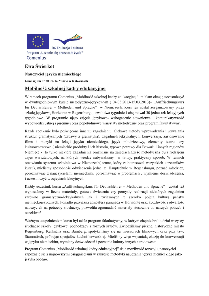 Ewa Świerkot Nauczyciel języka niemieckiego Gimnazjum nr 20 im. K. Miarki w Katowicach Mobilność szkolnej kadry edukacyjnej W ramach programu Comenius „Mobilność szkolnej kadry edukacyjnej” miałam okazję uczestniczyć w dwutygodniowym kursie metodyczno-językowym ( 04.03.2013-15.03.2013)– „Auffrischungskurs für Deutschlehrer – Methoden und Sprache” w Niemczech. Kurs ten został zorganizowany przez szkołę językową Horizonte w Regensburgu, trwał dwa tygodnie i obejmował 30 jednostek lekcyjnych tygodniowo. W programie ujęto zajęcia językowe- wzbogacenie słownictwa, komunikatywność wypowiedzi ustnej i pisemnej oraz popołudniowe warsztaty metodyczne oraz program fakultatywny. Każde spotkanie było poświęcone innemu zagadnieniu. Ciekawe metody wprowadzania i utrwalania struktur gramatycznych (zabawy z gramatyką), zagadnień leksykalnych, konwersacji, zastosowanie filmu i muzyki na lekcji języka niemieckiego, język młodzieżowy, elementy teatru, czy kulturoznawstwo ( niemieckie produkty i ich historia, typowe potrawy dla Bawarii i innych regionów Niemiec) - to tylko niektóre zagadnienia omawiane na zajęciach.Część metodyczna była rodzajem zajęć warsztatowych, na których wiedzę nabywaliśmy w łatwy, praktyczny sposób. W ramach omawiania systemu szkolnictwa w Niemczech( temat, który zainteresował wszystkich uczestników kursu), mieliśmy sposobność odwiedzenia jednej z Hauptschule w Regensburgu, poznać młodzież, porozmawiać z nauczycielami niemieckimi, porozmawiać o problemach , wymienić doświadczenia, i uczestniczyć w zajęciach lekcyjnych. Każdy uczestnik kursu „Auffrischungskurs für Deutschlehrer – Methoden und Sprache” został też wyposażony w liczne materiały, gotowe ćwiczenia czy pomysły realizacji niektórych zagadnień zarówno gramatyczno-leksykalnych jak i związanych z szeroko pojętą kulturą państw niemieckojęzycznych. Ponadto przyjazna atmosfera panująca w Horizonte oraz życzliwość i otwartość nauczycieli na potrzeby słuchaczy, pozwoliła zgromadzić materiały stosownie do naszych potrzeb i oczekiwań. Ważnym uzupełnieniem kursu był także program fakultatywny, w którym chętnie brali udział wszyscy słuchacze szkoły językowej pochodzący z różnych krajów. Zwiedziliśmy piękne, historyczne miasto Regensburg, Kallmünz oraz Bamberg, spotykaliśmy się na wieczorach filmowych oraz przy tzw. Stammtisch, próbując specjałów kuchni bawarskiej. Mieliśmy więc wspaniałą okazję do konwersacji w języku niemieckim, wymiany doświadczeń i poznanie kultury innych narodowości. Program Comenius „Mobilność szkolnej kadry edukacyjnej” daje możliwość rozwoju, nauczyciel zapoznaje się z najnowszymi osiągnięciami w zakresie metodyki nauczania języka niemieckiego jako języka obcego. Uzyskaną w ten sposób wiedzę będę aktywnie wykorzystywać w pracy szkolnej, poprzez wzbogacanie jednostek lekcyjnych. Myślę, że przyczyni się to do podniesienia poziomu nauczania języka niemieckiego oraz wzrostu zainteresowania wśród uczniów kulturą Niemiec. Nauczyciele uczestniczący w szkoleniu Regensburg