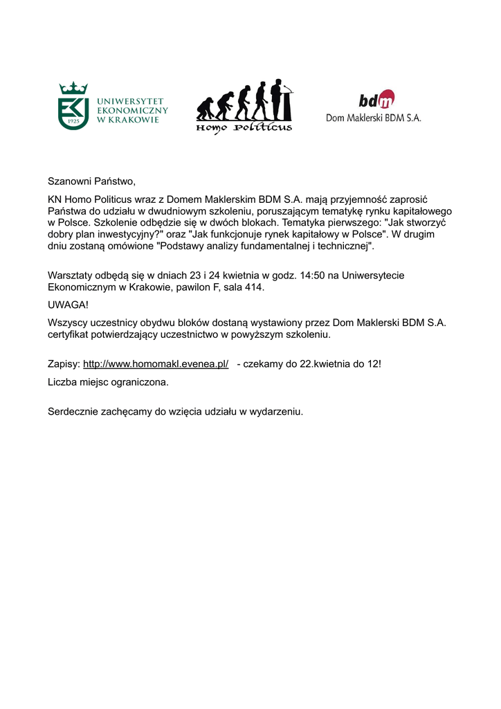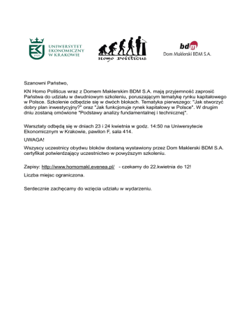 Szanowni Państwo, KN Homo Politicus wraz z Domem Maklerskim BDM S.A. mają przyjemność zaprosić Państwa do udziału w dwudniowym szkoleniu, poruszającym tematykę rynku kapitałowego w Polsce. Szkolenie odbędzie się w dwóch blokach. Tematyka pierwszego: "Jak stworzyć dobry plan inwestycyjny?" oraz "Jak funkcjonuje rynek kapitałowy w Polsce". W drugim dniu zostaną omówione "Podstawy analizy fundamentalnej i technicznej". Warsztaty odbędą się w dniach 23 i 24 kwietnia w godz. 14:50 na Uniwersytecie Ekonomicznym w Krakowie, pawilon F, sala 414. UWAGA! Wszyscy uczestnicy obydwu bloków dostaną wystawiony przez Dom Maklerski BDM S.A. certyfikat potwierdzający uczestnictwo w powyższym szkoleniu. Zapisy: http://www.homomakl.evenea.pl/ - czekamy do 22.kwietnia do 12! Liczba miejsc ograniczona. Serdecznie zachęcamy do wzięcia udziału w wydarzeniu.
