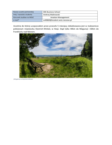 Nazwa uczelni partnerskiej Imię i nazwisko studenta Kierunek studiów na WSIiZ e-mail* EBS Business School Andrzej Malinowski Aviation Management [email protected] Uczelnia do której uczęszczałem przez przeszło 5 miesięcy zlokalizowana jest w malowniczo położonym miasteczku Oestrich-Winkel, w Hesji. Stąd tylko 40km do Moguncji i 60km do Frankfurtu nad Menem. 1Wzgórze w Oestrich Winkel EBS fur Wirtschaft und Recht jest uczelnią prywatną, na której studenci zdobywają swoją wiedzę zarówno na poziomie licencjackim jak i magisterskim. Osobiście studiowałem tam Aviation Management pierwszego stopnia. Wszystkie zajęcia były prowadzone przez głównie niemieckich wykładowców, lecz wykłady były prowadzone tylko i wyłącznie po angielsku. Poziom nauki był niesamowicie wysoki i znacznie przewyższał standardy jakich doświadczyłem w Rzeszowie. Wykładowcy świetnie przygotowani do wykładów, bardzo przyjaźni, z niesamowitym bagażem doświadczeń. Typowi praktycy, którzy dziś przyjechali na uczelnię aby poprowadzić jeden wykład, aby jutro wrócić do swej pracy. 2Katedra w Kolonii Kadra była zdecydowanym atutem tej uczelni. Wykłady były w sporej mierze teoretyczne, lecz wszystkie z nich były interesujące – poparte życiowymi przykładami. Wszystkie z przedmiotów jakie sobie wcześniej wybrałem, wywierały spory nacisk na pracę w grupię i wykonywanie ćwiczeń w trakcie zajęć. Pozwoliło nam to zmierzyć się z wiedzą jaką właśnie posiedliśmy i zaaplikować ją w realne przykłady podane w ćwiczeniach. Jednym z takich zadań było np. zaprojektowanie strefy komercyjnej terminala odlotów we Frankfurcie, bazując na tym, czego się wcześniej dowiedzieliśmy od dyrektora d.s. komercyjnych na lotnisku we Frankfurcie. Wyniki naszych rozważań prezentowaliśmy podczas prezentacji, po której automatycznie otrzymaliśmy feedback naszej pracy. Jak już wspomniałem powyżej, wykładowcy są niezwykle przyjaźnie nastawieni do studentów i w razie jakichkolwiek wątpliwości możemy śmiało się z nimi skontaktować. Na uczelni, w której przebywałem działa samorząd studencki, który wiele razy organizował różne eventy czy imprezy w celu integracji studenckiej. Zaczynając od konkursu smakowania miejscowych win, kończąc na klasycznej imprezie, każdy znalazłby coś dla siebie. Dużym atutem tego uniwersytetu jest bogata i dostępna o każdej porze dnia i nocy biblioteka. Każdy student ma dostęp do jej zbiorów, a proces wypożyczania książek jest niezwykle prosty. Większość literatury jest napisana w języku niemieckim, lecz jest też spory zakres książek napisanych w języku angielskim. W każdym kampusie (a jest ich dwa) znajdują się dedykowane sale komputerowe, gdzie studenci mogą wedle swojego życzenia skorzystać z zainstalowanych programów naukowych, a także wyszukać niezbędnych informacji w Internecie. 3 Frankfurt nocą Większość egzaminów, jakie musiałem podjąć była przeprowadzona w formie pisemnej. Tylko nieliczne z nich były w formie projektu czy wypracowania. Każdy z egzaminów wymagał solidnego przygotowania się z obowiązującego materiału, lecz wszystko było jasno określone na pierwszych zajęciach. Przed wyjazdem musiałem załatwić sobie ubezpieczenie na wyjazd – w związku z tym poprosiłem o wydanie karty EKUZ. Do Frankfurtu dostałem się samolotem z Warszawy. Lot był bezpośredni, a za podróż w obie strony zapłaciłem 800zł. W międzyczasie powróciłem na kilka dni do rodziny na Święta Wielkanocne również samolotem. Łącznie koszt podróży wyniósł mnie około 1500zł. Po moim pierwszym przylocie, uczelnia zapewniła mi transport wprost do domu po uprzednim zapisaniu się na „Pick-up list”. Koszt to 15€, mniej więcej tyle samo bym zapłacił jak miałbym jechać pociągiem, lecz z jedną przesiadką. 4Wschód słońca podczas lotu z Warszawy do Frankfurtu. Podczas mojego pobytu nie podejmowałem żadnych prób podjęcia pracy oraz szczęśliwie nie potrzebowałem skorzystać z tamtejszej służby zdrowia. Pierwsze dni po przyjeździe były nastawione na integrację studentów, którzy już przyjechali, natomiast tuż przed kończącą semestr sesją egzaminacyjną odbyła się impreza pożegnalna. Mieszkanie znalazłem dzięki uczelni goszczącej, która na dwa miesiące przed przyjazdem zorganizowała tzw. „Flat hunt” gdzie przyszli studenci mogli znaleźć wiele ofert z zakwaterowaniem. Jeśli byli pierwsi, którzy się zgłosili, otrzymywali następnie kontakt do właściciela danego obiektu w celu ustalenia szczegółów kontraktu. Cały proces był bardzo łatwy i przejrzysty. Mieszkanie dzieliłem z kolegą, z którym przyjechałem na tą uczelnie. Koszt za miesiąc na głowę wyniósł około 390€ wraz z opłatami za gaz, wodę i prąd. W tej samej kamienicy, w które znajdowało się nasze mieszkanie, mieszkali również inni studenci – dwie osoby z Meksyku i Korei Południowej. Wszystkie podstawowe media były dostępne za wyjątkiem internetu i telewizji. Średnio moje wydatki kształtowały się na poziomie 8-10€ dziennie. W niedziele sklepy są zamknięte, co czasem pozwalało oszczędzić parę centów. Ceny w barze kształtują się na poziomie około 2,5€ za 0,5l piwa, natomiast w sklepie, butelka 0,5l kosztuje około 1€. Dzięki temu, że studia w Rzeszowie były prowadzone również w języku angielskim, a także dzięki mojemu poprzedniemu doświadczeniu z tym językiem, nie miałem żadnych problemów z komunikacją z innymi studentami czy też wykładowcami. Czynnie uczestniczyłem w wykładach, a także wygłaszałem prezentacje na forum całej grupy uczestniczącej na zajęcia. 5 Wnętrze kościoła w Trewirze Podczas czasu wolnego starałem się aktywnie zwiedzać okolice jeżdżąc głównie do Frankfurtu i Moguncji, lecz także odwiedzając dalsze miejscowości takie jak Kolonia, Koblencja czy Trewir. Z tego względu, że jestem 