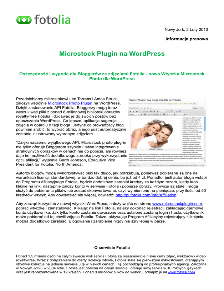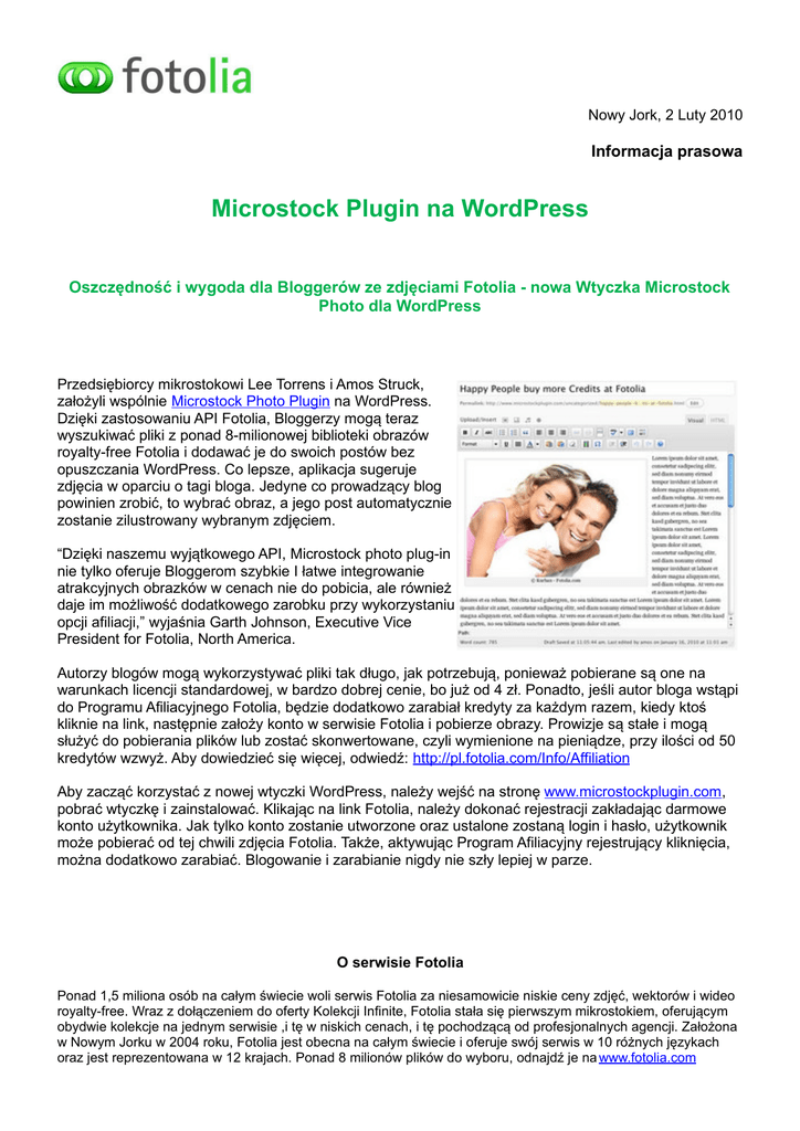 Nowy Jork, 2 Luty 2010 Informacja prasowa Microstock Plugin na WordPress Oszczędność i wygoda dla Bloggerów ze zdjęciami Fotolia - nowa Wtyczka Microstock Photo dla WordPress Przedsiębiorcy mikrostokowi Lee Torrens i Amos Struck, założyli wspólnie Microstock Photo Plugin na WordPress. Dzięki zastosowaniu API Fotolia, Bloggerzy mogą teraz wyszukiwać pliki z ponad 8-milionowej biblioteki obrazów royalty-free Fotolia i dodawać je do swoich postów bez opuszczania WordPress. Co lepsze, aplikacja sugeruje zdjęcia w oparciu o tagi bloga. Jedyne co prowadzący blog powinien zrobić, to wybrać obraz, a jego post automatycznie zostanie zilustrowany wybranym zdjęciem. “Dzięki naszemu wyjątkowego API, Microstock photo plug-in nie tylko oferuje Bloggerom szybkie I łatwe integrowanie atrakcyjnych obrazków w cenach nie do pobicia, ale również daje im możliwość dodatkowego zarobku przy wykorzystaniu opcji afiliacji,” wyjaśnia Garth Johnson, Executive Vice President for Fotolia, North America. Autorzy blogów mogą wykorzystywać pliki tak długo, jak potrzebują, ponieważ pobierane są one na warunkach licencji standardowej, w bardzo dobrej cenie, bo już od 4 zł. Ponadto, jeśli autor bloga wstąpi do Programu Afiliacyjnego Fotolia, będzie dodatkowo zarabiał kredyty za każdym razem, kiedy ktoś kliknie na link, następnie założy konto w serwisie Fotolia i pobierze obrazy. Prowizje są stałe i mogą służyć do pobierania plików lub zostać skonwertowane, czyli wymienione na pieniądze, przy ilości od 50 kredytów wzwyż. Aby dowiedzieć się więcej, odwiedź: http://pl.fotolia.com/Info/Affiliation Aby zacząć korzystać z nowej wtyczki WordPress, należy wejść na stronę www.microstockplugin.com, pobrać wtyczkę i zainstalować. Klikając na link Fotolia, należy dokonać rejestracji zakładając darmowe konto użytkownika. Jak tylko konto zostanie utworzone oraz ustalone zostaną login i hasło, użytkownik może pobierać od tej chwili zdjęcia Fotolia. Także, aktywując Program Afiliacyjny rejestrujący kliknięcia, można dodatkowo zarabiać. Blogowanie i zarabianie nigdy nie szły lepiej w parze. O serwisie Fotolia Ponad 1,5 miliona osób na całym świecie woli serwis Fotolia za niesamowicie niskie ceny zdjęć, wektorów i wideo royalty-free. Wraz z dołączeniem do oferty Kolekcji Infinite, Fotolia stała się pierwszym mikrostokiem, oferującym obydwie kolekcje na jednym serwisie ,i tę w niskich cenach, i tę pochodzącą od profesjonalnych agencji. Założona w Nowym Jorku w 2004 roku, Fotolia jest obecna na całym świecie i oferuje swój serwis w 10 różnych językach oraz jest reprezentowana w 12 krajach. Ponad 8 milionów plików do wyboru, odnajdź je na www.fotolia.com