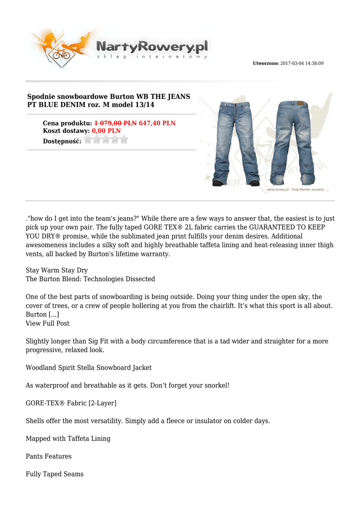 Utworzono: 2017-03-04 14:38:09 Spodnie snowboardowe Burton WB THE JEANS PT BLUE DENIM roz. M model 13/14 Cena produktu: 1 079,00 PLN 647,40 PLN Koszt dostawy: 0,00 PLN Dostępność: ."how do I get into the team's jeans?" While there are a few ways to answer that, the easiest is to just pick up your own pair. The fully taped GORE TEX® 2L fabric carries the GUARANTEED TO KEEP YOU DRY® promise, while the sublimated jean print fulfills your denim desires. Additional awesomeness includes a silky soft and highly breathable taffeta lining and heat-releasing inner thigh vents, all backed by Burton's lifetime warranty. Stay Warm Stay Dry The Burton Blend: Technologies Dissected One of the best parts of snowboarding is being outside. Doing your thing under the open sky, the cover of trees, or a crew of people hollering at you from the chairlift. It’s what this sport is all about. Burton [...] View Full Post Slightly longer than Sig Fit with a body circumference that is a tad wider and straighter for a more progressive, relaxed look. Woodland Spirit Stella Snowboard Jacket As waterproof and breathable as it gets. Don’t forget your snorkel! GORE-TEX® Fabric [2-Layer] Shells offer the most versatility. Simply add a fleece or insulator on colder days. Mapped with Taffeta Lining Pants Features Fully Taped Seams GORE-SEAM® Tape Lifetime Warranty Additional Features Sublimated Denim Print Expandable Boot Gaiter Płeć Damskie Producent Burton Rozmiary M Wodoodporność Kolory Kolekcja Adres: http://nartyrowery.pl/ Gore-tex Niebieski, Granatowy zima 2013/14 Telefon: 34 365 66 09 Email: [email protected] Gadu-Gadu: Skype: