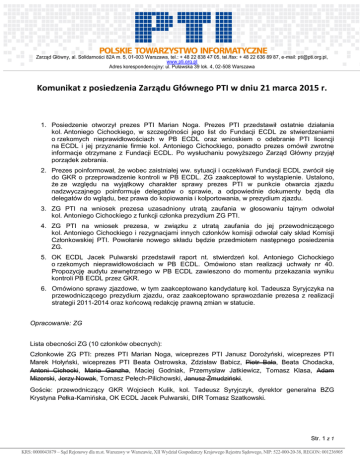 Zarząd Główny, al. Solidarności 82A m. 5, 01-003 Warszawa, tel.: + 48 22 838 47 05, tel./fax: + 48 22 636 89 87, e-mail: [email protected], www.pti.org.pl Adres korespondencyjny: ul. Puławska 39 lok. 4, 02-508 Warszawa Komunikat z posiedzenia Zarządu Głównego PTI w dniu 21 marca 2015 r. 1. Posiedzenie otworzył prezes PTI Marian Noga. Prezes PTI przedstawił ostatnie działania kol. Antoniego Cichockiego, w szczególności jego list do Fundacji ECDL ze stwierdzeniami o rzekomych nieprawidłowościach w PB ECDL oraz wnioskiem o odebranie PTI licencji na ECDL i jej przyznanie firmie kol. Antoniego Cichockiego, ponadto prezes omówił zwrotne informacje otrzymane z Fundacji ECDL. Po wysłuchaniu powyższego Zarząd Główny przyjął porządek zebrania. 2. Prezes poinformował, że wobec zaistniałej ww. sytuacji i oczekiwań Fundacji ECDL zwrócił się do GKR o przeprowadzenie kontroli w PB ECDL. ZG zaakceptował to wystąpienie. Ustalono, że ze względu na wyjątkowy charakter sprawy prezes PTI w punkcie otwarcia zjazdu nadzwyczajnego poinformuje delegatów o sprawie, a odpowiednie dokumenty będą dla delegatów do wglądu, bez prawa do kopiowania i kolportowania, w prezydium zjazdu. 3. ZG PTI na wniosek prezesa uzasadniony utratą zaufania w głosowaniu tajnym odwołał kol. Antoniego Cichockiego z funkcji członka prezydium ZG PTI. 4. ZG PTI na wniosek prezesa, w związku z utratą zaufania do jej przewodniczącego kol. Antoniego Cichockiego i rezygnacjami innych członków komisji odwołał cały skład Komisji Członkowskiej PTI. Powołanie nowego składu będzie przedmiotem następnego posiedzenia ZG. 5. OK ECDL Jacek Pulwarski przedstawił raport nt. stwierdzeń kol. Antoniego Cichockiego o rzekomych nieprawidłowościach w PB ECDL. Omówiono stan realizacji uchwały nr 40. Propozycję audytu zewnętrznego w PB ECDL zawieszono do momentu przekazania wyniku kontroli PB ECDL przez GKR. 6. Omówiono sprawy zjazdowe, w tym zaakceptowano kandydaturę kol. Tadeusza Syryjczyka na przewodniczącego prezydium zjazdu, oraz zaakceptowano sprawozdanie prezesa z realizacji strategii 2011-2014 oraz końcową redakcję prawną zmian w statucie. Opracowanie: ZG Lista obecności ZG (10 członków obecnych): Członkowie ZG PTI: prezes PTI Marian Noga, wiceprezes PTI Janusz Dorożyński, wiceprezes PTI Marek Hołyński, wiceprezes PTI Beata Ostrowska, Zdzisław Babicz, Piotr Bała, Beata Chodacka, Antoni Cichocki, Maria Ganzha, Maciej Godniak, Przemysław Jatkiewicz, Tomasz Klasa, Adam Mizerski, Jerzy Nowak, Tomasz Pełech-Pilichowski, Janusz Żmudziński. Goście: przewodniczący GKR Wojciech Kulik, kol. Tadeusz Syryjczyk, dyrektor generalna BZG Krystyna Pełka-Kamińska, OK ECDL Jacek Pulwarski, DIR Tomasz Szatkowski. Str. 1 z 1 KRS: 0000043879 – Sąd Rejonowy dla m.st. Warszawy w Warszawie, XII Wydział Gospodarczy Krajowego Rejestru Sądowego, NIP: 522-000-20-38, REGON: 001236905