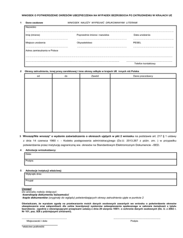 WNIOSEK O POTWIERDZENIE OKRESÓW UBEZPIECZENIA NA WYPADEK BEZROBOCIA PO ZATRUDNIENIU W KRAJACH UE 1 WNIOSEK NALEŻY WYPEŁNIĆ DRUKOWANYMI LITERAMI Dane osobowe Nazwisko ................................................................................................................................................................................................................... Imię (imiona) Poprzednie imiona i nazwiska Data urodzenia .......................................................... ............................................................ ....................................................................... Miejsce urodzenia Obywatelstwo PESEL ............................................................ ....................................................................... .......................................................... Adres zamieszkania w Polsce ....................................................................................................................................................................................................................... .......................................................................................................................... ............................................................ Telefon kontaktowy 2 Okresy zatrudnienia, innej pracy zarobkowej i inne okresy odbyte w krajach UE innych niż Polska od do Zawód Dane pracodawcy 3 Wnoszę/Nie wnoszę* o wydanie zaświadczenia o okresach ujętych w pkt 2 wniosku na podstawie art. 217 § 1 ustawy z dnia 14 czerwca 1960 r. - Kodeks postępowania administracyjnego (Dz.U. 2013.267 z późn. zm. ) w przypadku potwierdzenia przez instytucję zagraniczną ww. okresów na Standardowym Elektronicznym Dokumencie –SED. 4 Adnotacje wnioskodawcy: Data: Podpis: 5 Adnotacje instytucji właściwej: Wpłynęło dnia: Przyjął: Uwaga! Do wniosku należy dołączyć: -kserokopię dokumentu tożsamości -kopie dokumentów (oryginały do wglądu) potwierdzających okresy zatrudnienia ujęte w punkcie 2 Oświadczam, że wyrażam zgodę na przetwarzanie moich danych osobowych zawartych we wniosku o potwierdzenie okresów ubezpieczenia oraz załącznikach dla celów koordynacji systemów zabezpieczenia społecznego w zakresie świadczeń z tytułu bezrobocia - zgodnie z obowiązującymi przepisami ustawy z dnia 29 sierpnia 1997r. o ochronie danych osobowych (Dz. U. z 2002 r. Nr 101, poz. 926 z późniejszymi zmianami). ................................................ Miejscowość i data __________________________________________ *właściwe podkreślić .................................................. Podpis