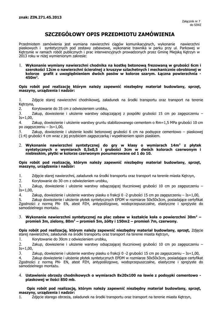 znak: ZIN.271.45.2013 Załącznik nr 7 do SIWZ SZCZEGÓŁOWY OPIS PRZEDMIOTU ZAMÓWIENIA Przedmiotem zamówienia jest wymiana nawierzchni ciągów komunikacyjnych, wykonanie nawierzchni piaskowych i syntetycznych pod zestawy zabawowe, wykonanie trawnika w parku przy ul. Parkowej w Kętrzynie w ramach robót publicznych i prac interwencyjnych prowadzonych przez Gminę Miejską Kętrzyn w 2013 roku w niżej wymienionym zakresie: 1. Wykonanie wymiany nawierzchni chodnika na kostkę betonową frezowaną w grubości 6cm i szerokości 12cm o nawierzchni ścieralnej z kruszyw szlachetnych i mechanicznie obrobionej w kolorze grafit z uwzględnieniem dwóch pasów w kolorze szarym. Łączna powierzchnia 450m2. Opis robót pod realizację którym należy zapewnić niezbędny materiał budowlany, sprzęt, maszyny, urządzenia i nadzór: 1. Zdjęcie starej nawierzchni chodnikowej, załadunek na środki transportu oraz transport na terenie Kętrzyna, 2. Korytowanie do 35 cm z odwiezieniem urobku, 3. Zakup, dowiezienie i ułożenie warstwy odsączającej z pospółki grubości 15 cm po zagęszczeniu – Is=1,00, 4. Zakup, dowiezienie i ułożenie warstwy gruntu stabilizowanego cementem o Rm=1,5 MPa grubości 10 cm po zagęszczeniu – Is=1,00, 5. Zakup, dowiezienie i ułożenie kostki betonowej grubości 6 cm na podsypce cementowo – piaskowej (1:4) grubości 4 cm wraz z jej przybiciem zagęszczarką i wypełnieniem spoin piaskiem. 2. Wykonanie nawierzchni syntetycznej do gry w klasy o wymiarach 14m 2 z płytek syntetycznych o wymiarach 0,5x0,5 i grubości 3cm w dwóch kolorach czerwonym i niebieskim, płytki w kolorze czerwonym ponumerowane od 1 do 10. Opis robót pod realizację, którym należy zapewnić niezbędny materiał budowlany, sprzęt, maszyny, urządzenia i nadzór: 1. 2. 3. Zdjęcie starej nawierzchni, załadunek na środki transportu oraz transport na terenie miasta Kętrzyn, Korytowanie do 30 cm z odwiezieniem urobku, Zakup, dowiezienie i ułożenie warstwy odsączającej tłuczniowej grubości 10 cm po zagęszczeniu – Is=1,00, 4. Zakup, dowiezienie i ułożenie warstwy piasku o frakcji 0 -2 grubości 15 cm po zagęszczeniu – Is=1,00, 5. Zakup dowiezienie i ułożenie płytek syntetycznych EPDM w rozmiarze 50x50x3cm, posiadające certyfikat Zgodności z normą PN- EN, atest PZH, antypoślizgowe, wodoprzepuszczalne, elastyczne i sprężyste do samodzielnego montażu. 3. Wykonanie nawierzchni syntetycznej na plac zabaw w kształcie koła o powierzchni 30m 2 – promień 3m, zielony, 80m2 – promień 5m, żółty i 150m2 – promień 7m, czerwony. Opis robót pod realizację, którym należy zapewnić niezbędny materiał budowlany, sprzęt, Zdjęcie starej nawierzchni, załadunek na środki transportu oraz transport na terenie miasta Kętrzyn, 1. Korytowanie do 30cm z odwiezieniem urobku, 2. Zakup, dowiezienie i ułożenie warstwy odsączającej tłuczniowej grubości 10 cm po zagęszczeniu – Is=1,00, 3. Zakup, dowiezienie i ułożenie warstwy piasku o frakcji 0 -2 grubości 15 cm po zagęszczeniu – Is=1,00, 4. Zakup dowiezienie i ułożenie płytek syntetycznych EPDM w rozmiarze 50x50x3cm, posiadające certyfikat Zgodności z normą PN- EN, atest PZH, antypoślizgowe, wodoprzepuszczalne, elastyczne i sprężyste do samodzielnego montażu. 4. Ustawienie obrzeży chodnikowych o wymiarach 8x20x100 na ławie z podsypki cementowo piaskowej w ilości 850 mb. Opis robót pod realizację, którym należy zapewnić niezbędny materiał budowlany, sprzęt, maszyny, urządzenia i nadzór: 1. Zdjęcie starego obrzeża, załadunek na środki transportu oraz transport na terenie miasta Kętrzyn, 2. 3. Ręczne korytowanie pod ławę, Zakup, dowiezienie i ułożenie ławy z podsypki cementowo – piaskowej (1:4) grubości 4 cm i szerokości 15 cm, 4. Zakup, dowiezienie i ustawienie obrzeża. 5. Wykonanie nawierzchni piaskowej (frakcja 0,2-0,7) o grubości 50cm w kształcie kół w ilości 2 sztuki o promieniu 10m większe i promieniu 7m mniejsze, otoczone obrzeżami trawnikowymi. Opis robót pod realizację, którym należy zapewnić niezbędny materiał budowlany, sprzęt, maszyny, urządzenia i nadzór: 1. Wyrównanie starej nawierzchni, załadunek na środki transportu urobku oraz transport na terenie Kętrzyna, 2. Ułożenie agrowłókniny na całej powierzchni nawierzchni piaskowej, 3. Zakup, dowiezienie i ułożenie warstwy piaskowej o grubości 50 cm po zagęszczeniu – Is=1,00, 4. Zakup, dowiezienie i ułożenie warstwy piasku (frakcja 0,2-0,7) o grubości 50 cm po zagęszczeniu – Is=1,00, 6. Wykonanie nawierzchni trawników o łącznej powierzchni 3 000m2 Opis robót pod realizację, którym należy zapewnić niezbędny materiał budowlany, sprzęt, maszyny, urządzenia i nadzór: 1. Wyrównanie starej nawierzchni, uprzątnięcie zanieczyszczeń, załadunek na środki transportu urobku oraz transport na terenie Kętrzyna, 2. Zakup, dowiezienie i ułożenie warstwy ziemi urodzajnej – humusu, o łącznej powierzchni 3 000m 2 o grubości 20cm.