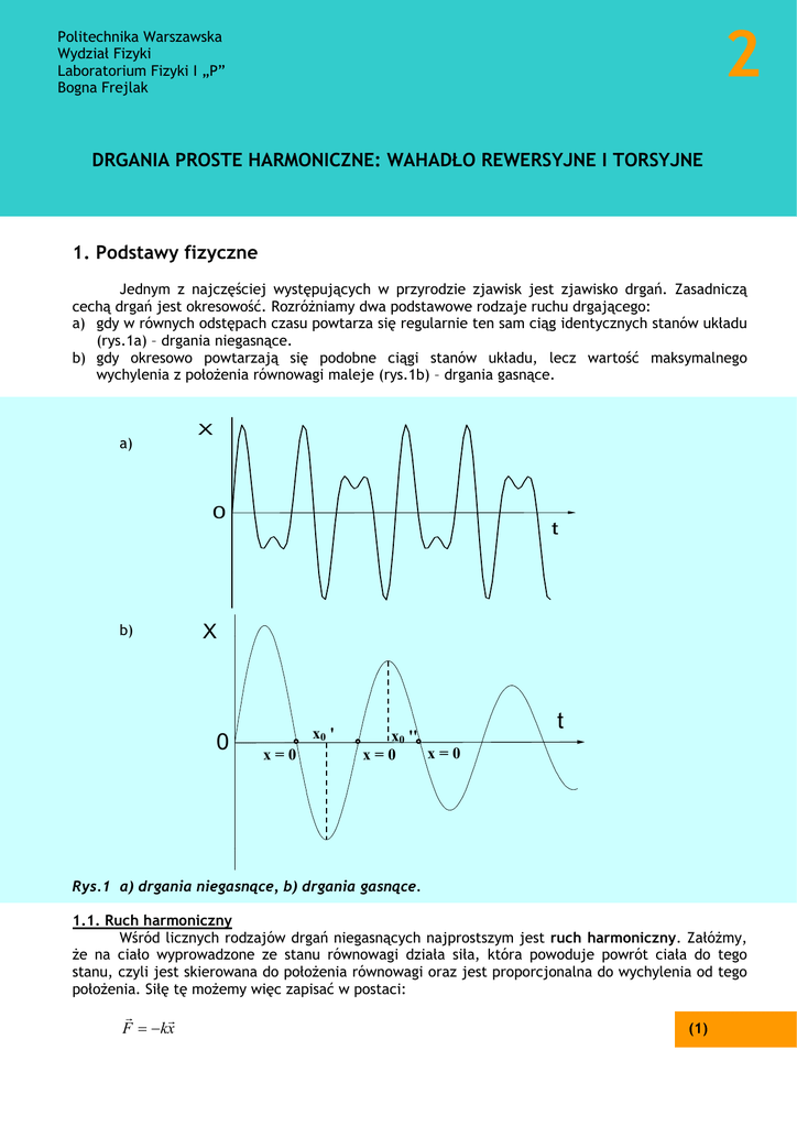 2 Politechnika Warszawska Wydział Fizyki Laboratorium Fizyki I „P” Bogna Frejlak Warszawska Politechnika Wydział Fizyki Laboratorium Fizyki I Płd. Bogna Frejlak 2 DRGANIA PROSTE HARMONICZNE: WAHADŁO REWERSYJNE I TORSYJNE DRGANIA PROSTE HARMONICZNE: WAHADŁO REWERSYJNE I WAHADŁO TORSYJNE 1. Podstawy fizyczne Jednym z najczęściej występujących w przyrodzie zjawisk jest zjawisko drgań. Zasadniczą cechą drgań jest okresowość. RozróŜniamy dwa podstawowe rodzaje ruchu drgającego: a) gdy w równych odstępach czasu powtarza się regularnie ten sam ciąg identycznych stanów układu (rys.1a) – drgania niegasnące. b) gdy okresowo powtarzają się podobne ciągi stanów układu, lecz wartość maksymalnego wychylenia z połoŜenia równowagi maleje (rys.1b) – drgania gasnące. a) X 0 t b) X 0 x0 ' x=0 x0 '' x=0 x=0 t Rys.1 a) drgania niegasnące, b) drgania gasnące. 1.1. Ruch harmoniczny Wśród licznych rodzajów drgań niegasnących najprostszym jest ruch harmoniczny. ZałóŜmy, Ŝe na ciało wyprowadzone ze stanu równowagi działa siła, która powoduje powrót ciała do tego stanu, czyli jest skierowana do połoŜenia równowagi oraz jest proporcjonalna do wychylenia od tego połoŜenia. Siłę tę moŜemy więc zapisać w postaci: r r F = −kx (1) Drgania proste harmoniczne: wahadło rewersyjne i wahadło torsyjne 2 gdzie x oznacza odchylenie ciała od połoŜenia równowagi, k współczynnik proporcjonalności. II zasada dynamiki Newtona dla ciała o masie m ma wówczas postać następującą: ma = − kx (2) Wiedząc, Ŝe przyspieszenie jest drugą pochodną połoŜenia po czasie, równanie (2) moŜna przepisać w postaci: m d 2x = − kx dt 2 Dzieląc równanie powyŜsze obustronnie przez m i podstawiając (3) k = ω 2 otrzymujemy: m d 2x = −ω 2 x . 2 dt (4) Otrzymane równanie nosi nazwę równania oscylatora harmonicznego, którego rozwiązaniem ogólnym jest funkcja: x(t ) = A sin(ω t + φ ) (5) gdzie x – oznacza połoŜenie ciała w chwili t (odległość od początku układu współrzędnych przyjętego w połoŜeniu równowagi). A nazywamy amplitudą drgań (jest to maksymalne wychylenie układu z połoŜenia równowagi), argument sinusa (ωt+φ) – fazą drgań, φ przesunięciem fazowym lub fazą początkową, zaś ω częstością kołową. Amplituda i faza początkowa nie zaleŜą od własności układu, określone są natomiast przez tzw. „warunki początkowe”, czyli stan układu w chwili t = 0. Częstość kołowa ω zaleŜy od własności układu, nie zaleŜy zaś od amplitudy drgań. Określimy teraz okres drgań – T w ruchu harmonicznym tj. najkrótszy czas po jakim wychylenie, prędkość i przyśpieszenie ruchu przyjmą tę samą wartość. Aby warunek ten był spełniony, faza ruchu musi zmienić się o 2π , czyli: A sin(ω t + φ + 2π ) = A sin[ω (t + T ) + φ ] , skąd ω T = 2π , a więc: T= 2π (6) ω Ogólnie, ciało wykonywać moŜe jednocześnie kilka ruchów drgających. Ruch jakim porusza się ono wtedy jest wypadkową wszystkich ruchów składowych. W przypadku, gdy rozpatrujemy tylko jeden ruch drgający, moŜna wybrać początek liczenia czasu tak, aby faza początkowa φ = 0 (w chwili t = 0 wychylenie jest równe zeru), czyli x(t ) = A sin(ω t ) . 1.2. Wahadło fizyczne grawitacyjne Bryła sztywna umieszczona w polu siły cięŜkości i zawieszona na stałej poziomej osi, nieprzechodzącej przez jej środek cięŜkości, tworzy tzw. grawitacyjne wahadło fizyczne (rys.2). Odchylona z połoŜenia równowagi wykonuje wokół tego połoŜenia drgania. KaŜdy jej punkt porusza się po łuku. Gdy odcinek łączący środek cięŜkości bryły – S z osią obrotu 0 odchylony jest o kąt α od linii pionowej przechodzącej przez punkt zawieszenia, na bryłę działa moment siły cięŜkości: M = − mgd ⋅ sin α (7) gdzie d – jest odległością od osi obrotu do środka cięŜkości, znak minus oznacza, Ŝe moment ten wywołuje obrót w kierunku przeciwnym do kierunku w którym mierzymy kąt α . Korzystając z rozwinięcia funkcji sinus dla małych kątów na szereg Taylora, sin α = α − α3 3 + α5 5 − ... , (kąt α Drgania proste harmoniczne: wahadło rewersyjne i wahadło torsyjne 3 wyraŜamy tu w mierze łukowej) i urywając rozwinięcie na pierwszym wyrazie szeregu, otrzymujemy równanie: M = − mgdα = − Dα (8) Wielkość D = mgd nazywamy momentem kierującym. Jest to maksymalna wartość, jaką moŜe przyjąć moment siły usiłujący przywrócić ciało do połoŜenia równowagi. Druga zasada dynamiki dla ruchu obrotowego ma postać: r r Iε = M gdzie ε = d 2α dt 2 (9) jest przyśpieszeniem kątowym ciała, zaś wielkość I jest momentem bezwładności ciała względem zadanej osi obrotu ( I = n ∑ mi ri2 dla układu punktów materialnych mi , których i ∫ odległości od osi obrotu wynoszą odpowiednio ri ; I = r 2 dm dla ciągłego rozkładu masy). Czyli dla wahadła odchylonego o mały kąt: I d 2α dt 2 = − Dα (9a) skąd: d 2α dt 2 D α. I =− (10) Otrzymaliśmy równanie analogiczne do równania (5), a więc rozwiązanie jego będzie miało postać: α = α 0 sin(ω t + φ ) , gdzie częstotliwość ω = T = 2π (11) D , a okres drgań wahadła fizycznego T wynosi: I I . D (12) Podstawiając D = mgd mamy: T = 2π I . mgd Wprowadzimy teraz pojęcie długości zredukowanej wahadła fizycznego. Długość zredukowana L wahadła fizycznego jest równa takiej długości matematycznego, które posiada ten sam okres drgań, co dane wahadło fizyczne: 2π L I = 2π . g mgd (12a) wahadła (13) Z porównania wyraŜeń pod pierwiastkami otrzymujemy: L= I . md (14) Drgania proste harmoniczne: wahadło rewersyjne i wahadło torsyjne 4 O d α L S d’ O’ Rys. 2 Wahadło fizyczne. Twierdzenie Steinera mówi, Ŝe moment bezwładności I bryły względem dowolnej osi równy jest momentowi bezwładności I 0 tej bryły względem osi przechodzącej przez jej środek cięŜkości (i równoległe