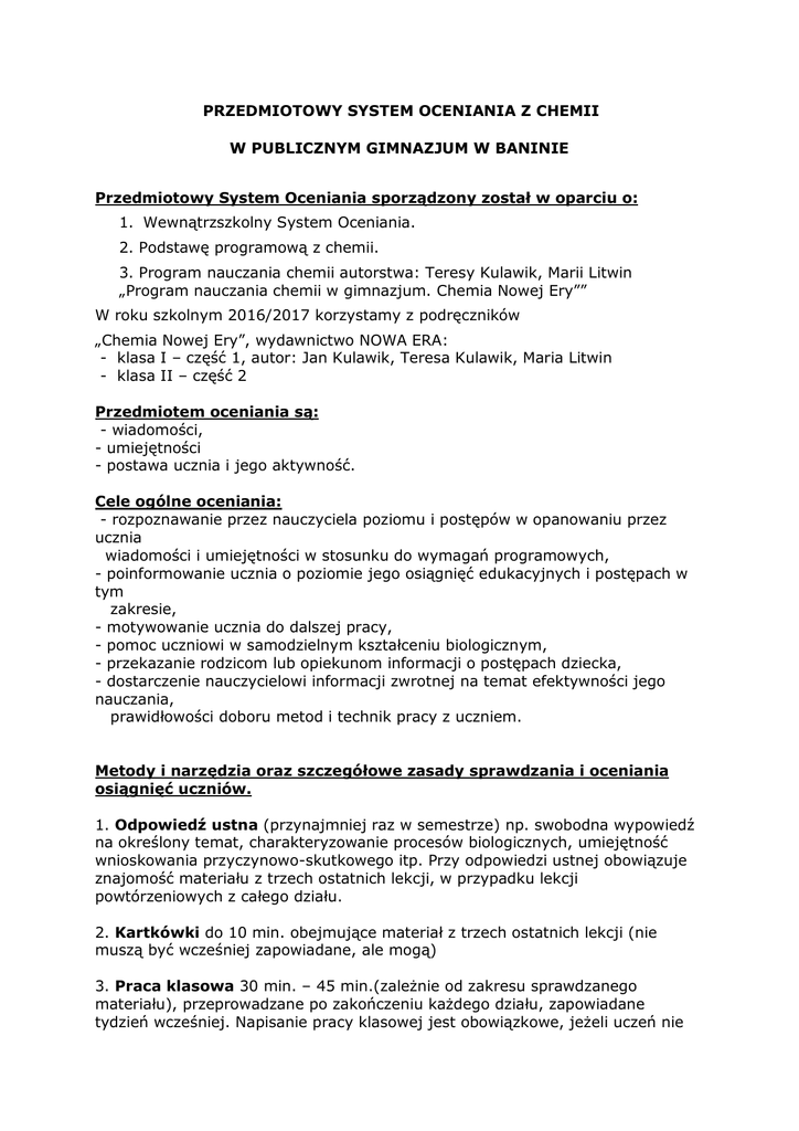 PRZEDMIOTOWY SYSTEM OCENIANIA Z CHEMII W PUBLICZNYM GIMNAZJUM W BANINIE Przedmiotowy System Oceniania sporządzony został w oparciu o: 1. Wewnątrzszkolny System Oceniania. 2. Podstawę programową z chemii. 3. Program nauczania chemii autorstwa: Teresy Kulawik, Marii Litwin „Program nauczania chemii w gimnazjum. Chemia Nowej Ery”” W roku szkolnym 2016/2017 korzystamy z podręczników „Chemia Nowej Ery”, wydawnictwo NOWA ERA: - klasa I – część 1, autor: Jan Kulawik, Teresa Kulawik, Maria Litwin - klasa II – część 2 Przedmiotem oceniania są: - wiadomości, - umiejętności - postawa ucznia i jego aktywność. Cele ogólne oceniania: - rozpoznawanie przez nauczyciela poziomu i postępów w opanowaniu przez ucznia wiadomości i umiejętności w stosunku do wymagań programowych, - poinformowanie ucznia o poziomie jego osiągnięć edukacyjnych i postępach w tym zakresie, - motywowanie ucznia do dalszej pracy, - pomoc uczniowi w samodzielnym kształceniu biologicznym, - przekazanie rodzicom lub opiekunom informacji o postępach dziecka, - dostarczenie nauczycielowi informacji zwrotnej na temat efektywności jego nauczania, prawidłowości doboru metod i technik pracy z uczniem. Metody i narzędzia oraz szczegółowe zasady sprawdzania i oceniania osiągnięć uczniów. 1. Odpowiedź ustna (przynajmniej raz w semestrze) np. swobodna wypowiedź na określony temat, charakteryzowanie procesów biologicznych, umiejętność wnioskowania przyczynowo-skutkowego itp. Przy odpowiedzi ustnej obowiązuje znajomość materiału z trzech ostatnich lekcji, w przypadku lekcji powtórzeniowych z całego działu. 2. Kartkówki do 10 min. obejmujące materiał z trzech ostatnich lekcji (nie muszą być wcześniej zapowiadane, ale mogą) 3. Praca klasowa 30 min. – 45 min.(zależnie od zakresu sprawdzanego materiału), przeprowadzane po zakończeniu każdego działu, zapowiadane tydzień wcześniej. Napisanie pracy klasowej jest obowiązkowe, jeżeli uczeń nie pisała pracy klasowej z przyczyn losowych, powinien go napisać w terminie nieprzekraczającym 2 tygodnie od powrotu do szkoły. Czas i sposób do uzgodnienia z nauczycielem. Prace pisemne powinny być ocenione i oddane w ciągu 2 tygodni. Ocenę niedostateczną ze sprawdzianu można poprawić. Poprawa jest dobrowolna, odbywa się poza lekcjami, w ciągu 2 tygodni od rozdania prac i tylko 1 raz. Przy pisaniu poprawy sprawdzianu punktacja nie zmienia się, otrzymane oceny są wpisywane do dziennika. Wszystkie prace są archiwizowane do końca danego roku szkolnego – rodzice uczniów mogą je zobaczyć i otrzymać uzasadnienie wystawionej oceny. Po dłuższej nieobecności w szkole z przyczyn losowych uczeń ma możliwość uzupełnienia zaległości w ciągu dwóch tygodni od przybycia do szkoły. 4. Aktywność ucznia: czyli zaangażowanie w tok lekcji, udział w dyskusji, uzupełnianie dodatkowych ćwiczeń, wypełnianie kart pracy, praca w grupach, korzystanie z różnych źródeł informacji, wypowiedzi podczas rozwiązywania problemów. Aktywność uczniów oceniana jest „+” ( trzy „+” = ocena bardzo dobra) 5.W ocenianiu prac klasowych przyjmuje się skalę punktową przeliczaną na oceny cyfrowe wg kryteriów : celujący bardzo dobry dobry dostateczny dopuszczający niedostateczny - 100%-98% 97% - 90% 89% - 70% 69% - 50% 49% - 30% 29% - 0% 6. Zeszyt przedmiotowy– sprawdzany jeden raz w semestrze biorąc pod uwagę staranność i systematyczność prowadzenia zapisów. W przypadku nieobecności uczeń musi jak najszybciej uzupełnić brakujące tematy w zeszycie przedmiotowym. 7. Nauczyciel ma możliwość zadawania prac domowych, które uczeń może wykonać w sobotę lub niedzielę. Sposoby informowania uczniów. Na początku roku szkolnego nauczyciel zapoznaje uczniów z wymaganiami programowymi na poszczególne oceny oraz informuje o sposobie oceniania (PSO). Oceny cząstkowe są jawne, oparte o opracowane kryteria. Sposoby informowania rodziców. O ocenach cząstkowych i klasyfikacyjnych informuje się rodziców na zebraniach, wywiadówkach lub w czasie indywidualnych spotkań z rodzicami. Rodzice na bieżąco mogą monitorować oceny w dzienniku elektronicznym. Informacje o grożącej ocenie niedostatecznej klasyfikacyjnej jest przekazywane zgodnie z procedurą WSO. Zasady wystawiania oceny za I półrocze i końcoworocznej. Wystawianie oceny klasyfikacyjnej dokonuje się na podstawie ocen cząstkowych, przy czym większą wagę mają oceny z prac klasowych i sprawdzianów, kolejno kartkówki i odpowiedź ustna. Pozostałe oceny są wspomagające. Laureaci konkursu o zasięgu wojewódzkim otrzymują celującą roczną ocenę klasyfikacyjną. Sposoby korygowania niepowodzeń szkolnych i podnoszenia osiągnięć uczniów. 1. Możliwość poprawy oceny z pracy klasowej. 2. Umożliwienie zwolnienia z pracy klasowej, kartkówki lub odpowiedzi ustnej w wyjątkowych przypadkach losowych, np. na pisemną prośbę rodzica. 3. Uzupełnienie braków z przedmiotu w ramach konsultacji z nauczycielem w przypadku, gdy uczeń zgłosi chęć uzupełnienia braków wiedzy i umiejętności z przedmiotu. 4. Rozwijanie zainteresowań i poszerzanie wiadomości na zajęciach koła biologicznego. 5.Uczeń ma obowiązek napisania wszystkich zaplanowanych prac klasowych w danym roku szkolnym (poprawy prac klasowych w/g zasad podanych powyżej). Opracowała: Anna Borowicz