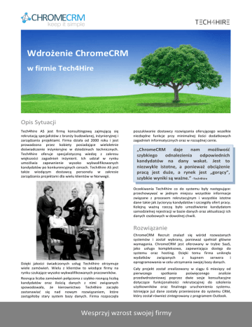 Wdrożenie ChromeCRM w firmie Tech4Hire Opis Sytuacji Tech4hire AS jest firmą konsultingową zajmującą się rekrutacją specjalistów z branży budowlanej, inżynieryjnej i zarządzania projektami. Firma działa od 2000 roku i jest prowadzona przez kobiety posiadające wieloletnie doświadczenie inżynieryjne w dziedzinach technicznych. Tech4hire oferuje specjalistyczną wiedzę z zakresu większości zagadnień inżynierii. Ich udział w rynku umożliwia zapewnienie wysoko wykwalifikowanych kandydatów po konkurencyjnych cenach. Tech4hire AS jest także wiodącym dostawcą personelu w zakresie zarządzania projektami dla wielu klientów w Norwegii. poszukiwanie dostawcy rozwiązania oferującego wszelkie niezbędne funkcje przy minimalnej ilości dodatkowych zagadnień informatycznych oraz w rozsądnej cenie. „ChromeCRM daje nam możliwość szybkiego odnalezienia odpowiednich kandydatów na dany wakat. Jest to niezwykle istotne, a ponieważ obciążenie pracą jest duże, a rynek jest „gorący”, szybkie wyniki są ważne.” -Tech4hire Oczekiwania Tech4hire co do systemu były następujące: przechowywać w jednym miejscu wszystkie informacje związane z procesem rekrutacyjnym i wszystkie istotne dane takie jak życiorysy kandydatów i szczegóły ofert pracy. Kolejną ważną rzeczą było umożliwienie kandydatom samodzielnej rejestracji w bazie danych oraz aktualizacji ich danych osobowych w dowolnej chwili. Rozwiązanie Dzięki jakości świadczonych usług Tech4hire otrzymuje wiele zamówień. Wielu z klientów to wiodące firmy na rynku szukające wysoko wykwalifikowanych pracowników. Rosnąca liczba zamówień połączona z szybko rosnącą liczbą kandydatów oraz ilością danych z nimi związanych spowodowała, że kierownictwo Tech4hire zaczęło zastanawiać się nad nowym rozwiązaniem, które zastąpiłoby stary system bazy danych. Firma rozpoczęła ChromeCRM Recruit znalazł się wśród rozważanych systemów i został wybrany, ponieważ spełniał główne wymagania. ChromeCRM jest oferowany w trybie SaaS, jako usługa kompleksowa, zapewniająca dostęp do systemu oraz hosting. Dzięki temu firma uniknęła wydatków związanych z kupnem serwera i oprogramowania w celu utrzymania swojej bazy danych. Cały projekt został zrealizowany w ciągu 6 miesięcy od pierwszego spotkania poświęconego analizie przedwdrożeniowej poprzez dwie sesje konsultacyjne dotyczące funkcjonalności rekrutacyjnej do szkolenia użytkowników oraz finalnego uruchomienia systemu. Istniejące już dane zostały przeniesione do systemu CRM, który został również zintegrowany z programem Outlook. Wesprzyj wzrost swojej firmy Dzisiaj kandydat rejestruje się przez Internet do ChromeCRM Recruit za pomocą Portalu Kandydata uruchamianego przez link ze strony internetowej firmy. Po zakończonej rejestracji użytkownicy systemu w biurze Tech4hire otrzymują informację o wprowadzeniu nowego kandydata. Podobnie, kiedy pojawia się nowa oferta pracy od klienta i zostaje wprowadzona do systemu, wszyscy koordynatorzy personelu są zawiadamiani o potrzebie obsadzenia nowego wakatu. przycisku”, ponieważ powstają one na podstawie uprzednio zdefiniowanego wzoru z wykorzystaniem informacji przechowywanych w systemie. „Dodatkową zaletą jest to, że kiedy potrzebujemy dodatkowej pomocy, reakcja jest szybka i zawsze z pozytywnym skutkiem” -Tech4hire Prosty i przyjazny wobec użytkownika interfejs skrócił wymagany okres szkolenia i przyspieszył wprowadzenie systemu, co zostało dokonane bez jakiejkolwiek przerwy w działalności Tech4hire. Również nowi użytkownicy, którzy rozpoczęli pracę w Tech4hire po wdrożeniu ChromeCRM Recruit, zaczęli pracować z systemem i nie potrzebowali żadnego dodatkowego długiego szkolenia. Wszyscy oni posługują się dostarczonymi funkcjami CRM. www.tech4hire.no Kim jesteśmy Zdolność śledzenia nowych wpisów – kandydatów lub złożonych ofert – jest jedynie częścią sukcesu. Dzięki integracji systemu z programem poczty elektronicznej, wszelka komunikacja z klientami i kandydatami związana z projektami rekrutacyjnymi jest przechowywana i odpowiednio oznaczana. Dzięki temu kierownictwo firmy może śledzić każdy proces rekrutacji i prowadzić działalność z dowolnego miejsca. Jedynym niezbędnym warunkiem dostępu do ChromeCRM jest komputer podłączony do Internetu. To wielka zaleta tego systemu zwłaszcza w sytuacji, kiedy konsultanci rekrutacyjni i kierownicy muszą często podróżować – będąc poza biurem w dalszym ciągu mogą dotrzeć do wszystkich aktualnych informacji natychmiast i o każdej porze. Informacje o potencjalnych kandydatach na dane stanowisko mogą być prezentowane w formie jednolitego wzoru CV firmy Tech4hire lub własne CV kandydata może zostać przesłane klientowi. Kolejną cechą ChromeCRM Recruit pozwalająca na znaczne skrócenie czasu pracy jest integracja systemowa ze stroną internetową firmy. Po tym jak szczegóły oferty pracy zostały wprowadzone do ChromeCRM Recruit, informacja ta jest automatycznie umieszczana na ogólnodostępnej stronie internetowej. Inną zaletą ChromeCRM Recruit jest to, że teraz umowy o pracę są tworzone jedynie za „naciśnięciem ChromeCRM sp. z o.o. jest dostawcą nowoczesnego opartego na Internecie oprogramowania CRM dla średniej wielkości przedsiębiorstw. Główną zaletą ChromeCRM jest jego elastyczność i możliwość precyzyjnego dostosowania do potrzeb danej organizacji. Co robimy Internet otwiera nowe możliwości dla tworzenia bliższych i bardziej dynamicznych relacji z klientami i partnerami. Pomagamy naszym klientom wybrać najlepsze spośród nowoczesnych narzędzi i technologii, aby przy ich pomocy mogli nadal rozwijać swoje firmy na konkurencyjnym rynku. Nasze podejście Udane wdrożenie systemu CRM wymaga kompleksowego podejścia oraz współpracy opartej na zaufaniu i współdziałaniu pomiędzy klientem i dostawcą, zwłaszcza gdy poja