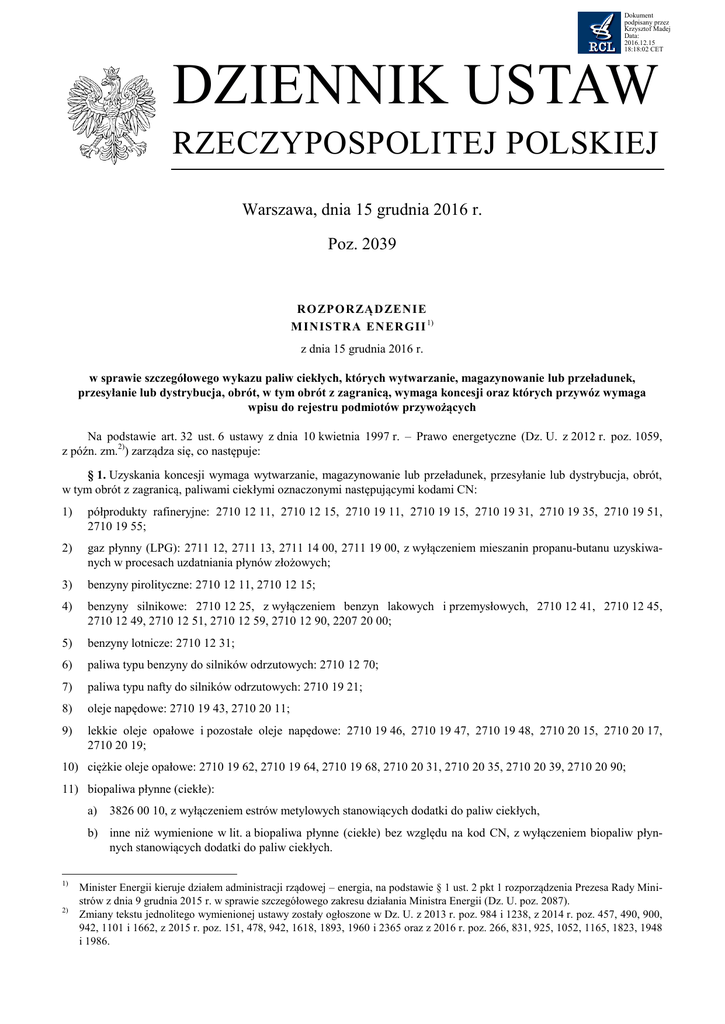 Dokument podpisany przez Krzysztof Madej Data: 2016.12.15 18:18:02 CET DZIENNIK USTAW RZECZYPOSPOLITEJ POLSKIEJ Warszawa, dnia 15 grudnia 2016 r. Poz. 2039 RO ZPO RZĄDZENIE M INISTRA ENERGII 1) z dnia 15 grudnia 2016 r. w sprawie szczegółowego wykazu paliw ciekłych, których wytwarzanie, magazynowanie lub przeładunek, przesyłanie lub dystrybucja, obrót, w tym obrót z zagranicą, wymaga koncesji oraz których przywóz wymaga wpisu do rejestru podmiotów przywożących Na podstawie art. 32 ust. 6 ustawy z dnia 10 kwietnia 1997 r. – Prawo energetyczne (Dz. U. z 2012 r. poz. 1059, z późn. zm.2)) zarządza się, co następuje: § 1. Uzyskania koncesji wymaga wytwarzanie, magazynowanie lub przeładunek, przesyłanie lub dystrybucja, obrót, w tym obrót z zagranicą, paliwami ciekłymi oznaczonymi następującymi kodami CN: 1) półprodukty rafineryjne: 2710 12 11, 2710 12 15, 2710 19 11, 2710 19 15, 2710 19 31, 2710 19 35, 2710 19 51, 2710 19 55; 2) gaz płynny (LPG): 2711 12, 2711 13, 2711 14 00, 2711 19 00, z wyłączeniem mieszanin propanu-butanu uzyskiwanych w procesach uzdatniania płynów złożowych; 3) benzyny pirolityczne: 2710 12 11, 2710 12 15; 4) benzyny silnikowe: 2710 12 25, z wyłączeniem benzyn lakowych i przemysłowych, 2710 12 41, 2710 12 45, 2710 12 49, 2710 12 51, 2710 12 59, 2710 12 90, 2207 20 00; 5) benzyny lotnicze: 2710 12 31; 6) paliwa typu benzyny do silników odrzutowych: 2710 12 70; 7) paliwa typu nafty do silników odrzutowych: 2710 19 21; 8) oleje napędowe: 2710 19 43, 2710 20 11; 9) lekkie oleje opałowe i pozostałe oleje napędowe: 2710 19 46, 2710 19 47, 2710 19 48, 2710 20 15, 2710 20 17, 2710 20 19; 10) ciężkie oleje opałowe: 2710 19 62, 2710 19 64, 2710 19 68, 2710 20 31, 2710 20 35, 2710 20 39, 2710 20 90; 11) biopaliwa płynne (ciekłe): a) 3826 00 10, z wyłączeniem estrów metylowych stanowiących dodatki do paliw ciekłych, b) inne niż wymienione w lit. a biopaliwa płynne (ciekłe) bez względu na kod CN, z wyłączeniem biopaliw płynnych stanowiących dodatki do paliw ciekłych. 1) 2) Minister Energii kieruje działem administracji rządowej – energia, na podstawie § 1 ust. 2 pkt 1 rozporządzenia Prezesa Rady Ministrów z dnia 9 grudnia 2015 r. w sprawie szczegółowego zakresu działania Ministra Energii (Dz. U. poz. 2087). Zmiany tekstu jednolitego wymienionej ustawy zostały ogłoszone w Dz. U. z 2013 r. poz. 984 i 1238, z 2014 r. poz. 457, 490, 900, 942, 1101 i 1662, z 2015 r. poz. 151, 478, 942, 1618, 1893, 1960 i 2365 oraz z 2016 r. poz. 266, 831, 925, 1052, 1165, 1823, 1948 i 1986. Dziennik Ustaw –2– Poz. 2039 § 2. Wpisu do rejestru podmiotów przywożących wymaga przywóz paliw ciekłych oznaczonych następującymi kodami CN: 1) półprodukty rafineryjne: 2710 12 11, 2710 12 15, 2710 19 11, 2710 19 15, 2710 19 31, 2710 19 35, 2710 19 51, 2710 19 55; 2) gaz płynny (LPG): 2711 12, 2711 13 , 2711 14 00, 2711 19 00, 2901 10 00; 3) benzyny pirolityczne: 2710 12 11, 2710 12 15; 4) benzyny silnikowe: 2710 12 25, z wyłączeniem benzyn lakowych i przemysłowych, 2710 12 41, 2710 12 45, 2710 12 49, 2710 12 51, 2710 12 59, 2710 12 90, 2207 20 00; 5) benzyny lotnicze: 2710 12 31; 6) paliwa typu benzyny do silników odrzutowych: 2710 12 70; 7) paliwa typu nafty do silników odrzutowych: 2710 19 21; 8) inne nafty: 2710 19 25, 2710 19 29; 9) oleje napędowe: 2710 19 43, 2710 20 11; 10) lekkie oleje opałowe i pozostałe oleje napędowe: 2710 19 46, 2710 19 47, 2710 19 48, 2710 20 15, 2710 20 17, 2710 20 19; 11) ciężkie oleje opałowe: 2710 19 62, 2710 19 64, 2710 19 68, 2710 20 31, 2710 20 35, 2710 20 39, 2710 20 90, 2707 99 19, 2707 99 91, 2707 99 99; 12) benzyny lakowe i przemysłowe: 2710 12 21, 2710 12 25; 13) biopaliwa płynne (ciekłe): a) 3826 00 10, z wyłączeniem estrów metylowych stanowiących dodatki do paliw ciekłych, b) inne niż wymienione w lit. a biopaliwa płynne (ciekłe) bez względu na kod CN, z wyłączeniem biopaliw płynnych stanowiących dodatki do paliw ciekłych; 14) smary: 2710 19 71, 2710 19 75, 2710 19 81, 2710 19 83, 2710 19 85, 2710 19 87, 2710 19 91, 2710 19 93, 2710 19 99. § 3. Rozporządzenie wchodzi w życie z dniem następującym po dniu ogłoszenia. Minister Energii: K. Tchórzewski