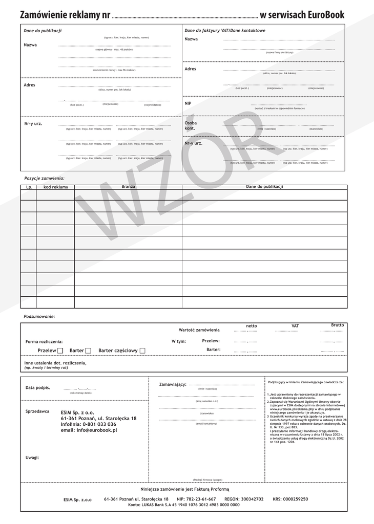 Zamówienie reklamy nr .................................................................................................................. w serwisach EuroBook Dane do faktyury VAT/Dane kontaktowe Dane do publikacji (typ urz. kier. kraju, kier miasta, numer) Nazwa Nazwa .................................................................................................... .................................................................................................... .................................................................................................... (nazwa główna - max. 48 znaków) (nazwa firmy do faktury) .................................................................................................... ------------------------------------------------------------------------------------------------------- .................................................................................................... Adres (rozszerzenie nazwy - max 96 znaków) .................................................................................................... (ulica, numer pos. lok lokalu) ------------------------------------------------------------------------------------------------------Adres .....-.......... .................................................................................. .................................................................................................... (kod poczt.) (ulica, numer pos. lok lokalu) .....-.......... .................................................................................. (kod poczt.) (miejscowosc) (województwo) (miejscowosc) (miejscowosc) ------------------------------------------------------------------------------------------------------- R Ó NIP .................................................. (wpisać z kreskami w odpowiednim formacie) ------------------------------------------------------------------------------------------------------- ------------------------------------------------------------------------------------------------------Nr-y urz. ................................................. ................................................. (typ urz. kier. kraju, kier miasta, numer) (typ urz. kier. kraju, kier miasta, numer) ................................................. ................................................. Osoba kont. (typ urz. kier. kraju, kier miasta, numer) Nr-y urz. ................................................. ................................................. (typ urz. kier. kraju, kier miasta, numer) Pozycje zamwienia: (typ urz. kier. kraju, kier miasta, numer) Branża kod reklamy (stanowisko) (imię i nazwisko) ------------------------------------------------------------------------------------------------------- Z W (typ urz. kier. kraju, kier miasta, numer) Lp. .................................................................. ................................ ................................................. ................................................. (typ urz. kier. kraju, kier miasta, numer) (typ urz. kier. kraju, kier miasta, numer) ................................................. ................................................. (typ urz. kier. kraju, kier miasta, numer) (typ urz. kier. kraju, kier miasta, numer) Dane do publikacji Podsumowanie: Wartość zamówienia netto VAT Brutto ........... , ....... ........... , ....... ........... , ....... Przelew: ........... , ....... W tym: Forma rozliczenia: ........... , ....... Barter: ........... , ....... Przelew Barter Barter częściowy ........... , ....... ---------------------------------------------------------------------------------------------------------------------------------------------------------------------------------------------------------------Inne ustalenia dot. rozliczenia, ............ -.......-....... (rok-miesiąc-dzień) Zamawiający: (imie i nazwisko) ...................................................................................... ---------------------------------------------------------------------------------Sprzedawca ESIM Sp. z o.o. 61-361 Poznań, ul. Starołęcka 18 Infolinia: 0-801 033 036 email: [email protected] Uwagi: ........................................................... (imię nazwisko c.d.) ...................................................................................... (stanowisko) ...................................................................................... (email kontaktowy) (Piedzęć firmowa i podpis) -------------------------------------------------------------------- Data podpis. -------------------------------------------------------------------- (np. kwoty i terminy rat) Podpisujący w imieniu Zamawiającego oświadcza że: 1. Jest uprawniony do reprezentacji zamawiącego w zakresie złożonego zamówienia. 2. Zapoznał się Warunkami Ogólnymi Umowy obowiązujacymi w ESIM dostępnymi na stronie internetowej www.eurobook.pl/reklama.php w dniu podpisania niniejszego zamówienia i je akceptuje. 3 Uczestnik konkursu wyraża zgodę na przetwarzanie swoich danych osobowych zgodnie w ustawą z dnia 28 sierpnia 1997 roku o ochronie danych osobowych, Dz. U. Nr 133, poz 883. i przesylanie informacji handlowy drogą elektroniczną w rozumieniu Ustawy z dnia 18 lipca 2002 r. o świadczeniu usług drogą elektroniczną Dz.U. 2002 nr 144 poz. 1204. ---------------------------------------------------------------------------------------------------------------------------------------------------------------------------------------------------------------Niniejsze zamówienie jest Fakturą Proformą ESIM Sp. z.o.o 61-361 Poznań ul. Starołęcka 18 NIP: 782-23-61-667 REGON: 300342702 Konto: LUKAS Bank S.A 45 1940 1076 3012 4983 0000 0000 KRS: 0000259250 Zamówienie reklamy nr .................................................................................................................. w serwisach EuroBook Dane do faktyury VAT/Dane kontaktowe Dane do pu