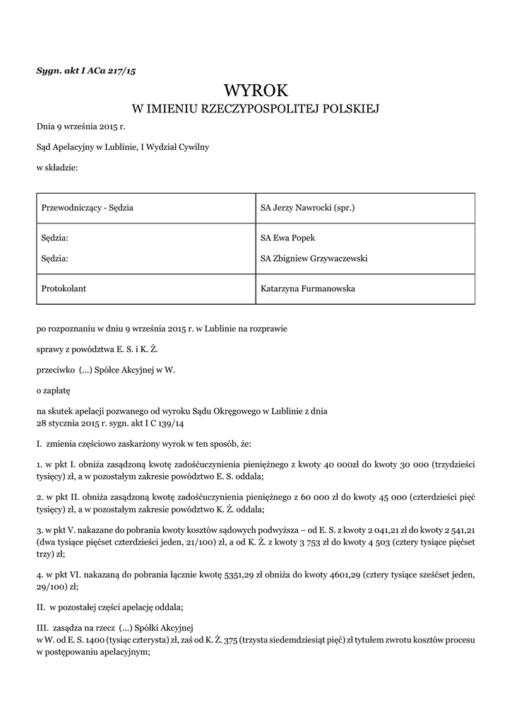 Sygn. akt I ACa 217/15 WYROK W IMIENIU RZECZYPOSPOLITEJ POLSKIEJ Dnia 9 września 2015 r. Sąd Apelacyjny w Lublinie, I Wydział Cywilny w składzie: Przewodniczący - Sędzia SA Jerzy Nawrocki (spr.) Sędzia: SA Ewa Popek Sędzia: SA Zbigniew Grzywaczewski Protokolant Katarzyna Furmanowska po rozpoznaniu w dniu 9 września 2015 r. w Lublinie na rozprawie sprawy z powództwa E. S. i K. Ż. przeciwko (...) Spółce Akcyjnej w W. o zapłatę na skutek apelacji pozwanego od wyroku Sądu Okręgowego w Lublinie z dnia 28 stycznia 2015 r. sygn. akt I C 139/14 I. zmienia częściowo zaskarżony wyrok w ten sposób, że: 1. w pkt I. obniża zasądzoną kwotę zadośćuczynienia pieniężnego z kwoty 40 000zł do kwoty 30 000 (trzydzieści tysięcy) zł, a w pozostałym zakresie powództwo E. S. oddala; 2. w pkt II. obniża zasądzoną kwotę zadośćuczynienia pieniężnego z 60 000 zł do kwoty 45 000 (czterdzieści pięć tysięcy) zł, a w pozostałym zakresie powództwo K. Ż. oddala; 3. w pkt V. nakazane do pobrania kwoty kosztów sądowych podwyższa – od E. S. z kwoty 2 041,21 zł do kwoty 2 541,21 (dwa tysiące pięćset czterdzieści jeden, 21/100) zł, a od K. Ż. z kwoty 3 753 zł do kwoty 4 503 (cztery tysiące pięćset trzy) zł; 4. w pkt VI. nakazaną do pobrania łącznie kwotę 5351,29 zł obniża do kwoty 4601,29 (cztery tysiące sześćset jeden, 29/100) zł; II. w pozostałej części apelację oddala; III. zasądza na rzecz (...) Spółki Akcyjnej w W. od E. S. 1400 (tysiąc czterysta) zł, zaś od K. Ż. 375 (trzysta siedemdziesiąt pięć) zł tytułem zwrotu kosztów procesu w postępowaniu apelacyjnym; IV. nakazuje pobrać na rzecz Skarbu Państwa – Sądu Okręgowego w Lublinie od (...) Spółki Akcyjnej w W. 153(sto pięćdziesiąt trzy) zł tytułem brakującej części opłaty sądowej od apelacji; w pozostałym zakresie nieuiszczone koszty sądowe przejmuje na rachunek Skarbu Państwa. I A Ca 217/15 UZASADNIENIE Pozwem z dnia 7 lutego 2014 roku E. S. żądała zasądzenia na jej rzecz 60 000zł tytułem zadośćuczynienia i 45 000zł tytułem odszkodowania, a K. Ż. odpowiednio kwot 75 000zł zadośćuczynienia i 60 000zł odszkodowania od pozwanego (...) Spółki Akcyjnej w W., w związku ze śmiercią ojca T. Ż. w wypadku komunikacyjnym w dniu 30 czerwca 2007r. , w każdym przypadku z ustawowymi odsetkami od dnia 21 czerwca 2013 roku do dnia zapłaty (petitum pozwu k. 2-4). Wyrokiem z dnia 28 stycznia 2015 roku Sąd Okręgowy w Lublinie po rozpoznaniu na rozprawie w dniu 14 stycznia 2015 roku w L. sprawy z powództwa E. S. i K. Ż. przeciwko (...) Towarzystwu Ubezpieczeń Spółkce Akcyjnej w W. o zapłatę zadośćuczynienia zasądził od pozwanego na rzecz E. S. kwotę 40.000zł, zaś na rzecz K. Ż. kwotę 60.000zł z ustawowymi odsetkami od dnia 21 czerwca 2013 roku do dnia zapłaty W pozostałej części powództwo oddalił. Zniósł pomiędzy stronami koszty postępowania; Nakazał pobrać na rzecz Skarbu Państwa Sądu Okręgowego tytułem nieuiszczonych kosztów sądowych z zasądzonych w pkt I i II kwot - od E. S. 2.041,21zł, od K. Ż. 3.753,00zł; zaś od pozwanego Towarzystwa 2.354,29zł i 2.997zł. Apelację od powyższego wyroku wniosło pozwane Towarzystwo zaskarżając go w części zasądzającej zadośćuczynienie w kwocie ponad 30 000zł na rzecz każdego z powodów oraz w części zasądzającej odsetki ustawowe od całych zasądzonych kwot począwszy od dnia 21 czerwca 2013r. Apelujący zarzucał Sądowi pierwszej instancji 1. naruszenie prawa materialnego - art. 448 k.c. w zw. z art. 23 k.c. poprzez zasądzenie zadośćuczynienia w wysokości nadmiernej wygórowanej, nieodpowiedniej w rozumieniu art. 448 k.c. w okolicznościach faktycznych sprawy i art. 481 § 1 k.c. w zw. z art. 817 § 1 k.c. poprzez uznanie, iż doszło do opóźnienia w zapłacie zadośćuczynienia wobec strony powodowej z dniem 21 czerwca 2013 r., podczas gdy wysokość zadośćuczynienia została ustalona przez Sąd, dopiero w wydanym w dniu 28 stycznia 2015 r. wyroku; 2. naruszenie prawa procesowego - art. 233 § 1 k.p.c. polegające na dowolnej a nie swobodnej ocenie dowodów oraz nie wszechstronnym rozważeniu materiału dowodowego, skutkującym niewłaściwym przyjęciem przez Sąd orzekający, iż łączna kwota 100 000 zł zasądzona na rzecz powodów tytułem zadośćuczynienia stanowi sumę adekwatną do ustalonych w sprawie cierpień strony powodowej, podczas gdy kwota ta stanowi wartość nadmierną i nieodpowiednią w stosunku do doznanej krzywdy w związku ze śmiercią H. Ż.. Apelujący wnosił o zmianę zaskarżonego wyroku w pkt. I i II przez oddalenie powództwa ponad kwotę 30 000zł oraz wskazanie terminu początkowego naliczania odsetek ustawowych od dnia wydania wyroku i oddalenia powództwa w zakresie żądania odsetek ustawowych od dnia 21 czerwca 2013r. Ponadto wnosił o zasądzenie od powoda na rzecz pozwanego kosztów postępowania odwoławczego, w tym kosztów zastępstwa procesowego według norm przepisanych, ewentualnie uchylenie zaskarżonego wyroku i przekazanie sprawy Sądowi I instancji do ponownego rozpatrzenia. Ustalając wysokość zadośćuczynienia Sąd Okręgowy ustalił i zważył co następuje. W dniu 30 czerwca 2007 roku w miejscowości A. kierujący samochodem marki R. o numerze rejestracyjnym (...) T. T. nie zachowując bezpiecznej i dozwolonej prędkości, zbliżając się do oznakowanego skrzyżowania i przejścia dla pieszych zbyt późno zatrzymał się uderzając przechodzącego przez jezdnię w miejscu nieoznakowanym, jako przejście dla pieszych, pieszego H. Ż.. W wyniku tego H. Ż. doznał ciężkich wielonarządowych obrażeń ciała, które doprowadziły do jego śmierci Sprawca zdarzenia T. T. wyrokiem Sądu Rejonowego w Lublinie wydanym w sprawie (...) uznany został za winnego zarzucanego mu czynu i skazany na karę roku i sześciu miesięcy pozbawienia wolności z warunkowym zawieszeniem wykonania kary na 4 l