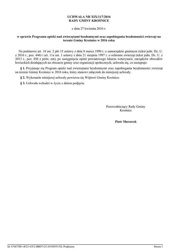 UCHWAŁA NR XIX/117/2016 RADY GMINY KROŚNICE z dnia 27 kwietnia 2016 r. w sprawie Programu opieki nad zwierzętami bezdomnymi oraz zapobiegania bezdomności zwierząt na terenie Gminy Krośnice w 2016 roku Na podstawie art. 18 ust. 2 pkt 15 ustawy z dnia 8 marca 1990 r. o samorządzie gminnym (tekst jedn. Dz. U. z 2016 r., poz. 446) i art. 11a ust. 1 ustawy z dnia 21 sierpnia 1997 r. o ochronie zwierząt (tekst jedn. Dz. U. z 2013 r., poz. 856 z późn. zm), po zasięgnięciu opinii powiatowego lekarza weterynarii, zarządców obwodów łowieckich działających na obszarze gminy oraz organizacji społecznych, uchwala się, co następuje: § 1. Przyjmuje się Program opieki nad zwierzętami bezdomnymi oraz zapobiegania bezdomności zwierząt na terenie Gminy Krośnice w 2016 roku, który stanowi załącznik do niniejszej uchwały. § 2. Wykonanie niniejszej uchwały powierza się Wójtowi Gminy Krośnice. § 3. Uchwała wchodzi w życie z dniem podjęcia. Przewodniczący Rady Gminy Krośnice Piotr Morawek Id: 676875B1-4F23-41F2-BBD7-CCA91093913D. Podpisany Strona 1 Załącznik do Uchwały Nr XIX/117/2016 Rady Gminy Krośnice z dnia 27 kwietnia 2016 r. Program opieki nad zwierzętami bezdomnymi oraz zapobiegania bezdomności zwierząt na terenie Gminy Krośnice w 2016 roku Rozdział 1. Przepisy Ogólne § 1. Ilekroć w programie jest mowa o: 1. Programie – należy przez to rozumieć Program opieki nad zwierzętami bezdomnymi oraz zapobiegania bezdomności zwierząt na terenie Gminy Krośnice w 2016 roku. 2. Schronisku – należy przez to rozumieć schronisko dla bezdomnych zwierząt. 3. Ustawie - należy przez to rozumieć Ustawę z dnia 21 sierpnia 1997 r. o ochronie zwierząt (tekst jedn. Dz. U. z 2013 r. poz. 856 z późn. zm.). § 2. 1. Koordynatorem Programu jest Wójt Gminy Krośnice. 2. Wykonawcami programu są: a) Urząd Gminy Krośnice, b) Przedsiębiorca świadczący usługę w zakresie ochrony przed bezdomnymi zwierzętami na terenie Gminy Krośnice posiadający zezwolenie (decyzję) Wójta Gminy Krośnice na prowadzenie przedmiotowej działalności - firma PPHU „MarMac” Marcin Kolenda z/s przy ul. 3 Maja 12/VI, 56-400 Oleśnica (na podstawie umowy podpisanej z gminą), c) Schroniska dla Zwierząt (na podstawie umów/zleceń podpisanych z gminą), d) Organizacje społeczne, stowarzyszenia, fundacje, których statutowym celem działania jest przeciwdziałanie bezdomności zwierząt we współpracy z organami gminy. Rozdział 2. Cel i zadania programu § 3. 1. Celem programu jest zapobieganie bezdomności zwierząt na terenie Gminy Krośnice oraz opieka nad zwierzętami bezdomnymi. 2. Cel programu realizowany będzie poprzez następujące zadania: a) Sprawowanie opieki nad zwierzętami oraz ich odławianie w szczególności: - opieka nad wolno żyjącymi kotami, w tym ich dokarmianie, - zapewnienie bezdomnym zwierzętom miejsca w schronisku dla zwierząt, - zapewnienie miejsca dla zwierząt gospodarskich w wybranym gospodarstwie rolnym, - odławianie bezdomnych zwierząt, - zapewnienie całodobowej opieki weterynaryjnej w przypadku zdarzeń drogowych z udziałem zwierząt. b) Ograniczanie populacji bezdomnych zwierząt oraz promowanie adopcji zwierząt w szczególności: - obligatoryjną sterylizację albo kastrację zwierząt w schronisku dla zwierząt, - usypianie ślepych miotów, - poszukiwanie właścicieli dla bezdomnych zwierząt. Rozdział 3. Opieka nad zwierzętami oraz ich odławianie § 4. Opiekę nad wolno żyjącymi kotami, w tym ich dokarmianie realizuje Urząd Gminy Krośnice poprzez: Id: 676875B1-4F23-41F2-BBD7-CCA91093913D. Podpisany Strona 1 1. przyjmowanie zgłoszeń o miejscach przebywania kotów wolno żyjących; 2. podejmowanie interwencji w sprawach kotów wolno żyjących; 3. zapewnienie dokarmiania w miejscach przebywania zwierząt tj. zakup i wydawanie karmy społecznym opiekunom (karmicielom) kotów wolno żyjących, którzy zadeklarują pisemnie w Urzędzie Gminy chęć sprawowania opieki nad wolno żyjącymi kotami. § 5. Odławianie bezdomnych zwierząt: 1. Na terenie Gminy prowadzi się wyłapywanie bezdomnych zwierząt na interwencję. 2. Wyłapywaniem są objęte bezdomne zwierzęta pozostawione bez opieki, w stosunku do których nie istnieje możliwość ustalenia ich właściciela lub innej osoby, pod której opieką dotychczas pozostawały, a w szczególności chore lub zagrażające życiu, zdrowiu i bezpieczeństwu ludzi. 3. Czynności odłowienia zostaną wykonane przez przedsiębiorcę, z którym Gmina podpisała umowę obejmującą w szczególności: wyłapanie (odłowienie) bezdomnych zwierząt, zapewnienie opieki weterynaryjnej oraz dowóz i umieszczenie w schronisku, a w przypadku zwierząt gospodarskich do gospodarstwa rolnego, o którym mowa w § 7 pkt.1 Programu. 4. Czynności odławiania przeprowadzi przedsiębiorca - osoba przeszkolona w tym zakresie, wyłącznie przy użyciu specjalistycznego sprzętu przeznaczonego do wyłapywania zwierząt, który nie stwarza zagrożenia dla życia i zdrowia zwierząt, a także nie będzie zadawał im cierpienia. 5. Wyłapane bezdomne zwierzęta przewożone będą środkiem transportu przystosowanym do bezpiecznego i humanitarnego przewozu zwierząt. § 6. Opieka nad bezdomnymi zwierzętami domowymi: 1. Zapewnienie bezdomnym zwierzętom miejsca w schronisku dla zwierząt Gmina realizuje poprzez umieszczanie bezdomnych zwierząt domowych w schronisku dla bezdomnych zwierząt z/s w Raciborzu, ul Adamczyka 10, w Piotrkowie Trybunalskim, ul. Małopolska 3, lub innych schroniskach prowadzonych przez organizacje społeczne, jednostki samorządu terytorialnego lub przedsiębiorców na podstawie zleceń, umów podpisywanych przez Wójta Gminy Krośnice z ww. podmiotami. 2. W przypadku braku miejsca w schroniskach dla zwierząt o których mowa w pkt 1, lub gdy wyłapanie zwierzęcia realizowane jest w związku z interwencją oficera dyżurnego KPP Milicz w dni wolne od pracy lub po godzinach prac