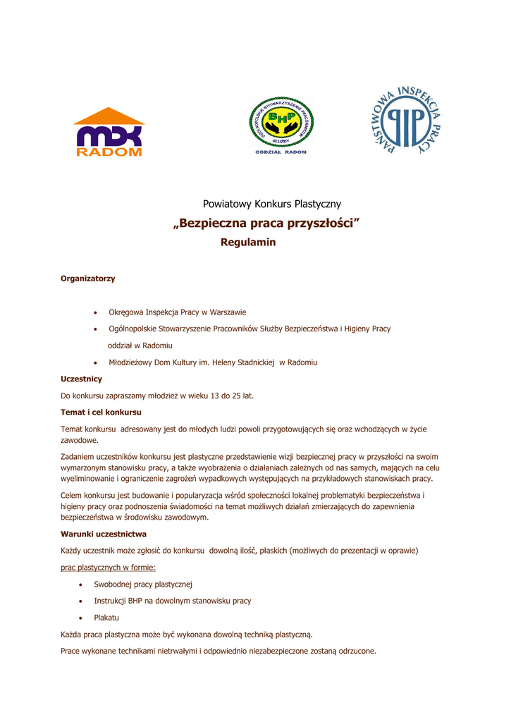 Powiatowy Konkurs Plastyczny „Bezpieczna praca przyszłości” Regulamin Organizatorzy  Okręgowa Inspekcja Pracy w Warszawie  Ogólnopolskie Stowarzyszenie Pracowników Służby Bezpieczeństwa i Higieny Pracy oddział w Radomiu  Młodzieżowy Dom Kultury im. Heleny Stadnickiej w Radomiu Uczestnicy Do konkursu zapraszamy młodzież w wieku 13 do 25 lat. Temat i cel konkursu Temat konkursu adresowany jest do młodych ludzi powoli przygotowujących się oraz wchodzących w życie zawodowe. Zadaniem uczestników konkursu jest plastyczne przedstawienie wizji bezpiecznej pracy w przyszłości na swoim wymarzonym stanowisku pracy, a także wyobrażenia o działaniach zależnych od nas samych, mających na celu wyeliminowanie i ograniczenie zagrożeń wypadkowych występujących na przykładowych stanowiskach pracy. Celem konkursu jest budowanie i popularyzacja wśród społeczności lokalnej problematyki bezpieczeństwa i higieny pracy oraz podnoszenia świadomości na temat możliwych działań zmierzających do zapewnienia bezpieczeństwa w środowisku zawodowym. Warunki uczestnictwa Każdy uczestnik może zgłosić do konkursu dowolną ilość, płaskich (możliwych do prezentacji w oprawie) prac plastycznych w formie:  Swobodnej pracy plastycznej  Instrukcji BHP na dowolnym stanowisku pracy  Plakatu Każda praca plastyczna może być wykonana dowolną techniką plastyczną. Prace wykonane technikami nietrwałymi i odpowiednio niezabezpieczone zostaną odrzucone. Każda praca powinna być opisana na odwrocie: nazwisko i imię autora, kategoria wiekowa (szkoły gimnazjalne- I , szkoły ponad gimnazjalne- II, szkoły wyższe- III ) wiek, tytuł pracy, nazwa, adres, mail lub telefon placówki macierzystej, nazwisko nauczyciela lub w przypadku zgłoszenia indywidualnego (dotyczy osób pełnoletnich) adres, mail lub telefon osobisty Prace po ocenie i ekspozycji nie będą oddawane. Prace należy składać w sekretariacie Młodzieżowego Domu Kultury w Radomiu, ul. Słowackiego 17, od pon. do pt. w godz. 7:00-18:00 lub nadsyłać na adres: Młodzieżowy Dom Kultury ul. Słowackiego 17, 26-600 Radom Z dopiskiem: „Bezpieczna praca przyszłości” Organizatorzy zastrzegają sobie możliwość popularyzacji i upowszechnienia prac konkursowych na wystawach i w wydawnictwach bez uiszczania opłaty autorskiej. Spośród prac nagrodzonych i zakwalifikowanych do wystawy pokonkursowej zostanie wybrane 12 prac do publikacji w formie kalendarza. Nagrodzeni w konkursie zostaną poinformowani mailowo lub telefonicznie o efektach pracy Jury konkursowego, a także o wszelkich zmianach w organizacji konkursu. Laureaci konkursu oraz ich opiekunowie przyjeżdżają na uroczystość wręczenia nagród na koszt własny. Nagrody nie odebrane z sekretariatu MDK w terminie 1 m-ca od dnia wręczenia nagród przechodzą na cele społeczne. Jury Organizatorzy powołają jury w skład której wejdą nauczyciele plastyki MDK, przedstawiciele Ogólnopolskiego Stowarzyszenia Pracowników Służby Bezpieczeństwa i Higieny Pracy i Państwowej Inspekcji Pracy . Jury oceni prace w trzech kategoriach wiekowych: • I – szkoły gimnazjalne • II - szkoły ponad gimnazjalne, • III - szkoły wyższe. Kryteria oceny prac plastycznych: - zgodność z tematem konkursu -czytelność pracy plastycznej i zastosowanie jednej z określonych w regulaminie form wykonania pracy konkursowej -oryginalność i pomysłowość pracy plastycznej, -walory artystyczne i estetyczne prezentowanej pracy. Laureaci konkursu uhonorowani zostaną nagrodami rzeczowymi. Jury przyzna nagrody główne w każdej kategorii oraz wyróżnienia. Decyzja komisji konkursowej jest ostateczna. Uczestnicy zakwalifikowani do wystawy pokonkursowej otrzymają dyplomy. Wszelkie kwestie sporne nie wynikające z regulaminu rozstrzygnie komisja konkursu. Protokół jury zostanie upubliczniony na stronie internetowej MDK. Terminarz Ostateczny termin składania prac konkursowych: 11 kwietnia 2015 r. Obrady Jury: między 12 a 24 kwietnia 2015 r. Przygotowanie i montaż wystawy, powiadamianie laureatów : 26 -30 kwietnia 2015 r. Wernisaż wystawy pokonkursowej, wręczenie nagród: 7 maja 2015 r. godz. 11.15 Aviator Hotel ul. Malczewskiego 18, 26-600 Radom _________________________________________________________________________________________ Na pytania w sprawie konkursu odpowiadają: Agata Chojnacka-Pyrgiel - kierownik Działu Artystycznego MDK Maria Kopciał – specjalista d.s. kadr MDK, przedstawiciel OSPSBHP pod nr tel. MDK 048 360 62 02 lub mailowo – [email protected],
