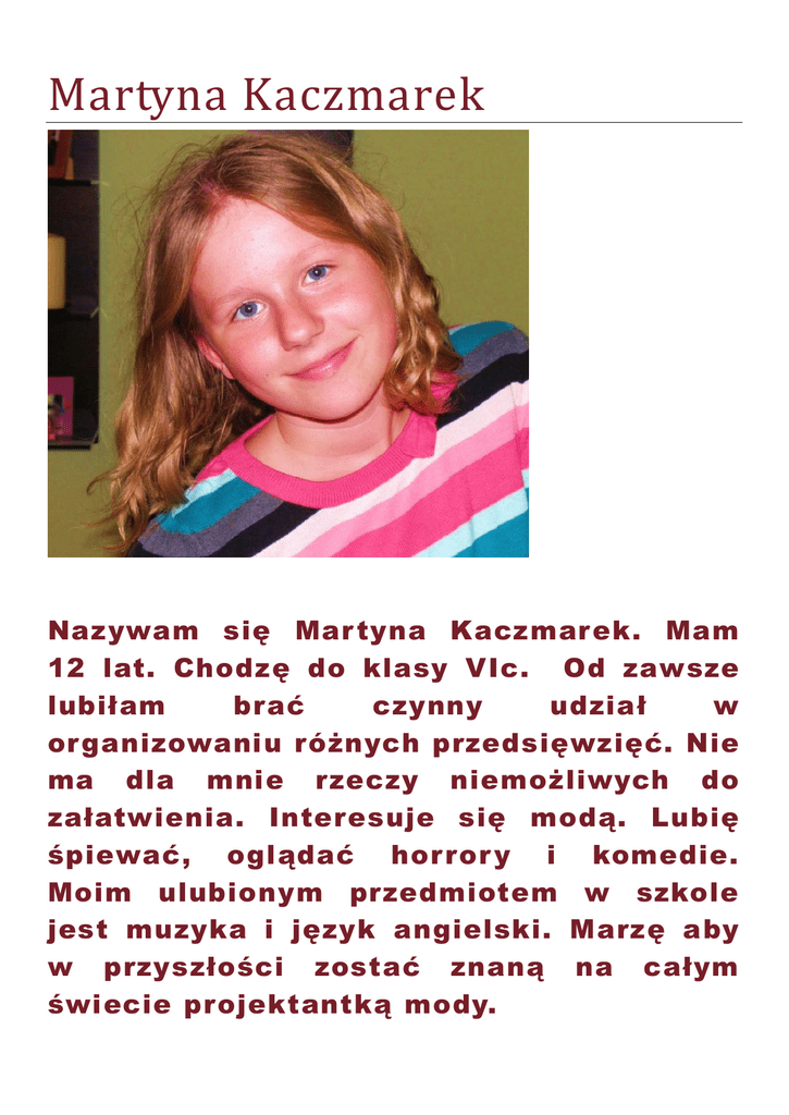 Martyna Kaczmarek Nazywam się Mar tyna Kaczmarek. Mam 12 lat. Chodzę do klasy VIc. Od zawsze lubiłam brać czynny udział w organizowaniu różnych przedsięwzięć. Nie ma dla mnie rzeczy niemożliwych do załatwienia. Interesuje się modą. Lubię śpiewać, oglądać hor ror y i komedie. Moim ulubionym przedmiotem w szkole jest muzyka i język angielski. Marzę aby w przyszłości zostać znaną na całym świecie projektantką mody.