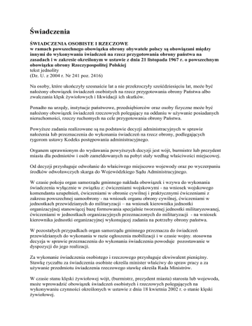 Świadczenia ŚWIADCZENIA OSOBISTE I RZECZOWE w ramach powszechnego obowiązku obrony obywatele polscy są obowiązani między innymi do wykonywania świadczeń na rzecz przygotowania obrony państwa na zasadach i w zakresie określonym w ustawie z dnia 21 listopada 1967 r. o powszechnym obowiązku obrony Rzeczypospolitej Polskiej tekst jednolity (Dz. U. z 2004 r. Nr 241 poz. 2416) Na osoby, które ukończyły szesnaście lat a nie przekroczyły sześćdziesięciu lat, może być nałożony obowiązek świadczeń osobistych na rzecz przygotowania obrony Państwa albo zwalczania klęsk żywiołowych i likwidacji ich skutków. Ponadto na urzędy, instytucje państwowe, przedsiębiorców oraz osoby fizyczne może być nałożony obowiązek świadczeń rzeczowych polegający na oddaniu w używanie posiadanych nieruchomości, rzeczy ruchomych na cele przygotowania obrony Państwa. Powyższe zadania realizowane są na podstawie decyzji administracyjnych w sprawie nałożenia lub przeznaczenia do wykonania świadczeń na rzecz obrony, podlegających rygorom ustawy Kodeks postępowania administracyjnego. Organem uprawnionym do wydawania powyższych decyzji jest wójt, burmistrz lub prezydent miasta dla podmiotów i osób zameldowanych na pobyt stały według właściwości miejscowej. Od decyzji przysługuje odwołanie do właściwego miejscowo wojewody oraz po wyczerpaniu środków odwoławczych skarga do Wojewódzkiego Sądu Administracyjnego. W czasie pokoju organ samorządu gminnego nakłada obowiązek i wzywa do wykonania świadczenia wyłącznie w związku z: ćwiczeniami wojskowymi - na wniosek wojskowego komendanta uzupełnień, ćwiczeniami w obronie cywilnej i praktycznymi ćwiczeniami z zakresu powszechnej samoobrony - na wniosek organu obrony cywilnej, ćwiczeniami w jednostkach przewidzianych do militaryzacji – na wniosek kierownika jednostki organizacyjnej stanowiącej bazę formowania specjalnie tworzonej jednostki militaryzowanej, ćwiczeniami w jednostkach organizacyjnych przeznaczonych do militaryzacji - na wniosek kierownika jednostki organizacyjnej wykonującej zadania na potrzeby obrony państwa. W pozostałych przypadkach organ samorządu gminnego przeznacza do świadczeń przewidzianych do wykonania w razie ogłoszenia mobilizacji i w czasie wojny. stosowna decyzja w sprawie przeznaczenia do wykonania świadczenia powoduje pozostawanie w dyspozycji do jego realizacji. Za wykonanie świadczenia osobistego i rzeczowego przysługuje ekwiwalent pieniężny. Stawkę ryczałtu za świadczenia osobiste określa minister właściwy do spraw pracy a za używanie przedmiotu świadczenia rzeczowego stawkę określa Rada Ministrów. W czasie stanu klęski żywiołowej wójt, (burmistrz, prezydent miasta) starosta lub wojewoda, może wprowadzić obowiązek świadczeń osobistych i rzeczowych polegających na wykonywaniu czynności określonych w ustawie z dnia 18 kwietnia 2002 r. o stanie klęski żywiołowej. (Dz. U. z 2002 r. Nr 62 poz. 558) Uwaga : Wzory dokumentów wymagane w sprawach świadczeń na rzecz obrony na potrzeby organów samorządu gminnego dostępne są na stronie WBiZK (dostęp wymaga podania hasła!)