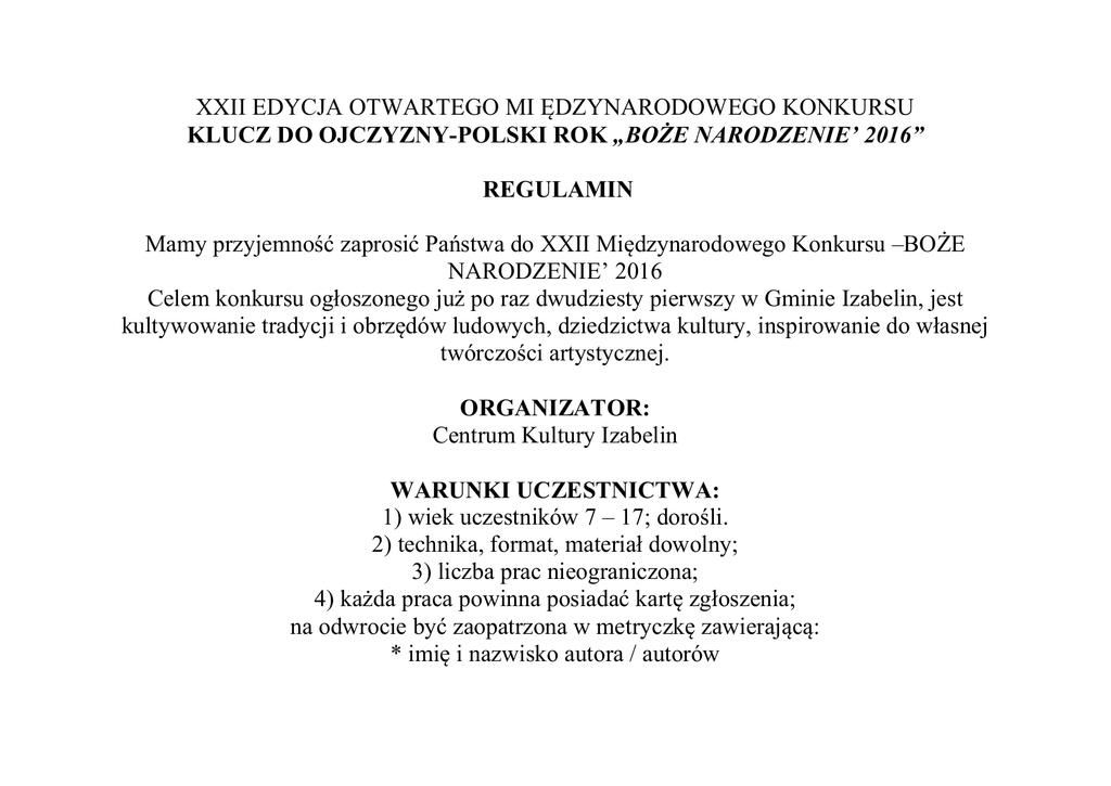 XXII EDYCJA OTWARTEGO MI ĘDZYNARODOWEGO KONKURSU KLUCZ DO OJCZYZNY-POLSKI ROK „BOŻE NARODZENIE’ 2016” REGULAMIN Mamy przyjemność zaprosić Państwa do XXII Międzynarodowego Konkursu –BOŻE NARODZENIE’ 2016 Celem konkursu ogłoszonego już po raz dwudziesty pierwszy w Gminie Izabelin, jest kultywowanie tradycji i obrzędów ludowych, dziedzictwa kultury, inspirowanie do własnej twórczości artystycznej. ORGANIZATOR: Centrum Kultury Izabelin WARUNKI UCZESTNICTWA: 1) wiek uczestników 7 – 17; dorośli. 2) technika, format, materiał dowolny; 3) liczba prac nieograniczona; 4) każda praca powinna posiadać kartę zgłoszenia; na odwrocie być zaopatrzona w metryczkę zawierającą: * imię i nazwisko autora / autorów *datę urodzenia, adres domowy i telefon, przy pracach pochodzących ze szkół, domów kultury, pracowni plastycznych prosimy o podanie nazwiska instruktora lub opiekuna oraz adresu placówki, (prace anonimowe nie będą oceniane); 5) prace nagrodzone przechodzą na własność organizatora konkursu, pozostałe można odebrać po zakończeniu wystawy /prace nie będą odsyłane/; 6) prace zgłoszone na konkurs wystawione będą w Centrum Kultury Izabelin; 7) organizator zastrzega sobie prawo do wystawiania, publikowania, reprodukowania nadesłanych prac; 6) zwycięzcy konkursu i wyróżnieni otrzymają dyplomy oraz nagrody rzeczowe Organizator konkursu zastrzega sobie prawo do innego podziału nagród. ZAŁOŻENIA ORGANIZACYJNE: Konkurs przeprowadzony będzie w następujących kategoriach wiekowych; -7 - 12; 13-17; dorośli; prace rodzinne. - praca płaska o tematyce związanej z Bożym Narodzeniem / zwyczaje świąteczne, szopka/; - /wymiar minimum A4/, wycinanka, grafika, olej, ikona, witraż, mozaika, płaskorzeźba, KRYTERIA OCENY: Zgodność z tematem, pomysłowość, staranność wykonania, walory artystyczne, twórcze czerpanie z tradycji, ciekawe wykorzystanie materiałów naturalnych i wtórnych. TERMINY: Termin składania prac; do 16 grudnia 2016 r. O terminie uroczystego zamknięcia wystawy uczestnicy zostaną powiadomieni telefonicznie; INFORMACJE: Hanna Kwietniewska, autor i koordynator projektu KLUCZ DO OJCZYZNY POLSKI ROK Centrum Kultury Izabelin, 05 - 080 Izabelin, ul. Matejki 21, Tel.(022) 752 68 23 lub 28; Serdecznie zapraszamy do udziału Koordynator konkursu Główny instruktor mgr Hanna Kwietniewska
