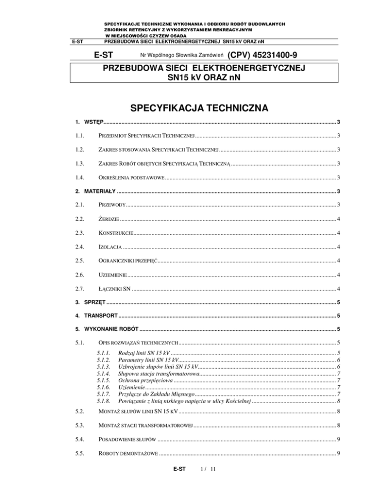 SPECYFIKACJE TECHNICZNE WYKONANIA I ODBIORU ROBÓT BUDOWLANYCH ZBIORNIK RETENCYJNY Z WYKORZYSTANIEM REKREACYJNYM W MIEJSCOWOŚCI CZYŻEW OSADA E-ST PRZEBUDOWA SIECI ELEKTROENERGETYCZNEJ SN15 kV ORAZ nN E-ST Nr Wspólnego Słownika Zamówień (CPV) 45231400-9 PRZEBUDOWA SIECI ELEKTROENERGETYCZNEJ SN15 kV ORAZ nN SPECYFIKACJA TECHNICZNA 1. WSTĘP........................................................................................................................................................... 3 1.1. PRZEDMIOT SPECYFIKACJI TECHNICZNEJ .............................................................................................. 3 1.2. ZAKRES STOSOWANIA SPECYFIKACJI TECHNICZNEJ .............................................................................. 3 1.3. ZAKRES ROBÓT OBJĘTYCH SPECYFIKACJĄ TECHNICZNĄ ...................................................................... 3 1.4. OKREŚLENIA PODSTAWOWE .................................................................................................................. 3 2. MATERIAŁY .................................................................................................................................................. 3 2.1. PRZEWODY ............................................................................................................................................ 3 2.2. ŻERDZIE ................................................................................................................................................ 4 2.3. KONSTRUKCJE....................................................................................................................................... 4 2.4. IZOLACJA .............................................................................................................................................. 4 2.5. OGRANICZNIKI PRZEPIĘĆ ....................................................................................................................... 4 2.6. UZIEMIENIE ........................................................................................................................................... 4 2.7. ŁĄCZNIKI SN ........................................................................................................................................ 4 3. SPRZĘT ......................................................................................................................................................... 5 4. TRANSPORT ................................................................................................................................................. 5 5. WYKONANIE ROBÓT ................................................................................................................................... 5 5.1. OPIS ROZWIĄZAŃ TECHNICZNYCH ......................................................................................................... 5 5.1.1. 5.1.2. 5.1.3. 5.1.4. 5.1.5. 5.1.6. 5.1.7. 5.1.8. Rodzaj linii SN 15 kV .............................................................................................................. 5 Parametry linii SN 15 kV......................................................................................................... 6 Uzbrojenie słupów linii SN 15 kV............................................................................................ 6 Słupowa stacja transformatorowa........................................................................................... 7 Ochrona przepięciowa ............................................................................................................ 7 Uziemienie............................................................................................................................... 7 Przyłącze do Zakładu Mięsnego.............................................................................................. 7 Powiązanie z linią niskiego napięcia w ulicy Kościelnej ........................................................ 8 5.2. MONTAŻ SŁUPÓW LINII SN 15 KV......................................................................................................... 8 5.3. MONTAŻ STACJI TRANSFORMATOROWEJ ............................................................................................... 8 5.4. POSADOWIENIE SŁUPÓW ....................................................................................................................... 9 5.5. ROBOTY DEMONTAŻOWE ...................................................................................................................... 9 E-ST 1 / 11 SPECYFIKACJE TECHNICZNE WYKONANIA I ODBIORU ROBÓT BUDOWLANYCH ZBIORNIK RETENCYJNY Z WYKORZYSTANIEM REKREACYJNYM W MIEJSCOWOŚCI CZYŻEW OSADA E-ST PRZEBUDOWA SIECI ELEKTROENERGETYCZNEJ SN15 kV ORAZ nN 6. KONTROLA JAKOŚCI ROBÓT .................................................................................................................. 10 6.1. OGÓLNE ZASADY KONTROLI JAKOŚCI ROBÓT ...................................................................................... 10 6.2. LINIE KABLOWE .................................................................................................................................. 10 6.3. LINIE NAPOWIETRZNE ......................................................................................................................... 10 7. OBMIAR ROBÓT ......................................................................................................................................... 11 8. ODBIÓR ROBÓT ......................................................................................................................................... 11 9. PRZEPISY ZWIĄZANE................................................................................................................................ 11 E-ST 2 / 11 SPECYFIKACJE TECHNICZNE WYKONANIA I ODBIORU ROBÓT BUDOWLANYCH ZBIORNIK RETENCYJNY Z WYKORZYSTANIEM REKREACYJNYM W MI