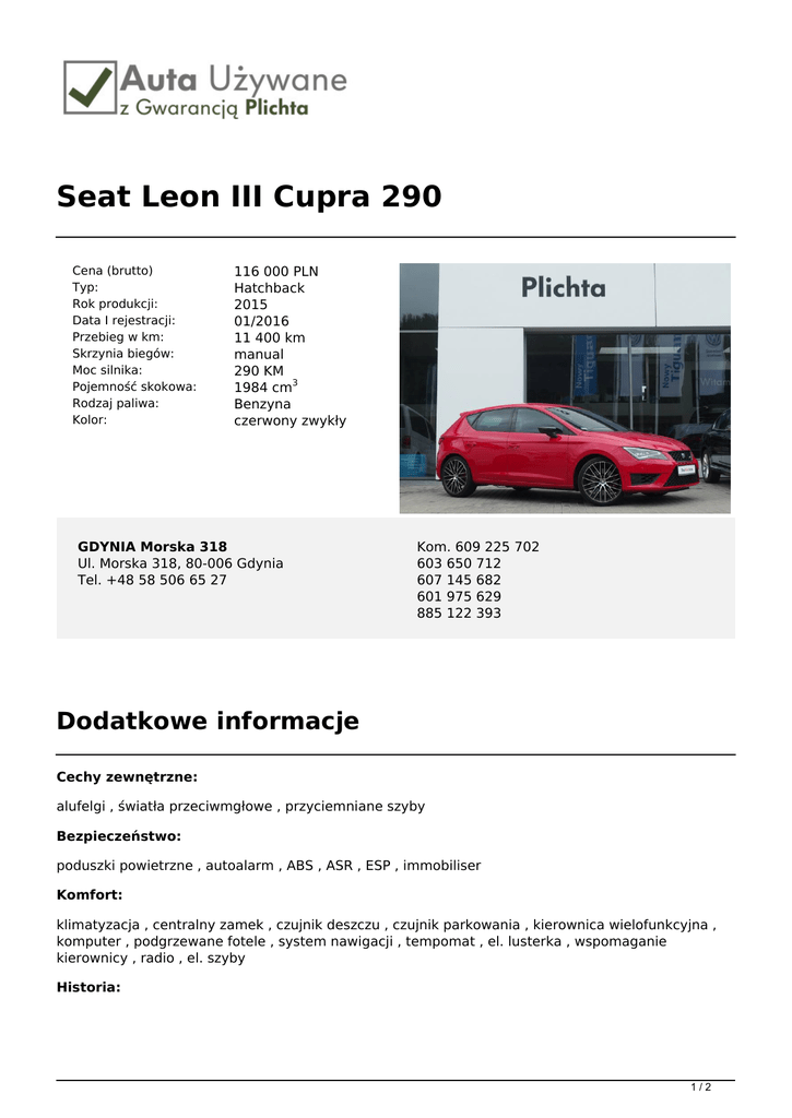 Seat Leon III Cupra 290 Cena (brutto) Typ: Rok produkcji: Data I rejestracji: Przebieg w km: Skrzynia biegów: Moc silnika: Pojemność skokowa: Rodzaj paliwa: Kolor: 116 000 PLN Hatchback 2015 01/2016 11 400 km manual 290 KM 1984 cm3 Benzyna czerwony zwykły GDYNIA Morska 318 Ul. Morska 318, 80-006 Gdynia Tel. +48 58 506 65 27 Kom. 609 225 702 603 650 712 607 145 682 601 975 629 885 122 393 Dodatkowe informacje Cechy zewnętrzne: alufelgi , światła przeciwmgłowe , przyciemniane szyby Bezpieczeństwo: poduszki powietrzne , autoalarm , ABS , ASR , ESP , immobiliser Komfort: klimatyzacja , centralny zamek , czujnik deszczu , czujnik parkowania , kierownica wielofunkcyjna , komputer , podgrzewane fotele , system nawigacji , tempomat , el. lusterka , wspomaganie kierownicy , radio , el. szyby Historia: 1/2 pierwszy właściciel , bezwypadkowy , serwisowany w ASO Gwarancja: Gwarancja Fabryczna Gwarancja Szanowni Państwo, Pragniemy Państwa poinformować, iż firma Plichta – Autoryzowany Dealer Škoda Auto prowadzi skup oraz sprzedaż samochodów używanych wszystkich marek, oferując także samochody używane z gwarancją objęte programem „Auta używane z Gwarancją Plichta”. W ramach programu „Auta Używane z Gwarancją Plichta ” każdy Klient otrzymuje atrakcyjny pakiet zniżek pozwalający zoptymalizować koszty eksploatacji samochodu: -50% na serwis klimatyzacji -50% na ustawienie zbieżności -50% na kosmetykę auta -50% na ścieżkę diagnostyczną -25% na wymiany oleju -25% na zakup opon + 5zł na sezon za hotelowanie opon -15% na części i akcesoria Oferujemy również kompleksową obsługę w zakresie finansowania i ubezpieczenia: - kredyty już od 4,99% - leasingi i kredyty bez zaświadczeń - uproszczone procedury – decyzja już od 30 min. - atrakcyjne pakiety AC/OC/NW/ASS wiodących firm ubezpieczeniowych Możliwość pozostawienia dotychczas użytkowanego auta w rozliczeniu – BEZPŁATNA WYCENA!!! Zapraszamy wszystkich Klientów na jazdę próbną wybranym autem. Numer oferty: E690 Informacja nie stanowi oferty w rozumieniu art. 66 KC. Podane dane mają charakter wyłącznie informacyjny. 2/2 Powered by TCPDF (www.tcpdf.org)