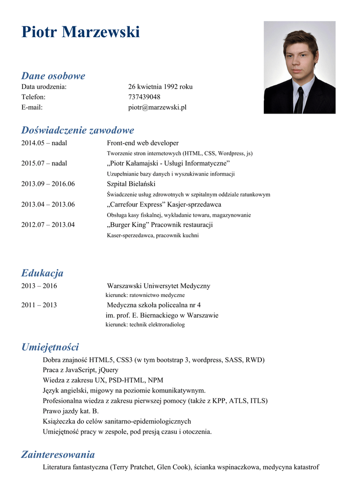 Piotr Marzewski Dane osobowe Data urodzenia: Telefon: Email: 26 kwietnia 1992 roku 737439048 [email protected] Doświadczenie zawodowe 2014.05 – nadal Frontend web developer Tworzenie stron internetowych (HTML, CSS, Wordpress, js) 2015.07 – nadal „Piotr Kałamajski Usługi Informatyczne” Uzupełnianie bazy danych i wyszukiwanie informacji 2013.09 – 2016.06 Szpital Bielański Świadczenie usług zdrowotnych w szpitalnym oddziale ratunkowym 2013.04 – 2013.06 „Carrefour Express” Kasjersprzedawca Obsługa kasy fiskalnej, wykładanie towaru, magazynowanie 2012.07 – 2013.04 „Burger King” Pracownik restauracji Kasersperzedawca, pracownik kuchni Edukacja 2013 – 2016 Warszawski Uniwersytet Medyczny kierunek: ratownictwo medyczne 2011 – 2013 Medyczna szkoła policealna nr 4 im. prof. E. Biernackiego w Warszawie kierunek: technik elektroradiolog Umiejętności Dobra znajność HTML5, CSS3 (w tym bootstrap 3, wordpress, SASS, RWD) Praca z JavaScript, jQuery Wiedza z zakresu UX, PSDHTML, NPM Język angielski, migowy na poziomie komunikatywnym. Profesionalna wiedza z zakresu pierwszej pomocy (także z KPP, ATLS, ITLS) Prawo jazdy kat. B. Książeczka do celów sanitarnoepidemiologicznych Umiejętność pracy w zespole, pod presją czasu i otoczenia. Zainteresowania Literatura fantastyczna (Terry Pratchet, Glen Cook), ścianka wspinaczkowa, medycyna katastrof