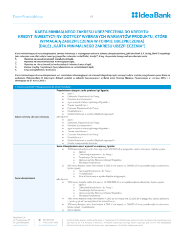 1/3 KARTA MINIMALNEGO ZAKRESU UBEZPIECZENIA DO KREDYTU: KREDYT INWESTYCYJNY (DOTYCZY WYBRANYCH WARIANTÓW PRODUKTU, KTÓRE WYMAGAJĄ ZABEZPIECZENIA W FORMIE UBEZPIECZENIA) (DALEJ „KARTA MINIMALNEGO ZAKRESU UBEZPIECZENIA”) Karta minimalnego zakresu ubezpieczenia zawiera informacje o wymaganym zakresie ochrony ubezpieczeniowej, jaki Idea Bank S.A. (dalej „Bank’’) respektuje jako zabezpieczenie dla kredytu inwestycyjnego (bez zabezpieczenia) (dalej „kredyt’’), który nie posiada danego rodzaju zabezpieczenia: 1. Hipoteka na nieruchomościach mieszkalnych bądź, 2. Hipoteka na nieruchomościach komercyjnych bądź, 3. Hipoteka na nieruchomościach mieszkalnych i niemieszkalnych bądź, 4. Zastaw (zwykły / rejestrowy) / przywłaszczenie na ruchomościach bądź, 5. Cesja wierzytelności z kontraktu. Karta minimalnego zakresu ubezpieczenia jest materiałem informacyjnym i nie stanowi integralnej części umowy kredytu, została przygotowana przez Bank na podstawie Rekomendacji U dotyczącej dobrych praktyk w zakresie bancassurance wydanej przez Komisję Nadzoru Finansowego w czerwcu 2014 r. i obowiązuje od 31 marca 2015 r. I. Główne parametry Ubezpieczenia do umowy kredytu : Zakres ochrony ubezpieczeniowej Suma ubezpieczenia Przedmiotem ubezpieczenia powinno być łącznie: • zgon i • Całkowita Niezdolność do Pracy i • Poważne Zachorowanie i • zgon w wyniku Nieszczęśliwego Wypadku i • Trwałe Inwalidztwo i • Czasowa Niezdolność do Pracy i • Hospitalizacja i • Strata finansowa w wyniku Błędów księgowych albo łącznie: • zgon i • Całkowita Niezdolność do Pracy i • Poważne Zachorowanie i • zgon w wyniku Nieszczęśliwego Wypadku i • Trwałe Inwalidztwo i • Czasowa Niezdolność do Pracy i • Hospitalizacja i • Strata finansowa w wyniku Błędów księgowych i • Utrata stałego źródła dochodu. Suma Ubezpieczenia musi wynosić co najmniej łącznie: • 100% kwoty kredytu netto (nie więcej niż 500.000 zł) w przypadku zajścia zdarzenia z tytułu ryzyka: o zgonu i o Całkowitej Niezdolności do Pracy i o Poważnego Zachorowania i o zgonu w wyniku Nieszczęśliwego Wypadku i o Trwałego Inwalidztwa i • 6% kwoty kredytu netto (minimalnie 5.000 zł, nie więcej niż 30.000 zł) w przypadku zajścia zdarzenia z tytułu ryzyka: o Czasowej Niezdolności do Pracy i o Hospitalizacji i o Strata finansowej w wyniku Błędów księgowych albo łącznie: • 75% kwoty kredytu netto (nie więcej niż 500.000 zł) w przypadku zajścia zdarzenia z tytułu ryzyka: o zgonu i o Całkowitej Niezdolności do Pracy i o Poważnego Zachorowania i o zgonu w wyniku Nieszczęśliwego Wypadku i o Trwałego Inwalidztwa i • 18% kwoty kredytu netto (minimalnie 4.000 zł, nie więcej niż 30.000 zł) w przypadku zajścia zdarzenia z tytułu ryzyka Czasowej Niezdolności do Pracy i • 9% kwoty kredytu netto (minimalnie 4.000 zł, nie więcej niż 30.000 zł) w przypadku zajścia zdarzenia z tytułu ryzyka Hospitalizacji i • Dla kredytów: 2/3 z przedziału 4.000 zł – 40.000.00 zł kwoty kredytu netto: 4.000 zł w przypadku zajścia zdarzenia z tytułu ryzyka Straty finansowej w wyniku Błędów księgowych; o z przedziału 40.000.01 zł – 500.000.00 zł kwoty kredytu netto: 4,5% kwoty kredytu netto (minimalnie 4.000 zł, nie więcej niż 30.000 zł) w przypadku zajścia zdarzenia z tytułu ryzyka Straty finansowej w wyniku Błędów księgowych i • Dla kredytów: o z przedziału 4.000 zł – 40.000.00 zł kwoty kredytu netto: 15% kwoty kredytu netto (maksymalnie 8.000 zł) w przypadku zajścia zdarzenia z tytułu ryzyka Utraty stałego źródła dochodu; o z przedziału 40.000.01 zł – 500.000.00 zł kwoty kredytu netto: 6% kwoty kredytu netto (maksymalnie 40.000 zł) w przypadku zajścia zdarzenia z tytułu ryzyka Utraty stałego źródła dochodu. Brak zapisu o franszyzie integralnej. Brak zapisu o udziale własnym (inaczej nazywanego franszyzą redukcyjną, bezwzględną lub bezwarunkową). Możliwość ustanowienia cesji na Bank. Brak cesji już zawartej na inne podmioty. Warunki Ubezpieczenia z tabelą opłat. Dokument potwierdzający objęcie ochroną ubezpieczeniową Kredytobiorcy lub właściciela przedsiębiorstwa jeżeli Kredytobiorcą jest przedsiębiorstwo wystawiony przez Towarzystwo Ubezpieczeniowe (polisa/ certyfikat) - oryginał lub kopia poświadczona za zgodność z oryginałem przez notariusza lub pracownika Banku. Dokument wystawiony przez Towarzystwo Ubezpieczeniowe potwierdzający aktualną na dzień podpisania umowy kredytu szacowaną kwotę świadczenia należnego Klientowi z tytułu wypowiedzenia umowy / rezygnacji z ubezpieczenia oraz brak ustanowienia cesji na rzecz innych podmiotów z ubezpieczenia. o Minimalne wyłączenia i ograniczenia odpowiedzialności Towarzystwa Ubezpieczeń Dokumenty wymagane do oceny powyższych warunków ubezpieczenia w przypadku oceny przez Bank produktu, którego Klient nie zawarł za pośrednictwem Banku 1. 2. 3. 4. 1. 2. 3. Ważne: Udzielenie kredytu Bank uzależnia od ustanowienia przez Kredytobiorcę zabezpieczenia w formie cesji z polisy ubezpieczeniowej o zakresie ochrony wskazanej w Karcie minimalnego zakresu ubezpieczenia. Koszt kredytu nie jest zróżnicowany w zależności od zawarcia umowy ubezpieczenia za pośrednictwem Banku lub innego uprawnionego podmiotu. Umowa ubezpieczenia powinna zostać zawarta na podstawie prawa polskiego. Towarzystwo Ubezpieczeń powinno posiadać aktualną licencję na prowadzenie działalności ubezpieczeniowej. W przypadku pytań zapraszamy do kontaktu: • e-mail: [email protected] • telefon: 22 101 10 10 lub 801 999 111 (koszt połączenia zgodny ze stawką Operatora) Bank zastrzega, że niniejsza Karta minimalnego zakresu ubezpieczenia nie zastępuje, ani nie stanowi zmiany, aneksu, czy dodatkowego porozumienia do umowy kredytu. Zabezpieczenia udzielonego kredytu wskazane zostaną w umowie kredytu. W przypadku sprzeczności postanowień