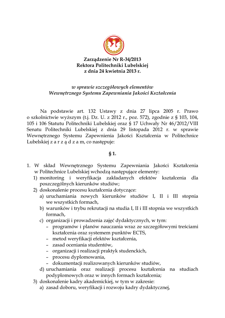 Zarządzenie Nr R-34-2013 system zapewnienia jakosci kształcenia