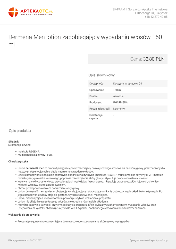SK-FARM II Sp. z o.o. - Apteka Internetowa ul. Kleeberga 34, Białystok +48 42 279 40 05 Dermena Men lotion zapobiegający wypadaniu włosów 150 ml Cena: 33,80 PLN Opis słownikowy Dostępność Dostępny w aptece w 24h Opakowanie 150 ml Postać Aerozole Producent PHARMENA Rodzaj rejestracji Kosmetyk Substancja czynna - Opis produktu Składniki Substancje czynne: molekuła REGEN7, multikompleks aktywny H-VIT. Charakterystyka Lotion dermena® men to produkt pielęgnacyjno-wzmacniający do miejscowego stosowania na skórę głowy, przeznaczony dla mężczyzn obserwujących u siebie nadmierne wypadanie włosów. Dzięki zastosowaniu specjalnie dobranych składników aktywnych (molekuła REGEN7, multikompleks aktywny H-VIT) hamuje miniaturyzację mieszka włosowego, poprawia mikrokrążenie skóry głowy i stymuluje proces odrastania włosów. Wpływa na cykl wzrostu włosa, przyspieszając i wydłużając fazę anagenu. - Reguluje pracę gruczołów łojowych, chroniąc mieszek włosowy przed zaczopowaniem. Chroni przed powstawaniem podrażnień skóry głowy. Lotion dermena® men zawiera substancje kondycjonujące i ułatwiające wnikanie dobroczynnych składników aktywnych. Po jego zastosowaniu włosy stają się gęstsze, wyraźnie odżywione i mocniejsze. Lekka, nieobciążająca włosów formuła powoduje szybkie wchłanianie preparatu. Lotion nie skleja i nie przetłuszcza włosów, nie utrudnia również ich układania. Atomizer zapewnia łatwość i przyjemność użycia preparatu. Efekt związany z zahamowaniem wypadania włosów oraz ustępowaniem łojotoku obserwuje się zwykle w 3-4 tygodniu codziennego stosowania lotionu dermena® men. Wskazania do stosowania: Preparat pielęgnacyjno-wzmacniający do miejscowego stosowania na skórę głowy w przypadku: Plik wygenerowano: 04-03-2017 Oprogramowanie sklepu: AptusShop SK-FARM II Sp. z o.o. - Apteka Internetowa ul. Kleeberga 34, Białystok +48 42 279 40 05 osłabionych i nadmiernie wypadających włosów u mężczyzn, pierwszych objawów łysienia typu męskiego (przerzedzanie się włosów, powstawanie zakoli), łagodzenia podrażnień skóry głowy, również ze współistniejącym przetłuszczaniem się włosów. Im wcześniej rozpocznie się pielęgnację preparatami dermena® men, tym lepsze efekty można uzyskać. Kurację powinno się rozpocząć po zaobserwowaniu pierwszych objawów łysienia (przerzedzenie się włosów i powstawanie zakoli). Stosowanie Najlepsze efekty osiąga się, stosując lotion dermena® men dwa razy dziennie – rano i wieczorem. Stosować na wilgotne włosy (po ich umyciu szamponem dermena® men) lub suche. Równomiernie spryskać preparatem skórę głowy (5-7 rozpyleń). Szczególną uwagę należy zwrócić na miejsca powstawania zakoli i przerzedzania się włosów. Następnie opuszkami palców delikatnie wmasować preparat okrężnymi ruchami w skórę głowy. Masaż pobudza dodatkowo krążenie i ułatwia wchłanianie substancji aktywnych. Przeczesać włosy i układać jak zwykle. Nie spłukiwać. Nie rozpylać preparatu w kierunku oczu. W przypadku dostania się produktu do oczu przemyć je wodą. Lotion dermena® men może być używany w sposób ciągły. Zaleca się równoczesne stosowanie lotionu z szamponem dermena® men, przeznaczonym do codziennej pielęgnacji włosów. W przypadku nasilonego wypadania włosów poleca się zastosowanie kuracji w ampułkach dermena® men. Informacje dodatkowe W razie pytań lub wątpliwości służymy Państwu pomocą pod adresem [email protected]. Plik wygenerowano: 04-03-2017 Powered by TCPDF (www.tcpdf.org) Oprogramowanie sklepu: AptusShop