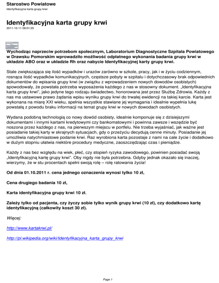 Starostwo Powiatowe Identyfikacyjna karta grupy krwi Identyfikacyjna karta grupy krwi 2011-10-11 08:01:25 Wychodząc naprzeciw potrzebom społecznym, Laboratorium Diagnostyczne Szpitala Powiatowego w Drawsku Pomorskim wprowadziło możliwość odpłatnego wykonania badania grupy krwi w układzie ABO oraz w układzie Rh oraz nabycie Identyfikacyjnej karty grupy krwi. Stale zwiększająca się ilość wypadków i urazów zarówno w szkole, pracy, jak i w życiu codziennym, rosnąca ilość wypadków komunikacyjnych, częstsze pobyty w szpitalu i dotychczasowy brak odpowiednich dokumentów do wpisania grupy krwi (w związku z wprowadzeniem nowych dowodów osobistych) spowodowały, że powstała potrzeba wyposażenia każdego z nas w stosowny dokument. „Identyfikacyjna karta grupy krwi”, jako jedyne tego rodzaju świadectwo, honorowana jest przez Służbę Zdrowia. Każdy z nas ma ustawowe prawo żądania wpisu wyniku grupy krwi do trwałej ewidencji na takiej karcie. Karta jest wykonana na miarę XXI wieku, spełnia wszystkie stawiane jej wymagania i idealnie wypełnia lukę powstałą z powodu braku informacji na temat grupy krwi w nowych dowodach osobistych. Wydana podobną technologią co nowy dowód osobisty, idealnie komponuje się z dzisiejszymi dokumentami i innymi kartami kredytowymi czy bankomatowymi i powinna zawsze i wszędzie być noszona przez każdego z nas, na pierwszym miejscu w portfelu. Nie trzeba wyjaśniać, jak ważne jest posiadanie takiej karty w skrajnych sytuacjach, gdy o przeżyciu decydują cenne minuty. Posiadanie jej umożliwia natychmiastowe podanie krwi. Raz wyrobiona karta pozostaje z nami na całe życie i dodatkowo w dużym stopniu ułatwia niektóre procedury medyczne, zaoszczędzając czas i pieniądze. Każdy z nas bez względu na wiek, płeć, czy stopień ryzyka zawodowego, powinien posiadać swoją „Identyfikacyjną kartę grupy krwi”. Oby nigdy nie była potrzebna. Gdyby jednak okazało się inaczej, wierzymy, że w stu procentach spełni swoją rolę – rolę ratowania życia! Od dnia 01.10.2011 r. cena jednego oznaczenia wynosi tylko 10 zł, Cena drugiego badania 10 zł, Karta identyfikacyjna grupy krwi 10 zł. Zależy tylko od pacjenta, czy życzy sobie tylko wynik grupy krwi (10 zł), czy dodatkowo kartę identyfikacyjną (całkowity koszt 30 zł). Więcej: http://www.kartakrwi.pl/ http://pl.wikipedia.org/wiki/Identyfikacyjna_karta_grupy_krwi Page 1