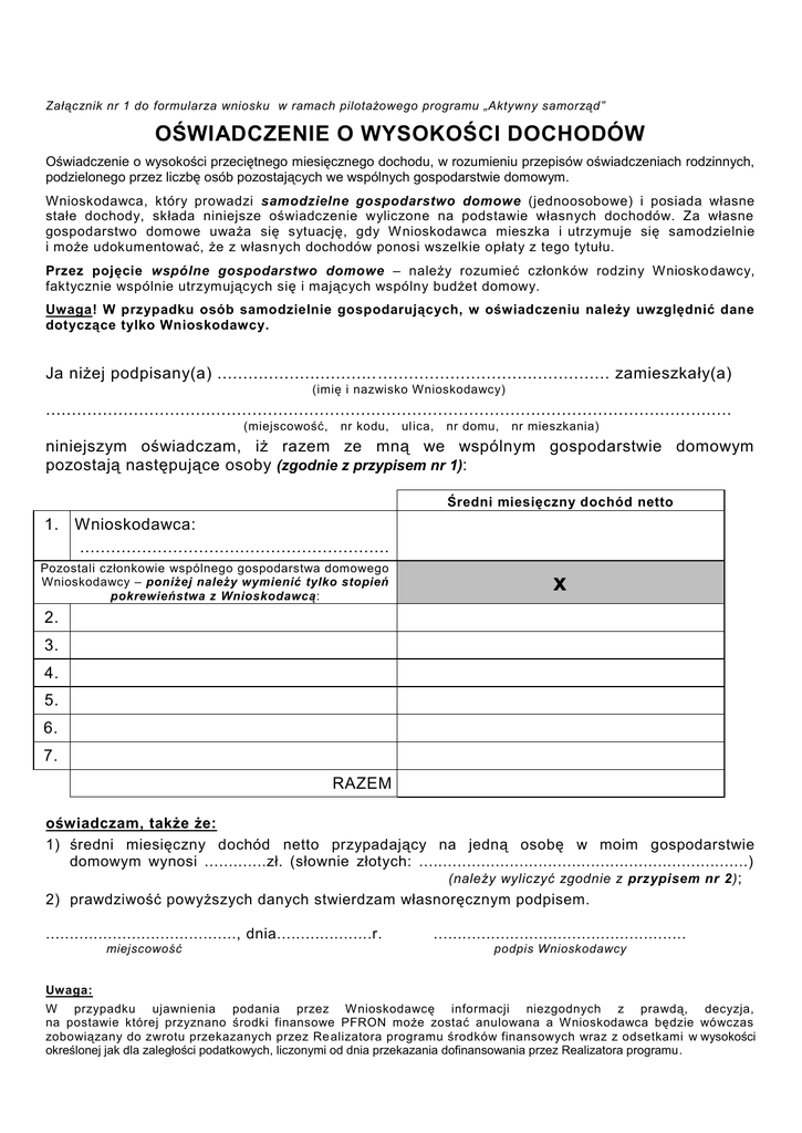 Załącznik nr 1 do formularza wniosku w ramach pilotażowego programu „Aktywny samorząd” OŚWIADCZENIE O WYSOKOŚCI DOCHODÓW Oświadczenie o wysokości przeciętnego miesięcznego dochodu, w rozumieniu przepisów oświadczeniach rodzinnych, podzielonego przez liczbę osób pozostających we wspólnych gospodarstwie domowym. Wnioskodawca, który prowadzi samodzielne gospodarstwo domowe (jednoosobowe) i posiada własne stałe dochody, składa niniejsze oświadczenie wyliczone na podstawie własnych dochodów. Za własne gospodarstwo domowe uważa się sytuację, gdy W nioskodawca mieszka i utrzymuje się samodzielnie i może udokumentować, że z własnych dochodów ponosi wszelkie opłaty z tego tytułu. Przez pojęcie wspólne gospodarstwo domowe – należy rozumieć członków rodziny Wnioskodawcy, faktycznie wspólnie utrzymujących się i mających wspólny budżet domowy. Uwaga! W przypadku osób samodzielnie gospodarujących, w oświadczeniu należy uwzględnić dane dotyczące tylko Wnioskodawcy. Ja niżej podpisany(a) ............................................................................ zamieszkały(a) (imię i nazwisko Wnioskodawcy) ..................................................................................................................................... (miejscowość, nr kodu, ulica, nr domu, nr mieszkania) niniejszym oświadczam, iż razem ze mną we wspólnym gospodarstwie domowym pozostają następujące osoby (zgodnie z przypisem nr 1): Średni miesięczny dochód netto 1. Wnioskodawca: ............................................................ Pozostali członkowie wspólnego gospodarstwa domowego Wnioskodawcy – poniżej należy wymienić tylko stopień pokrewieństwa z Wnioskodawcą: x 2. 3. 4. 5. 6. 7. RAZEM oświadczam, także że: 1) średni miesięczny dochód netto przypadający na jedną osobę w moim gospodarstwie domowym wynosi .............zł. (słownie złotych: .....................................................................) (należy wyliczyć zgodnie z przypisem nr 2) ; 2) prawdziwość powyższych danych stwierdzam własnoręcznym podpisem. ........................................, dnia....................r. miejscowość ..................................................... podpis Wnioskodawcy Uwaga: W przypadku ujawnienia podania przez Wnioskodawcę informacji niezgodnych z prawdą, decyzja, na postawie której przyznano środki finansowe PFRON może zostać anulowana a Wnioskodawca będzie wówczas zobowiązany do zwrotu przekazanych przez Re alizatora programu środków finansowych wraz z odsetkami w wysokości określonej jak dla zaległości podatkowych, liczonymi od dnia przekazania dofinansowania przez Realizatora programu. Oświadczenie o wysokości dochodów Przypis nr 1 Zgodnie z art.3 ustawy z dnia 28 listopada 2003r. o świadczeniach rodzinnych(tekst jedn. Dz. U. z 2013 r. poz. 1456) ilekroć w tej ustawie jest mowa o: Dochód w rozumieniu przepisów o świadczeniach rodzinnych, który po odliczeniu alimentów świadczonych na rzecz innych osób stanowi: a) przychody podlegające opodatkowaniu na zasadach określonych w art.27, 30b, 30c i 30e ustawy z dnia 26 lipca 1991 r. o podatku dochodowym od osób fizycznych,(Dz. U. z 2010 r. Nr 51, poz. 307, z późn. zm.), pomniejszone o koszty uzyskania przychodu, należny podatek dochodowy, składki na ubezpieczenie społeczne niezaliczone do kosztów uzyskania przychodu oraz zapłacone składki na ubezpieczenie zdrowotne, b) dochód z działalności podlegającej opodatkowaniu na podstawie przepisów o zryczałtowanym podatku dochodowym, pomniejszony o należny zryczałtowany podatek dochodowy i zapłacone składki na ubezpieczenie społeczne i zdrowotne, c) inne dochody niepodlegające opodatkowaniu, w tym w szczególności: renty przyznawane na podstawie przepisów o zaopatrzeniu inwalidów wojennych, wojskowych oraz ich rodzin, dodatek kombatancki, ryczałt energetyczny, dodatek kompensacyjny, ekwiwalenty pieniężne za deputaty węglowe, zasiłki chorobowe określone w przepisach o systemie ubezpieczeń społecznych, środki bezzwrotnej pomocy zagranicznej, alimenty na rzecz dzieci, kwoty diet otrzymywane przez osoby wykonujące czynności związane z pełnieniem obowiązków służbowych i obywatelskich, należności z tyt. wynajmu pokoi gościnnych, stypendia, dochody uzyskane z gospodarstwa rolnego, należności ze stosunku pracy lub z tytułu stypendium otrzymywane przez osoby przebywające czasowo za granicą, należności ze stosunku służbowego otrzymywane w czasie pełnienia służby kandydackiej przez funkcjonariuszy Policji, Państwowej Straży Pożarnej, Straży Granicznej, Biura Ochrony Rządu. Uwaga! Wnioskodawca na żądanie Realizatora programu zobowiązany jest dostarczyć dowody potwierdzające wysokość uzyskiwanych dochodów w jego gospodarstwie domowym. W takim przypadku wraz z ww. dokumentami należy przedłożyć także zgodę członków gospodarstwa domowego na przetwarzanie ich danych osobowych (zgodnie z załącznikiem nr 3 do formularza wniosku). Przypis nr 2 – sposób wyliczenia średniego miesięcznego dochodu netto przypadającego na jedną osobę pozostającą we wspólnym gospodarstwie domowym z Wnioskodawcą: średni miesięczny dochód netto przypadający na jedną osobę pozostającą we wspólnym gospodarstwie domowym z Wnioskodawcą łączny średni miesięczny dochód netto wykazany w wierszu „Razem” w tabeli na stronie 1 niniejszego O świadczenia = liczba osób w gospodarstwie domowym wykazana w tabeli na stronie 1 niniejszego Oświadczenia str.2 .