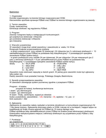 (*2011) Badminton 1. Organizator Komitet organizacyjny na terenie którego rozgrywana jest OOM. Kierownictwo sportowe sprawuje PZBad oraz OZBad na terenie którego organizowane są zawody. 2. Termin zawodów Finały: kwiecień/maj Eliminacje strefowe: wg regulaminu PZBad. 3. Program Zawody rozegrane będą w następujących konkurencjach: gra pojedyncza dziewcząt i chłopców gra podwójna dziewcząt i chłopców gra mieszana 4. Warunki uczestnictwa W zawodach mogą brać udział zawodnicy i zawodniczki w wieku 14-16 lat. Rozgrywki finałowe przeprowadzone zostaną: - w grach pojedynczych przy udziale 32 dziewcząt i 32 chłopców (po 2 z eliminacji strefowych + 13 zakwalifikowanych przez PZBad na podstawie listy klasyfikacyjnej + 3 posiadających specjalne zezwolenie PZBad (dzikie karty)) - w grach podwójnych przy udziale 24 par dziewcząt, 24 par chłopców i 24 par mieszanych (po 2 pary z eliminacji strefowych + 6 par zakwalifikowanych przez PZBad na podstawie listy klasyfikacyjnej + 2 posiadające specjalne zezwolenie PZBad (dzikie karty)). Strefy A – WLP-ZPM B – POM-KPM C – MAZ-WM D – DŚL-LBU E – ŁDZ-ŚWI F – LUB-PDL G – ŚL-OPO H – MŁP-PKR Zawodnik moŜe startować najwyŜej w dwóch grach. W jednej grze zawodnik moŜe być zgłoszony tylko jeden raz. KaŜdy zawodnik musi posiadać licencję Polskiego Związku Badmintona. 5. Sposób przeprowadzenia zawodów W zawodach obowiązuje system pucharowy zgodnie z przepisami PZBad. Program - 4 boiska przyjazd do kolacji, konferencja techniczna I dzień - gry eliminacyjne II dzień - gry eliminacyjne III dzień - finały, zamknięcie, wyjazd po obiedzie liczba uczestników: zawodników - 128, trenerów - 35, sędziów - 12, pzs - 2 limit osobodni = 492 6. Zgłoszenia Zgłoszenie do zawodów naleŜy nadsyłać w terminie określonym w komunikacie organizacyjnym Nr 1 dla danej imprezy. Zgłoszenia dotyczące startu w OOM, inaczej niŜ w turniejach, mające wpływ na kwalifikację do finału muszą wpłynąć do PZBad do 15 marca danego roku. PZBad opublikuje listę zakwalifikowanych przez PZBad do finałów przed eliminacjami strefowymi. Ewentualne niewykorzystane miejsca z eliminacji strefowych są uzupełniane przez PZBad z listy klasyfikacyjnej. 7. Punktacja gry pojedyncze Lok. 1 2 3-4 5-8 9-16 17-32 PKT 9 7 5 4 3 1 82 1 gry podwójne, gra mieszana Lok. 1 2 3-4 5-8 PKT 9 7 5 3 38 D. System ocen Badminton I. MłodzieŜowe Mistrzostwa Polski K/M - 20-22 lat 1.Program zawodów. K/M - gra pojedyncza, gra podwójna oraz gra mieszana 2. Punktacja. Lok. 1 2 3-4 5-8 PKT 25 21 17 11 124 II. Mistrzostwa Polski Juniorów K/M - 17-19 lat 1.Program zawodów. K/M - gra pojedyncza, gra podwójna oraz gra mieszana 2. Punktacja. gry pojedyncze Lok. 1 2 3-4 5-8 9-16 PKT 15 12 9 4 2 77 gry podwójne, gra mieszana Lok. 1 2 3-4 5-8 PKT 15 12 9 4 61 III. Olimpiada MłodzieŜy - Mistrzostwa Polski Juniorów Młodszych - K/M - 14-16 lat 1.Program zawodów. K/M - gra pojedyncza, gra podwójna oraz gra mieszana 2. Punktacja. gry pojedyncze Lok. 1 2 3-4 5-8 9-16 17-32 PKT 9 7 5 4 3 1 82 gry podwójne, gra mieszana Lok. 1 2 3-4 5-8 PKT 9 7 5 3 38 Eliminacje do OOM – strefowe + lista PZBad Strefy A – WLP-ZPM C – MAZ-WM E – ŁDZ-ŚWI G – ŚL-OPO B – POM-KPM D – DŚL-LBU F – LUB-PDL H – MŁP-PKR IV. Międzywojewódzkie Mistrzostwa Młodzików - K/M - 10-13 lat 1.Program zawodów K/M - gra pojedyncza, gra podwójna, gra mieszana 2. Punktacja Lok. 1 2 3-8 PKT 3 2 1 11 Strefy A – WLP-ZPM C – MAZ-WM E – ŁDZ-ŚWI B – POM-KPM D – DŚL-LBU F – LUB-PDL 2 G – ŚL-OPO E. Roczniki młodzieŜowcy juniorzy juniorzy młodsi młodzicy H – MŁP-PKR 20-22 lat (w 2011 roku urodzeni 01.01.1989 – 31.12.1991) 17-19 lat (w 2011 roku urodzeni 01.01.1992 – 31.12.1994) 14-16 lat (w 2011 roku urodzeni 01.01.1995 – 31.12.1997) 10-13 lat (w 2011 roku urodzeni 01.01.1998 – 31.12.2001) Przypominamy: - w zawodach uczestniczą kluby posiadające licencję wydaną przez właściwy polski związek, - zawodnicy muszą posiadać licencję wydaną przez właściwy związek, - w przypadku braku licencji klubowej – punkty naliczane będą dla gminy, - komunikat z zawodów powinien zawierać rok urodzenia zawodnika, numer licencji zawodnika oraz pełną nazwę klubu, wykaz członków komisji sędziowskiej wraz z ich nr licencji i być podpisany przez sędziego głównego z podaniem jego nr licencji - komunikat z zawodów naleŜy przesłać na adres Polskiej Federacji Sportu MłodzieŜowego w ciągu 14 dni po zawodach, - prosimy o zapoznanie się z częścią ogólną regulaminu współzawodnictwa, gdzie podane są zasady uczestnictwa i oceny wyników we wszystkich dyscyplinach systemu, - na stronie internetowej PFSM (www.sportmlodziezowy.pl) umieszczane są średnio co dwa tygodnie wyniki współzawodnictwa, - od 2010 roku w MłodzieŜowych Mistrzostwach Polski w konkurencjach indywidualnych, gdzie liczba ostatecznie sklasyfikowanych zawodników jest mniejsza niŜ 8, zawodnicy będą otrzymywać połowę punktów. 3