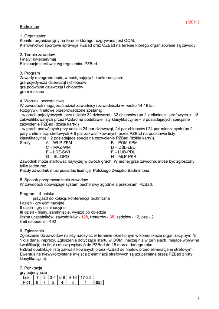 (*2011) Badminton 1. Organizator Komitet organizacyjny na terenie