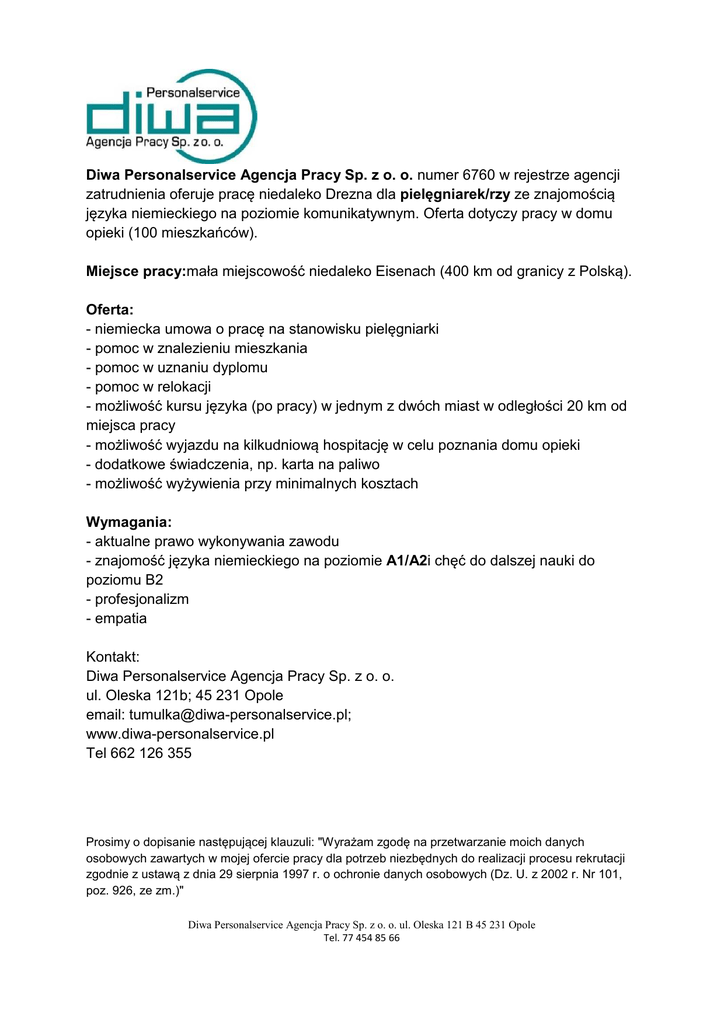 Diwa Personalservice Agencja Pracy Sp. z o. o. numer 6760 w rejestrze agencji zatrudnienia oferuje pracę niedaleko Drezna dla pielęgniarek/rzy ze znajomością języka niemieckiego na poziomie komunikatywnym. Oferta dotyczy pracy w domu opieki (100 mieszkańców). Miejsce pracy:mała miejscowość niedaleko Eisenach (400 km od granicy z Polską). Oferta: - niemiecka umowa o pracę na stanowisku pielęgniarki - pomoc w znalezieniu mieszkania - pomoc w uznaniu dyplomu - pomoc w relokacji - możliwość kursu języka (po pracy) w jednym z dwóch miast w odległości 20 km od miejsca pracy - możliwość wyjazdu na kilkudniową hospitację w celu poznania domu opieki - dodatkowe świadczenia, np. karta na paliwo - możliwość wyżywienia przy minimalnych kosztach Wymagania: - aktualne prawo wykonywania zawodu - znajomość języka niemieckiego na poziomie A1/A2i chęć do dalszej nauki do poziomu B2 - profesjonalizm - empatia Kontakt: Diwa Personalservice Agencja Pracy Sp. z o. o. ul. Oleska 121b; 45 231 Opole email: [email protected]; www.diwa-personalservice.pl Tel 662 126 355 Prosimy o dopisanie następującej klauzuli: "Wyrażam zgodę na przetwarzanie moich danych osobowych zawartych w mojej ofercie pracy dla potrzeb niezbędnych do realizacji procesu rekrutacji zgodnie z ustawą z dnia 29 sierpnia 1997 r. o ochronie danych osobowych (Dz. U. z 2002 r. Nr 101, poz. 926, ze zm.)" Diwa Personalservice Agencja Pracy Sp. z o. o. ul. Oleska 121 B 45 231 Opole Tel. 77 454 85 66