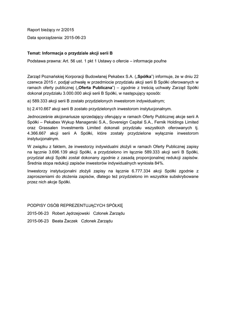 Raport bieżący nr 2/2015 Data sporządzenia: 2015-06-23 Temat: Informacja o przydziale akcji serii B Podstawa prawna: Art. 56 ust. 1 pkt 1 Ustawy o ofercie – informacje poufne Zarząd Poznańskiej Korporacji Budowlanej Pekabex S.A. („Spółka”) informuje, że w dniu 22 czerwca 2015 r. podjął uchwałę w przedmiocie przydziału akcji serii B Spółki oferowanych w ramach oferty publicznej („Oferta Publiczna”) – zgodnie z treścią uchwały Zarząd Spółki dokonał przydziału 3.000.000 akcji serii B Spółki, w następujący sposób: a) 589.333 akcji serii B zostało przydzielonych inwestorom indywidualnym; b) 2.410.667 akcji serii B zostało przydzielonych inwestorom instytucjonalnym. Jednocześnie akcjonariusze sprzedający oferujący w ramach Oferty Publicznej akcje serii A Spółki – Pekabex Wykup Managerski S.A., Sovereign Capital S.A., Fernik Holdings Limited oraz Grassalen Investments Limited dokonali przydziału wszystkich oferowanych tj. 4.366.667 akcji serii A Spółki, które zostały przydzielone wyłącznie inwestorom instytucjonalnym. W związku z faktem, że inwestorzy indywidualni złożyli w ramach Oferty Publicznej zapisy na łącznie 3.696.139 akcji Spółki, a przydzielono im łącznie 589.333 akcji serii B Spółki, przydział akcji Spółki został dokonany zgodnie z zasadą proporcjonalnej redukcji zapisów. Średnia stopa redukcji zapisów inwestorów indywidualnych wyniosła 84%. Inwestorzy instytucjonalni złożyli zapisy na łącznie 6.777.334 akcji Spółki zgodnie z zaproszeniami do złożenia zapisów, dlatego też przydzielono im wszystkie subskrybowane przez nich akcje Spółki. PODPISY OSÓB REPREZENTUJĄCYCH SPÓŁKĘ 2015-06-23 Robert Jędrzejowski Członek Zarządu 2015-06-23 Beata Żaczek Członek Zarządu