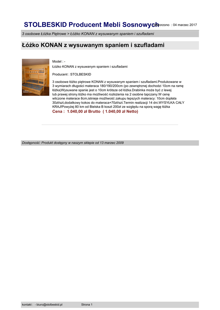 Utworzono : 04 marzec 2017 STOLBESKID Producent Mebli Sosnowych 3 osobowe Łóżka Piętrowe > Łóżko KONAN z wysuwanym spaniem i szufladami Łóżko KONAN z wysuwanym spaniem i szufladami Model : Łóżko KONAN z wysuwanym spaniem i szufladami Producent : STOLBESKID 3 osobowe łóżko piętrowe KONAN z wysuwanym spaniem i szufladami.Produkowane w 3 wymiarach długości materaca 180/190/200cm (po zewnętrznej dochodzi 10cm na ramę łóżka)Wysuwane spanie jest o 10cm krótsze od łóżka.Drabinka może być z lewej lub prawej strony.łóżko ma możliwość rozłożenia na 2 osobne tapczany.W cenę wliczone materace 8cm,istnieje możliwość zakupu lepszych materacy: 10cm dopłata 30zł/szt,dodatkowy kokos do materaca+70zł/szt.Termin realizacji 14 dni.WYSYŁKA CAŁY KRAJ!Powyżej 80 km od Bielska B koszt 200zł ze względu na sporą wagę łóżka Cena : 1.040,00 zł Brutto ( 1.040,00 zł Netto) Dostępność: Produkt dostępny w naszym sklepie od 13 marzec 2009 kontakt : - [email protected] Strona 1