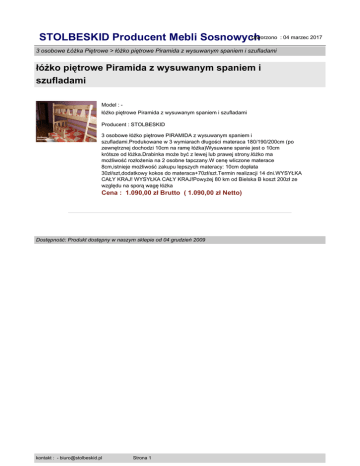 Utworzono : 04 marzec 2017 STOLBESKID Producent Mebli Sosnowych 3 osobowe Łóżka Piętrowe > łóżko piętrowe Piramida z wysuwanym spaniem i szufladami łóżko piętrowe Piramida z wysuwanym spaniem i szufladami Model : łóżko piętrowe Piramida z wysuwanym spaniem i szufladami Producent : STOLBESKID 3 osobowe łóżko piętrowe PIRAMIDA z wysuwanym spaniem i szufladami.Produkowane w 3 wymiarach długości materaca 180/190/200cm (po zewnętrznej dochodzi 10cm na ramę łóżka)Wysuwane spanie jest o 10cm krótsze od łóżka.Drabinka może być z lewej lub prawej strony.łóżko ma możliwość rozłożenia na 2 osobne tapczany.W cenę wliczone materace 8cm,istnieje możliwość zakupu lepszych materacy: 10cm dopłata 30zł/szt,dodatkowy kokos do materaca+70zł/szt.Termin realizacji 14 dni.WYSYŁKA CAŁY KRAJ! WYSYŁKA CAŁY KRAJ!Powyżej 80 km od Bielska B koszt 200zł ze względu na sporą wagę łóżka Cena : 1.090,00 zł Brutto ( 1.090,00 zł Netto) Dostępność: Produkt dostępny w naszym sklepie od 04 grudzień 2009 kontakt : - [email protected] Strona 1