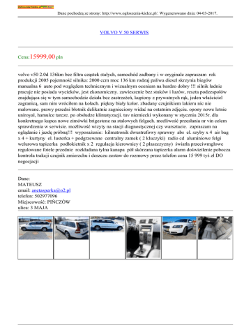 Dane pochodzą ze strony: http://www.ogloszenia-kielce.pl/. Wygenerowano dnia: 04-03-2017. VOLVO V 50 SERWIS Cena:15999,00 pln volvo v50 2.0d 136km bez filtra cząstek stałych, samochód zadbany i w oryginale zapraszam rok produkcji 2005 pojemność silnika: 2000 ccm moc 136 km rodzaj paliwa diesel skrzynia biegów manualna 6 auto pod względem technicznym i wizualnym oceniam na bardzo dobry !!! silnik ładnie pracuje nie posiada wycieków, jest ekonomiczny. zawieszenie bez stuków i luzów, reszta podzespołów znajdująca się w tym samochodzie działa bez zastrzeżeń, kupiony z prywatnych rąk, jeden właściciel zagranicą, sam nim wróciłem na kołach. piękny biały kolor. zbadany czujnikiem lakieru nic nie malowane. prawy przedni błotnik delikatnie zagnieciony widać na ostatnim zdjęciu. opony nowe letnie uniroyal, hamulce tarcze. po obsłudze klimatyzacji. tuv niemiecki wykonany w styczniu 2015r. dla konkretnego kupca nowe zimówki brigestone na stalowych felgach. możliwość przesłania nr vin celem sprawdzenia w serwisie. możliwość wizyty na stacji diagnostycznej czy warsztacie. zapraszam na oglądanie i jazdę próbną!!! wyposażenie: kilmatronik dwustrefowy sprawny abs el. szyby x 4 air bag x 4 + kurtyny el. lusterka + podgrzewane centralny zamek ( 2 kluczyki) radio cd aluminiowe felgi welurowa tapicerka podłokietnik x 2 regulacja kierownicy ( 2 płaszczyzny) światła przeciwmgłowe regulowane fotele przednie rozkładana tylna kanapa pół skórzana tapicerka alarm doświetlenie pobocza kontrola trakcji czujnik zmierzchu i deszczu zestaw do rozmowy przez telefon cena 15 999 tyś zł DO negocjacji Dane: MATEUSZ email: [email protected] telefon: 502977096 Miejscowość: PIŃCZÓW ulica: 3 MAJA