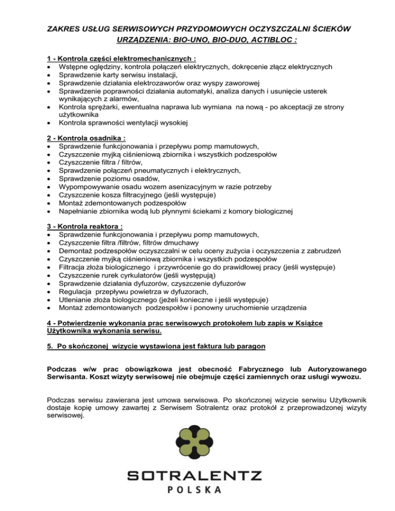 ZAKRES USŁUG SERWISOWYCH PRZYDOMOWYCH OCZYSZCZALNI ŚCIEKÓW URZĄDZENIA: BIO-UNO, BIO-DUO, ACTIBLOC : 1 - Kontrola części elektromechanicznych : Wstępne oględziny, kontrola połączeń elektrycznych, dokręcenie złącz elektrycznych Sprawdzenie karty serwisu instalacji, Sprawdzenie działania elektrozaworów oraz wyspy zaworowej Sprawdzenie poprawności działania automatyki, analiza danych i usunięcie usterek wynikających z alarmów, Kontrola sprężarki, ewentualna naprawa lub wymiana na nową - po akceptacji ze strony użytkownika Kontrola sprawności wentylacji wysokiej 2 - Kontrola osadnika : Sprawdzenie funkcjonowania i przepływu pomp mamutowych, Czyszczenie myjką ciśnieniową zbiornika i wszystkich podzespołów Czyszczenie filtra / filtrów, Sprawdzenie połączeń pneumatycznych i elektrycznych, Sprawdzenie poziomu osadów, Wypompowywanie osadu wozem asenizacyjnym w razie potrzeby Czyszczenie kosza filtracyjnego (jeśli występuje) Montaż zdemontowanych podzespołów Napełnianie zbiornika wodą lub płynnymi ściekami z komory biologicznej 3 - Kontrola reaktora : Sprawdzenie funkcjonowania i przepływu pomp mamutowych, Czyszczenie filtra /filtrów, filtrów dmuchawy Demontaż podzespołów oczyszczalni w celu oceny zużycia i oczyszczenia z zabrudzeń Czyszczenie myjką ciśnieniową zbiornika i wszystkich podzespołów Filtracja złoża biologicznego i przywrócenie go do prawidłowej pracy (jeśli występuje) Czyszczenie rurek cyrkulatorów (jeśli występują) Sprawdzenie działania dyfuzorów, czyszczenie dyfuzorów Regulacja przepływu powietrza w dyfuzorach, Utlenianie złoża biologicznego (jeżeli konieczne i jeśli występuje) Montaż zdemontowanych podzespołów i ponowny uruchomienie urządzenia 4 - Potwierdzenie wykonania prac serwisowych protokołem lub zapis w Książce Użytkownika wykonania serwisu. 5. Po skończonej wizycie wystawiona jest faktura lub paragon Podczas w/w prac obowiązkowa jest obecność Fabrycznego lub Autoryzowanego Serwisanta. Koszt wizyty serwisowej nie obejmuje części zamiennych oraz usługi wywozu. Podczas serwisu zawierana jest umowa serwisowa. Po skończonej wizycie serwisu Użytkownik dostaje kopię umowy zawartej z Serwisem Sotralentz oraz protokół z przeprowadzonej wizyty serwisowej.