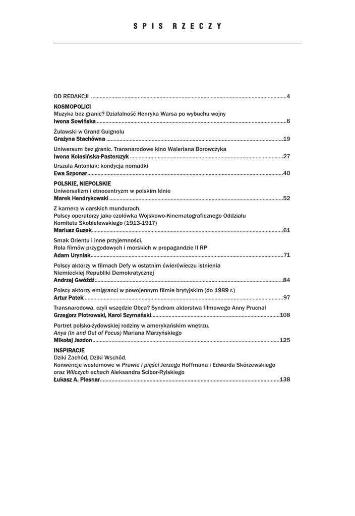 S P I S R Z E C Z Y Od redakcji ......................................................................................................................................4 kOSMOPOLici Muzyka bez granic? działalność Henryka Warsa po wybuchu wojny iwona Sowińska ..................................................................................................................................6 Żuławski w Grand Guignolu Grażyna Stachówna .........................................................................................................................19 Uniwersum bez granic. Transnarodowe kino Waleriana Borowczyka iwona kolasińska-Pasterczyk .........................................................................................................27 Urszula antoniak: kondycja nomadki ewa Szponar......................................................................................................................................40 POLSkie, NiePOLSkie Uniwersalizm i etnocentryzm w polskim kinie Marek Hendrykowski .......................................................................................................................52 Z kamerą w carskich mundurach. Polscy operatorzy jako czołówka Wojskowo-kinematograficznego Oddziału komitetu Skobielewskiego (1913-1917) Mariusz Guzek...................................................................................................................................61 Smak Orientu i inne przyjemności. rola filmów przygodowych i morskich w propagandzie ii rP adam Uryniak....................................................................................................................................71 Polscy aktorzy w filmach defy w ostatnim ćwierćwieczu istnienia Niemieckiej republiki demokratycznej andrzej Gwóźdź.................................................................................................................................84 Polscy aktorzy emigranci w powojennym filmie brytyjskim (do 1989 r.) artur Patek ........................................................................................................................................97 Transnarodowa, czyli wszędzie Obca? Syndrom aktorstwa filmowego anny Prucnal Grzegorz Piotrowski, karol Szymański........................................................................................108 Portret polsko-żydowskiej rodziny w amerykańskim wnętrzu. Anya (In and Out of Focus) Mariana Marzyńskiego Mikołaj jazdon................................................................................................................................125 iNSPiracje dziki Zachód, dziki Wschód. konwencje westernowe w Prawie i pięści jerzego Hoffmana i edwarda Skórzewskiego oraz Wilczych echach aleksandra Ścibor-rylskiego Łukasz a. Plesnar...........................................................................................................................138 S P I S R Z E C Z Y ciemna strona Polski? Neo-noir i kino policyjne w twórczości Patryka Vegi Magdalena kempna-Pieniążek....................................................................................................152 kOPrOdUkcje Trudna sztuka koprodukcji. O pierwszym powojennym filmie polsko-czechosłowackim Zadzwońcie do mojej żony (1958) jaroslava Macha ewa ciszewska ...............................................................................................................................162 Urok jawnogrzesznicy. Maddalena jerzego kawalerowicza rafał Syska .....................................................................................................................................175 kiNO POLSkie W OcZacH ŚWiaTa Brytyjczycy o Polakach, czyli jak pisano o polskim kinie w brytyjskim piśmie „Sight & Sound” w latach 50. i 60. karolina kosińska ..........................................................................................................................184 recepcja polskich filmów w świetle teorii afektu. Wałęsa. Człowiek z nadziei andrzeja Wajdy (2013) i Róża Wojciecha Smarzowskiego (2011) janina Falkowska...........................................................................................................................204 Ida w ameryce. estetyka, tożsamość i artyzm w antyfilmie Sheila Skaff.....................................................................................................................................213 Międzynarodowa recepcja kina polskiego. Szkic arkadiusz Lewicki ..........................................................................................................................219 OkieM i UcHeM czy kino efektów specjalnych stworzyło donalda Trumpa? Marcin Giżycki.................................................................................................................................231 kSiĄŻki O FiLMie aby widz poczuł flow, czyli o zagranicznych filmach na ekranach Warszawy Barbara Lena Gierszewska...........................................................................................................235 W postkolonialnej europie Barbara kita....................................................................................................................................243 NOTY O aUTOracH ........................................................................................................................249 SUMMarY .......................................................................................................................................251 TaBLe deS MaTiÈreS ...................................................................................................................256