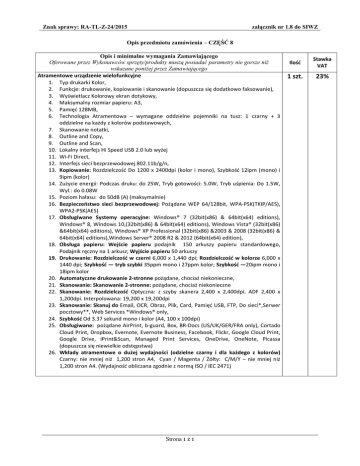 Znak sprawy: RA-TL-Z-24/2015 załącznik nr 1.8 do SIWZ Opis przedmiotu zamówienia – CZĘŚĆ 8 Opis i minimalne wymagania Zamawiającego Oferowane przez Wykonawców sprzęty/produkty muszą posiadać parametry nie gorsze niż wskazane poniżej przez Zamawiającego Atramentowe urządzenie wielofunkcyjne 1. Typ drukarki Kolor, 2. Funkcje: drukowanie, kopiowanie i skanowanie (dopuszcza się dodatkowo faksowanie), 3. Wyświetlacz Kolorowy ekran dotykowy, 4. Maksymalny rozmiar papieru: A3, 5. Pamięć 128MB, 6. Technologia Atramentowa – wymagane oddzielne pojemniki na tusz: 1 czarny + 3 oddzielne na każdy z kolorów podstawowych, 7. Skanowanie notatki, 8. Outline and Copy, 9. Outline and Scan, 10. Lokalny interfejs Hi Speed USB 2.0 lub wyżej 11. Wi-Fi Direct, 12. Interfejs sieci bezprzewodowej 802.11b/g/n, 13. Kopiowanie: Rozdzielczość Do 1200 x 2400dpi (kolor i mono), Szybkość 12ipm (mono) i 9ipm (kolor) 14. Zużycie energii: Podczas druku: do 25W, Tryb gotowości: 5.0W, Tryb uśpienia: Do 1.5W, Wył.: do 0.08W 15. Poziom hałasu: do 50dB (A) (maksymalnie) 16. Bezpieczeństwo sieci bezprzewodowej: Pożądane WEP 64/128bit, WPA-PSK(TKIP/AES), WPA2-PSK(AES) 17. Obsługiwane Systemy operacyjne: Windows® 7 (32bit(x86) & 64bit(x64) editions), Windows® 8, Windows 10,(32bit(x86) & 64bit(x64) editions), Windows Vista® (32bit(x86) &64bit(x64) editions), Windows® XP Professional (32bit(x86) &2003 & 2008 (32bit(x86) & 64bit(x64) editions),Windows Server® 2008 R2 & 2012 (64bit(x64) edition), 18. Obsługa papieru: Wejście papieru podajnik 150 arkuszy papieru standardowego, Podajnik ręczny na 1 arkusz; Wyjście papieru 50 arkuszy 19. Drukowanie: Rozdzielczość w czerni 6,000 x 1,440 dpi; Rozdzielczość w kolorze 6,000 x 1440 dpi; Szybkość — tryb szybki 35ppm mono i 27ppm kolor; Szybkość —20ipm mono i 18ipm kolor 20. Automatyczne drukowanie 2-stronne pożądane, chociaż niekonieczne, 21. Skanowanie: Skanowanie 2-stronne: pożądane, chociaż niekonieczne 22. Skanowanie: Rozdzielczość Optyczna: z szyby skanera 2,400 x 2,400dpi. ADF 2,400 x 1,200dpi. Interpolowana: 19,200 x 19,200dpi 23. Skanowanie: Skanuj do Email, OCR, Obraz, Plik, Card, Pamięć USB, FTP, Do sieci*,Serwer pocztowy**, Web Services *Windows® only, 24. Szybkość Od 3.37 sekund mono i kolor (A4, 100 x 100dpi) 25. Obsługiwane: pożądane AirPrint, b-guard, Box, BR-Docs (US/UK/GER/FRA only), Cortado Cloud Print, Dropbox, Evernote, Evernote Business, Facebook, Flickr, Google Cloud Print, Google Drive, iPrint&Scan, Managed Print Services, OneDrive, OneNote, Picassa (dopuszcza się niewielkie odstępstwa) 26. Wkłady atramentowe o dużej wydajności (odzielne czarny i dla każdego z kolorów) Czarny: nie mniej niż 1,200 stron A4, Cyan / Magenta / Żółty: C/M/Y – nie mniej niż 1,200 stron A4. (Wydajność obliczana zgodnie z normą ISO / IEC 2471) Strona 1 z 1 Ilość Stawka VAT 1 szt. 23%