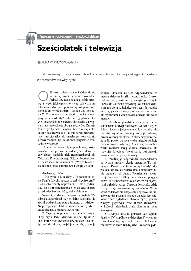 Razem z rodzicami i Êrodowiskiem SzeÊciolatek i telewizja n ALINA WIÂNIEWSKA (Gdaƒsk) Jak mo˝emy przygotowaç dziecko szeÊcioletnie do racjonalnego korzystania z programów telewizyjnych? O dbiornik telewizyjny w ka˝dym domu to dzisiaj rzecz zupe∏nie normalna. Jednak czy rodzice zdajà sobie spraw´ z tego, jaki wp∏yw wywiera telewizja na m∏odego widza, jeÊli przesiaduje on przed odbiornikiem wiele godzin i oglàda „co popadnie?” Czy telewizja przynosi dziecku wi´cej po˝ytku, czy szkody? Zabroniç oglàdania telewizji oczywiÊcie nie mo˝na, chocia˝by z uwagi na prac´ zawodowà obojga rodziców. Zresztà to nie by∏oby dobre wyjÊcie. Mo˝e raczej nale˝a∏oby zastanowiç si´, jak ju˝ teraz przygotowaç szeÊciolatka do màdrego korzystania z mass mediów, by umia∏ on w przysz∏oÊci rozsàdnie wybieraç. Aby zorientowaç si´ w problemie, postanowi∏am przeprowadziç ankiet´ wÊród rodziców dzieci szeÊcioletnich ucz´szczajàcych do Oddzia∏u Przedszkolnego Szko∏y Podstawowej nr 17 w Gdaƒsku. Ankieta pt. „Wp∏yw telewizji na dziecko” by∏a anonimowa i obj´∏a 36 osób. Analiza wyników 1. Na pytanie 1. ankiety: „Ile godzin dziennie Pani/a dziecko sp´dza przed telewizorem?” – 23 osoby poda∏y odpowiedê – 3 do 4 godzin, a 13 osób odpowiedzia∏o, ˝e ich dziecko sp´dza przed telewizorem 1-2 godziny dziennie. Wariant, ˝e dziecko w ogóle nie oglàda TV lub oglàda jà wi´cej ni˝ 4 godziny dziennie, nie zosta∏ podkreÊlony przez ˝adnego z rodziców. Niepokojàcy jest fakt, ˝e szeÊciolatki zbyt du˝o czasu sp´dzajà przed telewizorem. 2. Czytajàc odpowiedzi na pytanie drugie: „Czy czyta Pan/i dziecku ksià˝ki (jakie)?” chcia∏am zorientowaç si´, czy rodzice doceniajà rol´ ksià˝ki i czy znajdujà czas, aby czytaç jà 304 WYCHOWANIE W PRZEDSZKOLU swojemu dziecku. 12 osób odpowiedzia∏o, ˝e czytajà dziecku ksià˝ki, jednak tylko 6 osób poda∏o tytu∏y ostatnio przeczytanych bajek. Pozosta∏e 24 osoby przyzna∏y, ˝e ksià˝ek dzieciom nie czytajà. Âwiadczy to o tym, ˝e rodzice nie zdajà sobie sprawy, jak wielkie znaczenie dla wyobraêni i wra˝liwoÊci dziecka ma tekst czytany. 3. Podobnie przedstawia si´ sytuacja ze s∏uchaniem audycji radiowych. Okazuje si´, ˝e dzieci s∏uchajà jedynie muzyki, a rodzice nie potrafià wymieniç ˝adnej audycji radiowej przeznaczonej dla dzieci. Nale˝y przypuszczaç, ˝e radio powoli zatraca wielkà niegdyÊ funkcj´ poznawczo-dydaktycznà. A szkoda, bo s∏uchowiska radiowe majà wielkie znaczenie dla rozwoju dzieci´cej wyobraêni, wzbogacajà s∏ownictwo, uczà i wychowujà. 4. Analizujàc odpowiedzi respondentów na pytanie ankiety: „Jakie programy TV lubi oglàdaç Pana/i dziecko – podaj 2 tytu∏y”, dowiedzia∏am si´, ˝e rodzice znajà programy, jakie oglàdajà ich dzieci. Wymieniajà najcz´Êciej: dobranocki, filmy przyrodnicze, przygodowe. 21 osób stwierdzi∏o, ˝e ich dzieci najcz´Êciej oglàdajà kana∏ Cartoon Network, gdzie bez przerwy emitowane sà kreskówki. Wi´kszoÊç rodziców nie zdaje sobie sprawy, jak negatywne dla psychiki ma∏ego dziecka jest wielogodzinne oglàdanie chaotycznych, pozbawionych g∏´bszych treÊci filmów-kreskówek, w których niejednokrotnie dominujà sceny agresywne. 5. Zadajàc kolejne pytanie: „Co oglàda Pan/i w TV wspólnie z dzieckiem?” chcia∏am zorientowaç si´, czy dziecko, majàc obok siebie rodziców, mo˝e w ka˝dej chwili zadawaç pyta5/2003 Razem z rodzicami i Êrodowiskiem nia dotyczàce treÊci programu. 11 respondentów odpowiedzia∏o, ˝e cz´sto oglàda z dzieckiem TV, reszta rodziców – ˝e niestety nie. 6. Zaskoczy∏a mnie odpowiedê rodziców na pytanie 6: „Czy zdarza si´, ˝e dziecko oglàda TV po godzinie 20.00?” Okaza∏o si´, ˝e moje szeÊciolatki oglàdajà program telewizyjny po WiadomoÊciach. Na 36 dzieci ucz´szczajàcych do zerówki, 27 cz´sto oglàda filmy emitowane po godzinie 20.00. Stwarza to niebezpieczeƒstwo oglàdania scen niedostosowanych do wieku dziecka. 7. Wspólny niedzielny obiad jest okazjà do rozmowy z dzieçmi, co znacznie przyczynia si´ do zacieÊnienia wi´zi rodzinnych. Co zrobiç, jeÊli niedzielne popo∏udnie sp´dzamy przed telewizorem? Odpowiedzi rodziców na pytanie ankiety „Jak najcz´Êciej sp´dzasz niedzielne popo∏udnie?” wskaza∏y, ˝e zamiast poÊwi´ciç wolny czas sprawom rodziny, zacieÊnianiu wzajemnych wi´zi (26 osób) ca∏a rodzina oglàda TV, rozmawiajàc jednoczeÊnie o bie˝àcych sprawach domowych. Tylko 10 osób wyrusza z rodzinà na niedzielny spacer, idzie z wizytà do znajomych lub bliskich, lub bawi si´ z dzieckiem. Z odpowiedzi na ankiet´ wynika, ˝e nasze szeÊciolatki zbyt d∏ugo oglàdajà TV, cz´sto zdarza si´, ˝e oglàdajà filmy nawet po godzinie 20.00. Majà coraz rzadszy kontakt z ksià˝kà, nie s∏uchajà audycji radiowych, rodzice nie kupujà i nie czytajà im czasopism. Siedzàc przed ekranem TV, ma∏y odbiorca jest pozostawiony sam sobie, samotnie prze˝ywa oglàdane treÊci, co nara˝a go na pojawienie si´ negatywnych emocji. Dzieci nie uczà si´ od rodziców sposobów racjonalnego sp´dzania czasu wolnego. Analizujàc wyniki ankiety, postanowi∏am zapoznaç rodziców z treÊcià opracowanego 5/2003 przeze mnie referatu pt. Miejsce i rola telewizji w procesie wychowania dziecka we wspó∏czesnej rodzinie, aby wspólnie omówiç zagro˝enia p∏ynàce z niew∏aÊciwego korzystania z mass mediów. Wraz z rodzicami chcia∏am zastanowiç si´, co robiç, aby uchroniç szeÊcioletnie dziecko przed wynikajàcymi stàd zagro˝eniami i jak przygotowaç przysz∏ego odbiorc´ do racjonalnego korzystania z tego medium. Jak mo˝emy przygotowaç dziecko szeÊcioletnie do racjonalnego korzystania z TV? Oto wyniki wspólnych przemyÊleƒ: • Obserwuj uwa˝nie swoje dziecko. • Rozwijaj dzieci´ce zdolnoÊci i zainteresowania (pozwól mu w domu rysowaç, malowaç, lepiç z plast