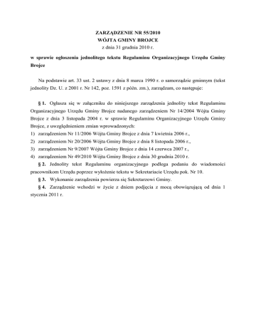 ZARZĄDZENIE NR 55/2010 WÓJTA GMINY BROJCE z dnia 31 grudnia 2010 r. w sprawie ogłoszenia jednolitego tekstu Regulaminu Organizacyjnego Urzędu Gminy Brojce Na podstawie art. 33 ust. 2 ustawy z dnia 8 marca 1990 r. o samorządzie gminnym (tekst jednolity Dz. U. z 2001 r. Nr 142, poz. 1591 z późn. zm.), zarządzam, co następuje: § 1. Ogłasza się w załączniku do niniejszego zarządzenia jednolity tekst Regulaminu Organizacyjnego Urzędu Gminy Brojce nadanego zarządzeniem Nr 14/2004 Wójta Gminy Brojce z dnia 3 listopada 2004 r. w sprawie Regulaminu Organizacyjnego Urzędu Gminy Brojce, z uwzględnieniem zmian wprowadzonych: 1) zarządzeniem Nr 11/2006 Wójta Gminy Brojce z dnia 7 kwietnia 2006 r., 2) zarządzeniem Nr 20/2006 Wójta Gminy Brojce z dnia 8 listopada 2006 r., 3) zarządzeniem Nr 9/2007 Wójta Gminy Brojce z dnia 14 czerwca 2007 r., 4) zarządzeniem Nr 49/2010 Wójta Gminy Brojce z dnia 30 grudnia 2010 r. § 2. Jednolity tekst Regulaminu organizacyjnego podlega podaniu do wiadomości pracownikom Urzędu poprzez wyłożenie tekstu w Sekretariacie Urzędu pok. Nr 10. § 3. Wykonanie zarządzenia powierza się Sekretarzowi Gminy. § 4. Zarządzenie wchodzi w życie z dniem podjęcia z mocą obowiązującą od dnia 1 stycznia 2011 r. SCHEMAT ORGANIZACYJNY URZĘDU GMINY W BROJCACH RADA GMINY WÓJT GMINY SKARBNIK GMINY (Gł. Księgowy budżetu) budżet podatki i opłaty mienie gminne STANOWISKO DS. funduszy zewnętrznych wdrażania i realizacji projektów promocji gminy STANOWISKO DS. ewidencji ludności dowodów osobistych spraw wojskowych akcji kurierskiej archiwum urzędu STANOWISKO DS. obrony cywilnej gospodarki komunalnej ochrony środowiska ochrony p.pożarowej kultury fizycz. i sportu STANOWISKO DS. rolnictwa gospodarki nieruchomościami gospodarki mieszkaniowej planowania przestrzennego SEKRETARZ GMINY STANOWISKO DS. obsługi rady gminy współpracy z sołectwami dodatków mieszkaniowych STANOWISKO DS. kancelarii urzędu skarg i wniosków działalności gospodarczej STANOWISKO DS. inwestycji remontów zamówień publicznych STANOWISKO DS. dróg publicznych pac interwencyjnych umów zleceń STANOWISKO DS. informatycznych podatków od środków transportu obsługi BIP administratora bezpieczeństwa informacji GMINNA BIBLIOTEKA PUBLICZNA W BROJCACH GMINNY OŚRODEK POMOCY SPOŁECZNEJ W BROJCACH GIMNAZJUM PUBLICZNE W BROJCACH SZKOŁA PODSTAWOWA W BROJCACH Z FILIĄ W DARGOSŁAWIU PION OCHRONY INFORMACJI NIEJAWNYCH pełnomocnik ochrony informacji niejawnych kierownik kancelarii tajnej