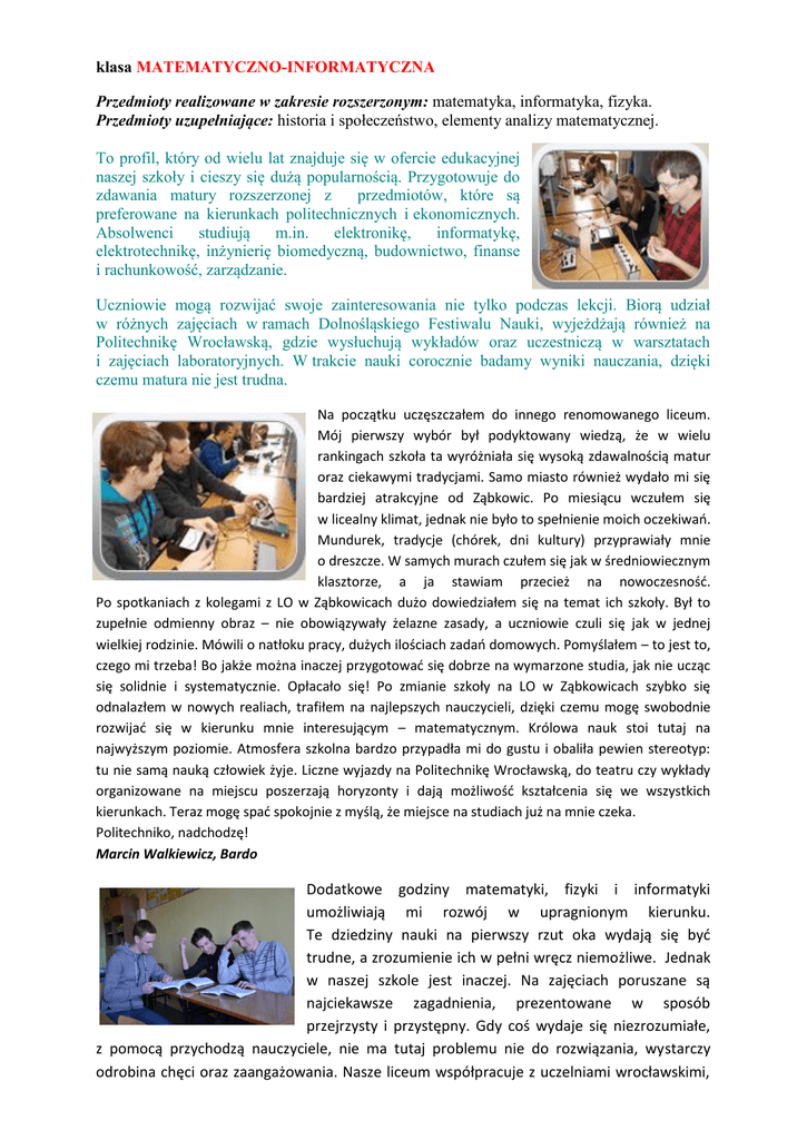 klasa MATEMATYCZNO-INFORMATYCZNA Przedmioty realizowane w zakresie rozszerzonym: matematyka, informatyka, fizyka. Przedmioty uzupełniające: historia i społeczeństwo, elementy analizy matematycznej. To profil, który od wielu lat znajduje się w ofercie edukacyjnej naszej szkoły i cieszy się dużą popularnością. Przygotowuje do zdawania matury rozszerzonej z przedmiotów, które są preferowane na kierunkach politechnicznych i ekonomicznych. Absolwenci studiują m.in. elektronikę, informatykę, elektrotechnikę, inżynierię biomedyczną, budownictwo, finanse i rachunkowość, zarządzanie. Uczniowie mogą rozwijać swoje zainteresowania nie tylko podczas lekcji. Biorą udział w różnych zajęciach w ramach Dolnośląskiego Festiwalu Nauki, wyjeżdżają również na Politechnikę Wrocławską, gdzie wysłuchują wykładów oraz uczestniczą w warsztatach i zajęciach laboratoryjnych. W trakcie nauki corocznie badamy wyniki nauczania, dzięki czemu matura nie jest trudna. Na początku uczęszczałem do innego renomowanego liceum. Mój pierwszy wybór był podyktowany wiedzą, że w wielu rankingach szkoła ta wyróżniała się wysoką zdawalnością matur oraz ciekawymi tradycjami. Samo miasto również wydało mi się bardziej atrakcyjne od Ząbkowic. Po miesiącu wczułem się w licealny klimat, jednak nie było to spełnienie moich oczekiwań. Mundurek, tradycje (chórek, dni kultury) przyprawiały mnie o dreszcze. W samych murach czułem się jak w średniowiecznym klasztorze, a ja stawiam przecież na nowoczesność. Po spotkaniach z kolegami z LO w Ząbkowicach dużo dowiedziałem się na temat ich szkoły. Był to zupełnie odmienny obraz – nie obowiązywały żelazne zasady, a uczniowie czuli się jak w jednej wielkiej rodzinie. Mówili o natłoku pracy, dużych ilościach zadań domowych. Pomyślałem – to jest to, czego mi trzeba! Bo jakże można inaczej przygotować się dobrze na wymarzone studia, jak nie ucząc się solidnie i systematycznie. Opłacało się! Po zmianie szkoły na LO w Ząbkowicach szybko się odnalazłem w nowych realiach, trafiłem na najlepszych nauczycieli, dzięki czemu mogę swobodnie rozwijać się w kierunku mnie interesującym – matematycznym. Królowa nauk stoi tutaj na najwyższym poziomie. Atmosfera szkolna bardzo przypadła mi do gustu i obaliła pewien stereotyp: tu nie samą nauką człowiek żyje. Liczne wyjazdy na Politechnikę Wrocławską, do teatru czy wykłady organizowane na miejscu poszerzają horyzonty i dają możliwość kształcenia się we wszystkich kierunkach. Teraz mogę spać spokojnie z myślą, że miejsce na studiach już na mnie czeka. Politechniko, nadchodzę! Marcin Walkiewicz, Bardo Dodatkowe godziny matematyki, fizyki i informatyki umożliwiają mi rozwój w upragnionym kierunku. Te dziedziny nauki na pierwszy rzut oka wydają się być trudne, a zrozumienie ich w pełni wręcz niemożliwe. Jednak w naszej szkole jest inaczej. Na zajęciach poruszane są najciekawsze zagadnienia, prezentowane w sposób przejrzysty i przystępny. Gdy coś wydaje się niezrozumiałe, z pomocą przychodzą nauczyciele, nie ma tutaj problemu nie do rozwiązania, wystarczy odrobina chęci oraz zaangażowania. Nasze liceum współpracuje z uczelniami wrocławskimi, często organizowane są tematyczne wyjazdy na wykłady. Umożliwia to podjęcie decyzji dotyczącej kolejnego etapu nauczania. Jestem bardzo zadowolony z dotychczasowych postępów, profil matematyczno-informatyczny kompleksowo przygotowuje do studiowania na najlepszych uczelniach w całej Polsce. Nie świadczą o tym wyłącznie bardzo wysokie wyniki matur, a również opinie absolwentów. Robert Mulka, Ząbkowice Śląskie Kiedy zapisywałam się do naszego ogólniaka, miałam mnóstwo wątpliwości, czy wybrałam dobrą klasę. Szybko okazało się, że niepotrzebnie. W przyszłości pragnę kontynuować naukę na politechnice, a dzięki profilowi matematyczno-informatycznemu jestem coraz bliżej realizacji mojego marzenia. Mamy o wiele więcej matematyki w programie niż poprzednie pokolenia, dzięki czemu dokładnie ćwiczymy zadania z poszczególnych działów i każdy uczeń jest w stanie go na spokojnie „ogarnąć”. Mój profil oferuje także rozszerzoną informatykę i fizykę. Jak dobrze wiemy, te przedmioty nie należą do najlżejszych, dlatego jest to duże ułatwienie. Jeżeli i Ty marzysz o studiach na kierunkach ścisłych, to radzę się nie zastanawiać dłużej, bo to naprawdę dobra inwestycja w przyszłość. Izabela Czepieruk, Grochowa Od drugiego roku nauki wybrany profil pozwala skupić się na tym, co skłoniło Cię do wyboru klasy matematyczno-informatycznej. Dominuje przeważająca ilość matematyki, fizyki oraz zajęć informatycznych, co pozwala nam dokładniej skupić się na profilowanym kierunku, a to ogromny plus. Większość przedmiotów przyrodniczych i humanistycznych, które nas ścisłowców nie kręcą, zostawiamy za sobą po pierwszej klasie. Mat.-inf. to oczywiście nie tylko nauka w murach szkoły. Mamy możliwość wyjazdów na uczelnie wyższe, gdzi e dodatkowo możemy poszerzać swoją wiedzę i doświadczenie w otoczeniu studentów oraz wykładowców. Przykładowo, jako uczeń naszego profilu masz możliwość uczestnictwa w wykładach Studium Talent, prowadzonych przez Politechnikę Wrocławską, dotyczących matematyki bądź fizyki. Takie zajęcia zakończone pozytywnie zdanym testem owocują dodatkowymi punktami, zwiększającymi wskaźnik rekrutacyjny, czyli szansę dostania się na wymarzony kierunek studiów, a nawet zapewniają gotowy indeks danego wydziału. O takie bonusy trudno w innych klasach. Nauka to dopiero jedna strona medalu. Mamy również sporo chwil wolnych. Oprócz czasu dla siebie czy na spotkania ze znajomymi znajdujemy wystarczającą jego ilość, aby poświęcić go innym. Nic nie stoi na przeszkodzie, by rozpocząć pracę wolontariusza na rzecz Domu Dziecka „Jutrzenka” w Bardz