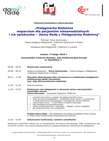 PROGRAM KONFERENCJI SZKOLENIOWEJ „Pielęgniarka Rodzinna wsparciem dla pacjentów niesamodzielnych i ich opiekunów – Damy Radę z Pielęgniarką Rodzinną” Patronat: Maria Stachowska Prezes Kolegium Pielęgniarek i Położnych Rodzinnych w Polsce oraz Okręgowa Izba Pielęgniarek i Położnych w Lesznie Leszno, 4 lutego 2015 r. Leszczyńskie Centrum Biznesu, sala konferencyjna Europa ul. Geodetów 1 08.00 – 09.00 Rejestracja uczestników 09.00 – 09.10 Otwarcie konferencji – Maria Stachowska – Prezes Kolegium Pielęgniarek i Położnych Rodzinnych w Polsce 09.10 – 11.00 Aktualnie obowiązujące akty normatywne w działalności pielęgniarki podstawowej opieki zdrowotnej mec. Olga Wawrzynkiewicz-Jabłońska 11.00 – 11.30 Przerwa kawowa 11.30 – 15.30 Edukacyjna rola pielęgniarki w domowej opiece nad pacjentem przewlekle chorym Iwona Głowacka – Konsultant Medyczny TZMO SA • • • • • • wyzwania dla rodziny w opiece nad osobą przewlekle chorą nowe uprawnienia pielęgniarki – wypełnienie druku zleceń na zaopatrzenie w środki pomocnicze przysługujące comiesięcznie (wyroby chłonne) nietrzymanie moczu – 3 kroki doboru produktu chłonnego ABC profilaktyki przeciwodleżynowej zasady bezpiecznej pracy z pacjentem – dbałość o zdrowy kręgosłup jak skutecznie leczyć rany przewlekłe? Projekt Damy Radę – Jak opiekować się osobą przewlekle chorą w domu (w trakcie bloku tematycznego przewidziana jest przerwa) 15.30 – 16.00 Zakończenie konferencji, rozdanie certyfikatów Rejestracja uczestników odbywa się za pośrednictwem formularza internetowego, który zamieszczony jest na stronie Fundacji www.razemzmieniamyswiat.pl w zakładce EDUKACJA, Konferencje dla pielęgniarek. Fundacja "Razem Zmieniamy Świat", ul. Żółkiewskiego 20/26, 87-100 Toruń, Polska, tel. (+48) 56 612 32 93 NIP: 879 266 72 14 www.razemzmieniamyswiat.pl www.damy-rade.info