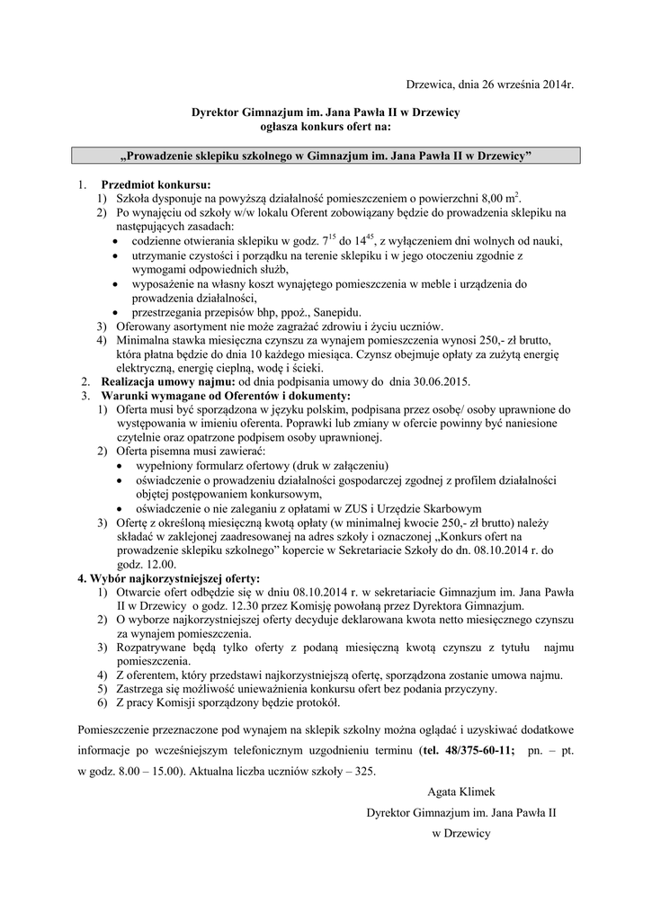 Drzewica, dnia 26 września 2014r. Dyrektor Gimnazjum im. Jana Pawła II w Drzewicy ogłasza konkurs ofert na: „Prowadzenie sklepiku szkolnego w Gimnazjum im. Jana Pawła II w Drzewicy” 1. Przedmiot konkursu: 1) Szkoła dysponuje na powyższą działalność pomieszczeniem o powierzchni 8,00 m2. 2) Po wynajęciu od szkoły w/w lokalu Oferent zobowiązany będzie do prowadzenia sklepiku na następujących zasadach: codzienne otwierania sklepiku w godz. 715 do 1445, z wyłączeniem dni wolnych od nauki, utrzymanie czystości i porządku na terenie sklepiku i w jego otoczeniu zgodnie z wymogami odpowiednich służb, wyposażenie na własny koszt wynajętego pomieszczenia w meble i urządzenia do prowadzenia działalności, przestrzegania przepisów bhp, ppoż., Sanepidu. 3) Oferowany asortyment nie może zagrażać zdrowiu i życiu uczniów. 4) Minimalna stawka miesięczna czynszu za wynajem pomieszczenia wynosi 250,- zł brutto, która płatna będzie do dnia 10 każdego miesiąca. Czynsz obejmuje opłaty za zużytą energię elektryczną, energię cieplną, wodę i ścieki. 2. Realizacja umowy najmu: od dnia podpisania umowy do dnia 30.06.2015. 3. Warunki wymagane od Oferentów i dokumenty: 1) Oferta musi być sporządzona w języku polskim, podpisana przez osobę/ osoby uprawnione do występowania w imieniu oferenta. Poprawki lub zmiany w ofercie powinny być naniesione czytelnie oraz opatrzone podpisem osoby uprawnionej. 2) Oferta pisemna musi zawierać: wypełniony formularz ofertowy (druk w załączeniu) oświadczenie o prowadzeniu działalności gospodarczej zgodnej z profilem działalności objętej postępowaniem konkursowym, oświadczenie o nie zaleganiu z opłatami w ZUS i Urzędzie Skarbowym 3) Ofertę z określoną miesięczną kwotą opłaty (w minimalnej kwocie 250,- zł brutto) należy składać w zaklejonej zaadresowanej na adres szkoły i oznaczonej „Konkurs ofert na prowadzenie sklepiku szkolnego” kopercie w Sekretariacie Szkoły do dn. 08.10.2014 r. do godz. 12.00. 4. Wybór najkorzystniejszej oferty: 1) Otwarcie ofert odbędzie się w dniu 08.10.2014 r. w sekretariacie Gimnazjum im. Jana Pawła II w Drzewicy o godz. 12.30 przez Komisję powołaną przez Dyrektora Gimnazjum. 2) O wyborze najkorzystniejszej oferty decyduje deklarowana kwota netto miesięcznego czynszu za wynajem pomieszczenia. 3) Rozpatrywane będą tylko oferty z podaną miesięczną kwotą czynszu z tytułu najmu pomieszczenia. 4) Z oferentem, który przedstawi najkorzystniejszą ofertę, sporządzona zostanie umowa najmu. 5) Zastrzega się możliwość unieważnienia konkursu ofert bez podania przyczyny. 6) Z pracy Komisji sporządzony będzie protokół. Pomieszczenie przeznaczone pod wynajem na sklepik szkolny można oglądać i uzyskiwać dodatkowe informacje po wcześniejszym telefonicznym uzgodnieniu terminu (tel. 48/375-60-11; pn. – pt. w godz. 8.00 – 15.00). Aktualna liczba uczniów szkoły – 325. Agata Klimek Dyrektor Gimnazjum im. Jana Pawła II w Drzewicy OFERTA „Prowadzenie sklepiku szkolnego w Gimnazjum im. Jana Pawła II w Drzewicy” Gimnazjum im. Jana Pawła II w Drzewicy 26-340 Drzewica ul. Szkolna 18 Nawiązując do ogłoszenia o konkursie, zamieszczonego na stronie internetowej Gimnazjum im. Jana Pawła II w Drzewicy, Urzędu Gminy i Miasta w Drzewicy oraz na tablicy ogłoszeń w Gimnazjum Oferujemy: Prowadzenie sklepiku szkolnego w Gimnazjum im. Jana Pawła II w Drzewicy. 1. Oferujemy miesięczny czynsz z tytułu najmu pomieszczenia w wysokości ………………………. zł (brutto) za 1 miesiąc (słownie: ………………………… złotych). 2. Oświadczamy, że projekt umowy został przez nas zaakceptowany bez zastrzeżeń i zobowiązujemy się, w przypadku wyboru naszej oferty, do zawarcia umowy zgodnej z niniejszą ofertą, w miejscu i terminie wyznaczonym przez Zamawiającego. 3. Ofertę niniejszą składamy na ……. kolejno ponumerowanych stronach. 4. Załącznikami do niniejszej oferty są: oświadczenie o spełnianiu warunków udziału w konkursie, zaparafowany projekt umowy. ………………………………………………. Miejscowość, data …………….…………………… podpis(y) osób uprawnionych do reprezentacji oferenta Załącznik nr 1 OŚWIADCZENIE O SPEŁNIANIU WARUNKÓW UDZIAŁU W KONKURSIE Ja ( My) , niżej podpisany (ni) …………………………………………………………..……………….................................... Działając w imieniu i na rzecz: ………………………………………………………………………........................................... ( pełna nazwa oferenta) ………………………………………………………………………………………................... ...................................................................................................................................................... ( adres siedziby oferenta) ………………………………………………………………………………………………. (NIP, Regon) przystępując do konkursu na : „Prowadzenie sklepiku szkolnego w Gimnazjum im. Jana Pawła II w Drzewicy” oświadczam, że: 1) Prowadzę działalność gospodarczą zgodną z profilem działalności objętej postępowaniem konkursowym. 2) Zapoznałem się i akceptuję dokumentację konkursową oraz dokonałem wizji lokalnej. 3) Nie zalegam z opłatami w ZUS i Urzędzie Skarbowym. …………………………..… Miejscowość, data ………………….………………………… podpis(y) osób uprawnionych do reprezentacji oferenta Załącznik nr 2 Projekt umowy UMOWA NAJMU Zawarta w dniu ….. października 2014 r. w Drzewicy pomiędzy: 1. Gimnazjum im. Jana Pawła II w Drzewicy, ul. Szkolna 18, 26-340 Drzewica, NIP: 768183-33-99, reprezentowanym przez Dyrektora Gimnazjum - Panią Agatę Klimek, przy kontrasygnacie Głównego Księgowego Zespołu Ekonomiczno-Administracyjne