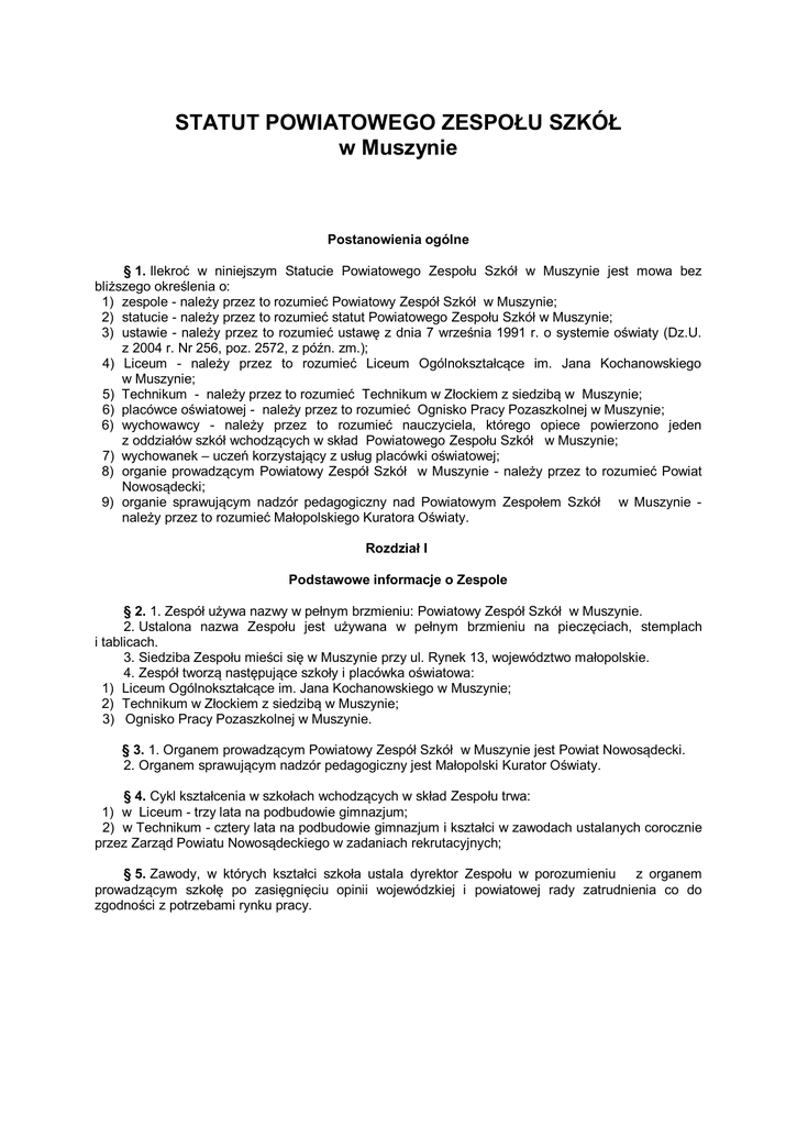 STATUT POWIATOWEGO ZESPOŁU SZKÓŁ w Muszynie Postanowienia ogólne § 1. Ilekroć w niniejszym Statucie Powiatowego Zespołu Szkół w Muszynie jest mowa bez bliższego określenia o: 1) zespole - należy przez to rozumieć Powiatowy Zespół Szkół w Muszynie; 2) statucie - należy przez to rozumieć statut Powiatowego Zespołu Szkół w Muszynie; 3) ustawie - należy przez to rozumieć ustawę z dnia 7 września 1991 r. o systemie oświaty (Dz.U. z 2004 r. Nr 256, poz. 2572, z późn. zm.); 4) Liceum - należy przez to rozumieć Liceum Ogólnokształcące im. Jana Kochanowskiego w Muszynie; 5) Technikum - należy przez to rozumieć Technikum w Złockiem z siedzibą w Muszynie; 6) placówce oświatowej - należy przez to rozumieć Ognisko Pracy Pozaszkolnej w Muszynie; 6) wychowawcy - należy przez to rozumieć nauczyciela, którego opiece powierzono jeden z oddziałów szkół wchodzących w skład Powiatowego Zespołu Szkół w Muszynie; 7) wychowanek – uczeń korzystający z usług placówki oświatowej; 8) organie prowadzącym Powiatowy Zespół Szkół w Muszynie - należy przez to rozumieć Powiat Nowosądecki; 9) organie sprawującym nadzór pedagogiczny nad Powiatowym Zespołem Szkół w Muszynie należy przez to rozumieć Małopolskiego Kuratora Oświaty. Rozdział I Podstawowe informacje o Zespole § 2. 1. Zespół używa nazwy w pełnym brzmieniu: Powiatowy Zespół Szkół w Muszynie. 2. Ustalona nazwa Zespołu jest używana w pełnym brzmieniu na pieczęciach, stemplach i tablicach. 3. Siedziba Zespołu mieści się w Muszynie przy ul. Rynek 13, województwo małopolskie. 4. Zespół tworzą następujące szkoły i placówka oświatowa: 1) Liceum Ogólnokształcące im. Jana Kochanowskiego w Muszynie; 2) Technikum w Złockiem z siedzibą w Muszynie; 3) Ognisko Pracy Pozaszkolnej w Muszynie. § 3. 1. Organem prowadzącym Powiatowy Zespół Szkół w Muszynie jest Powiat Nowosądecki. 2. Organem sprawującym nadzór pedagogiczny jest Małopolski Kurator Oświaty. § 4. Cykl kształcenia w szkołach wchodzących w skład Zespołu trwa: 1) w Liceum - trzy lata na podbudowie gimnazjum; 2) w Technikum - cztery lata na podbudowie gimnazjum i kształci w zawodach ustalanych corocznie przez Zarząd Powiatu Nowosądeckiego w zadaniach rekrutacyjnych; § 5. Zawody, w których kształci szkoła ustala dyrektor Zespołu w porozumieniu z organem prowadzącym szkołę po zasięgnięciu opinii wojewódzkiej i powiatowej rady zatrudnienia co do zgodności z potrzebami rynku pracy. Rozdział II Cele i zadania Zespołu § 6. Zespół realizuje cele i zadania określone w ustawie z dnia 7 września 1991 r. o systemie oświaty oraz przepisach wydanych na jej podstawie, a w szczególności: 1) umożliwia zdobycie wiedzy i umiejętności niezbędnych do uzyskania świadectwa ukończenia szkoły; 2) umożliwia zdobycie wiedzy i umiejętności niezbędnych do uzyskania dyplomu potwierdzającego kwalifikacje zawodowe po zdaniu egzaminu; 3) umożliwia uzyskanie świadectwa dojrzałości po zdaniu egzaminu maturalnego; 4) umożliwia absolwentom dokonanie świadomego wyboru dalszego kształcenia; 5) wdraża uczniów do odpowiedzialnego wykonywania pracy zawodowej i rozumienia jej roli w procesie społeczno-gospodarczym; 6) dostosowuje kierunki i treści kształcenia do wymogów rynku pracy; 7) współpracuje z placówkami szkolenia zawodowego, z urzędami pracy i pracodawcami, placówkami oświatowo-wychowawczymi oraz zakładami opieki zdrowotnej, 8) stwarza warunki do rozwoju zainteresowań i uzdolnień uczniów przez organizowanie zajęć pozalekcyjnych i pozaszkolnych oraz kształtuje aktywność społeczną i kształtuje umiejętności spędzania wolnego czasu, 9) organizuje przeglądy, wystawy, konkursy i zawody, 10) organizuje zajęcia stałe, okresowe i okazjonalne, wynikające z potrzeb środowiska lokalnego. § 7. 1. Cele i zadania Zespołu wynikające z przepisów prawa oraz uwzględniające Program Wychowawczy Zespołu, a także Szkolny Program Profilaktyki dostosowany do potrzeb rozwojowych uczniów oraz potrzeb środowiska są następujące: 1) Zespół umożliwia uczniom podtrzymanie tożsamości religijnej poprzez naukę religii zgodnie z przepisami Ministerstwa Edukacji Narodowej, tożsamości narodowej przez zwrócenie szczególnej uwagi na kulturę narodową, poprawne posługiwanie się językiem polskim; 2) Zespół udziela uczniom i rodzicom pomocy psychologicznej i pedagogicznej poprzez współpracę z Powiatową Poradnią Psychologiczno-Pedagogiczną w Nowym Sączu Filia w Krynicy Zdroju, 3) Zespół wspomaga wychowawczą rolę rodziny przez zebrania i indywidualne rozmowy z rodzicami; 4) Zespół umożliwia rozwijanie zainteresowań uczniów oraz odpowiedni dobór treści programowych na zajęciach edukacyjnych, zajęciach praktycznych, wycieczkach, spotkaniach z ciekawymi ludźmi i poprzez indywidualną pracę nauczycieli z uczniami; 5) Zespół upowszechnia wiedzę ekologiczną i propaguje problemy ochrony środowiska realizując treści programowe podczas zajęć edukacyjnych; 6) Zespół kształtuje postawy patriotyczne, uczy tolerancji i szacunku dla innych; 7) Zespół pomaga w kształtowaniu systemów wartości, dokonywaniu właściwych wyborów i pełnienia właściwych ról społecznych w dorosłym życiu; 8) Zespół uświadamia uczniom konieczność ciągłego doskonalenia się, kształcenia i pogłębiania wiedzy; 9) Zespół współpracuje ze środowiskiem lokalnym i rodzicami uczniów; 10) Zespół dba o bezpieczeństwo uczniów, podejmując działania zapobiegające agresji i przemocy w szkole; 11) Zespół dba o zdrowie uczniów poprzez uświadamianie zagrożeń wynikających z uzależnień, współpracując z Powiatową Poradnią Psychologiczno-Pedagogiczną w Nowym Sączu, Miejską Komendą Policji w Nowym Sączu i pielęgniarką szkolną. 2. W zakresie pracy wychowawczej nauczyciele wspierają zadania wychowawcze rodziców tak, aby umożliwiać uczniom prz